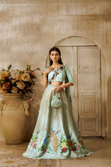 Description:-This intricately hand-painted lehnga donned in luxurious sequence work paired with a burst of three-dimensional hand-embellished...