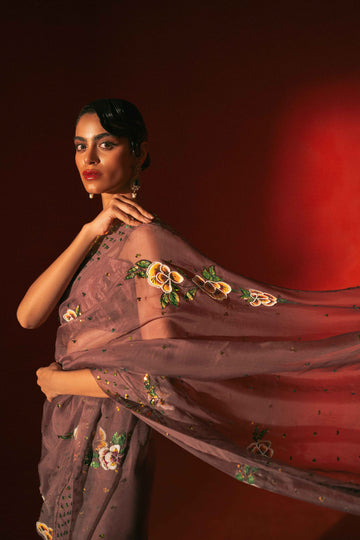 Description: Introducing 'Iris,' a saree that speaks the language of regal purple. Hand-painted with meticulous care...