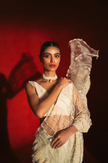 Description: “Uns اُنس” is that perfect pearl white silhouette composed of Resham, beads, cutdana and...