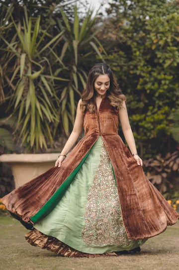 Description: Our velvet rustic gown is paired with a green lehenga embroidered using dapaka and...
