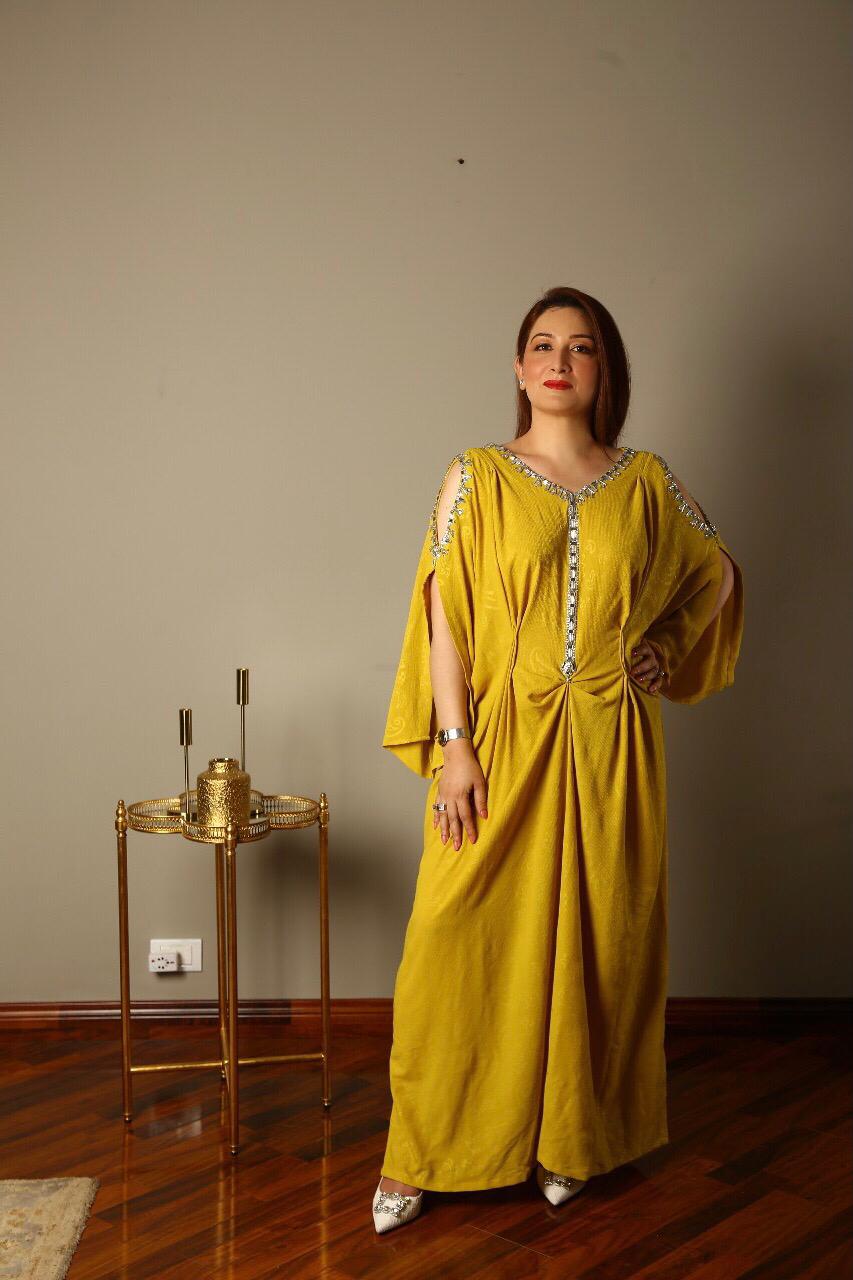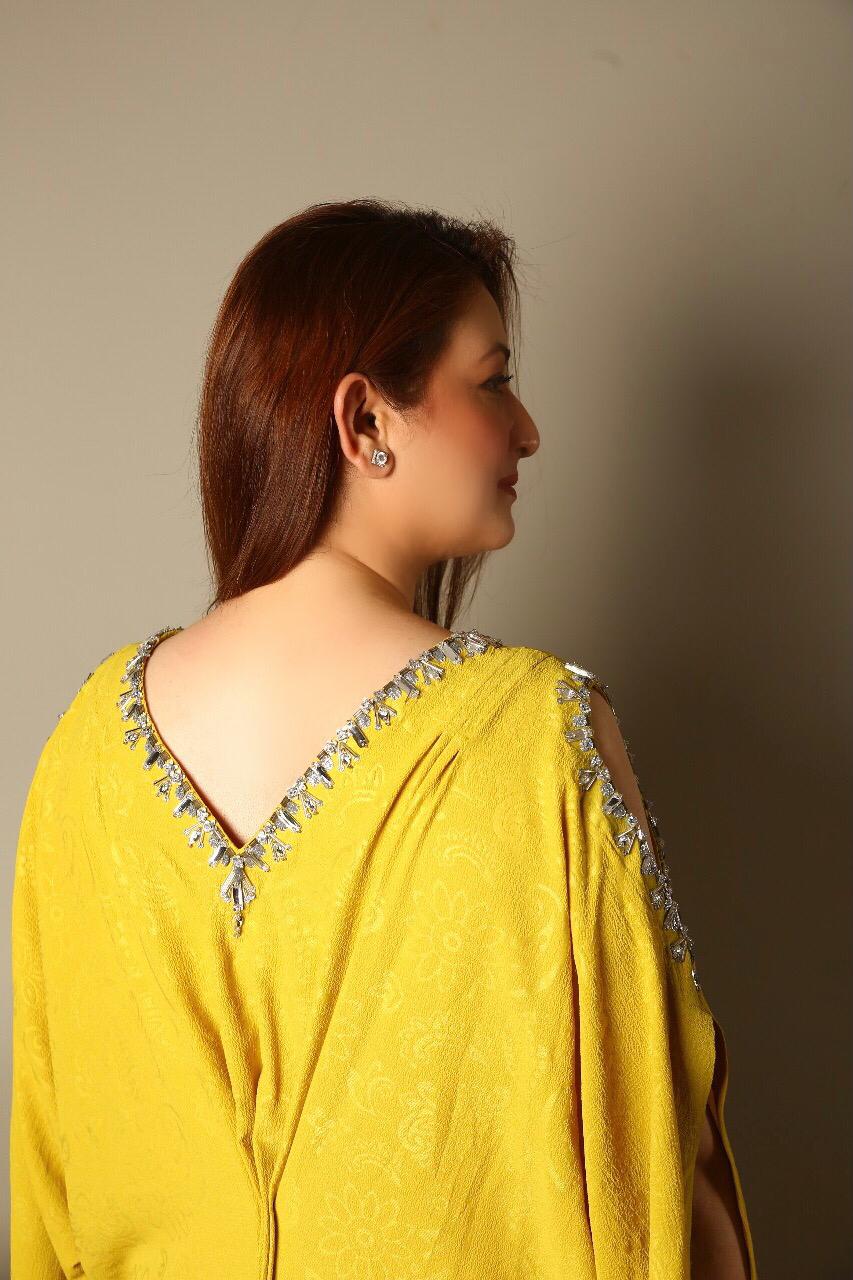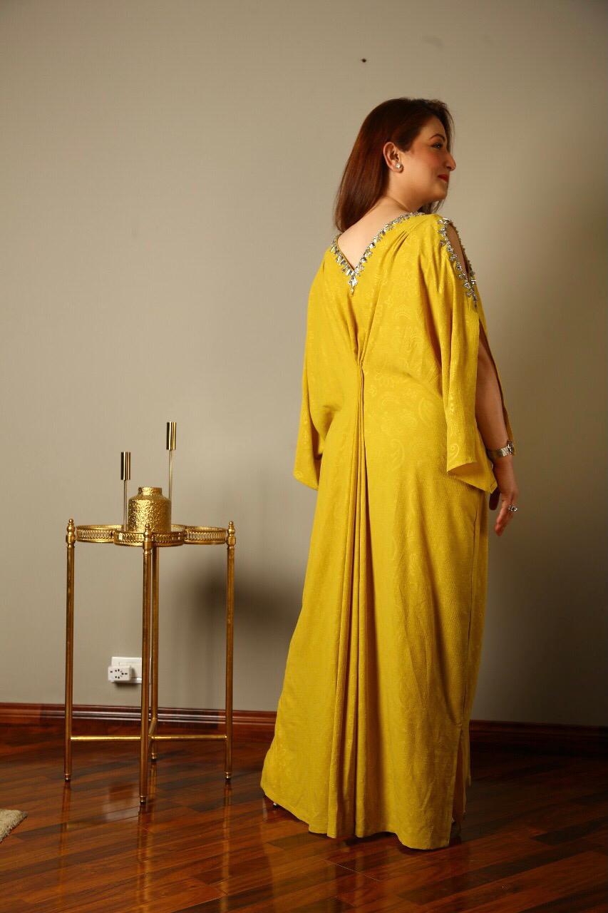 Description: Best Luxury Pret Dresses is mustard yellow Georgette kaftan beautifully bejeweled in crystals and stones.
