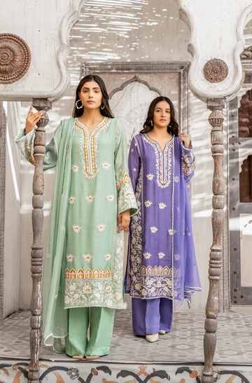 Description: An exquisite artwork shirt and shalwar, traditionally crafted with intricate tilla embroidery and elevated...