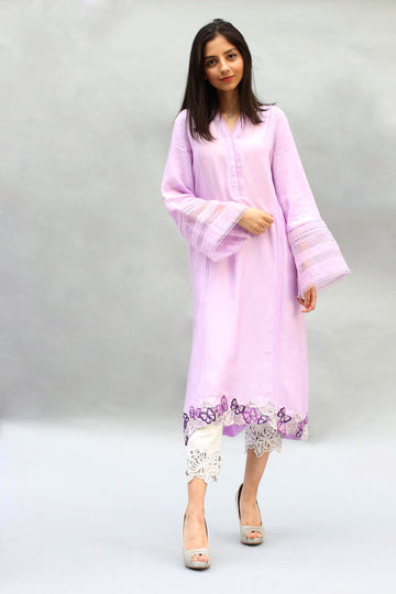 Shirt: Cotton Net Lavender Kurta intricately embroidered with resham ombre butterflies, detailed with organza and...
