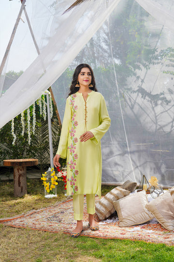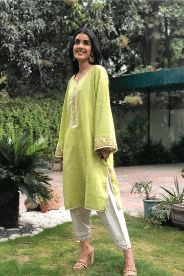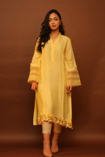 Description: Lime Yellow Kurta intricately embroidered with resham ombre butterflies, detailed with organza and lace...