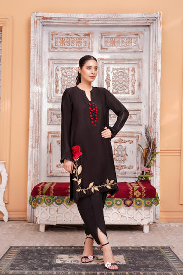 Description: The best luxury pret dress has a black regular-fit kurta with traditional Aari work embroidery...