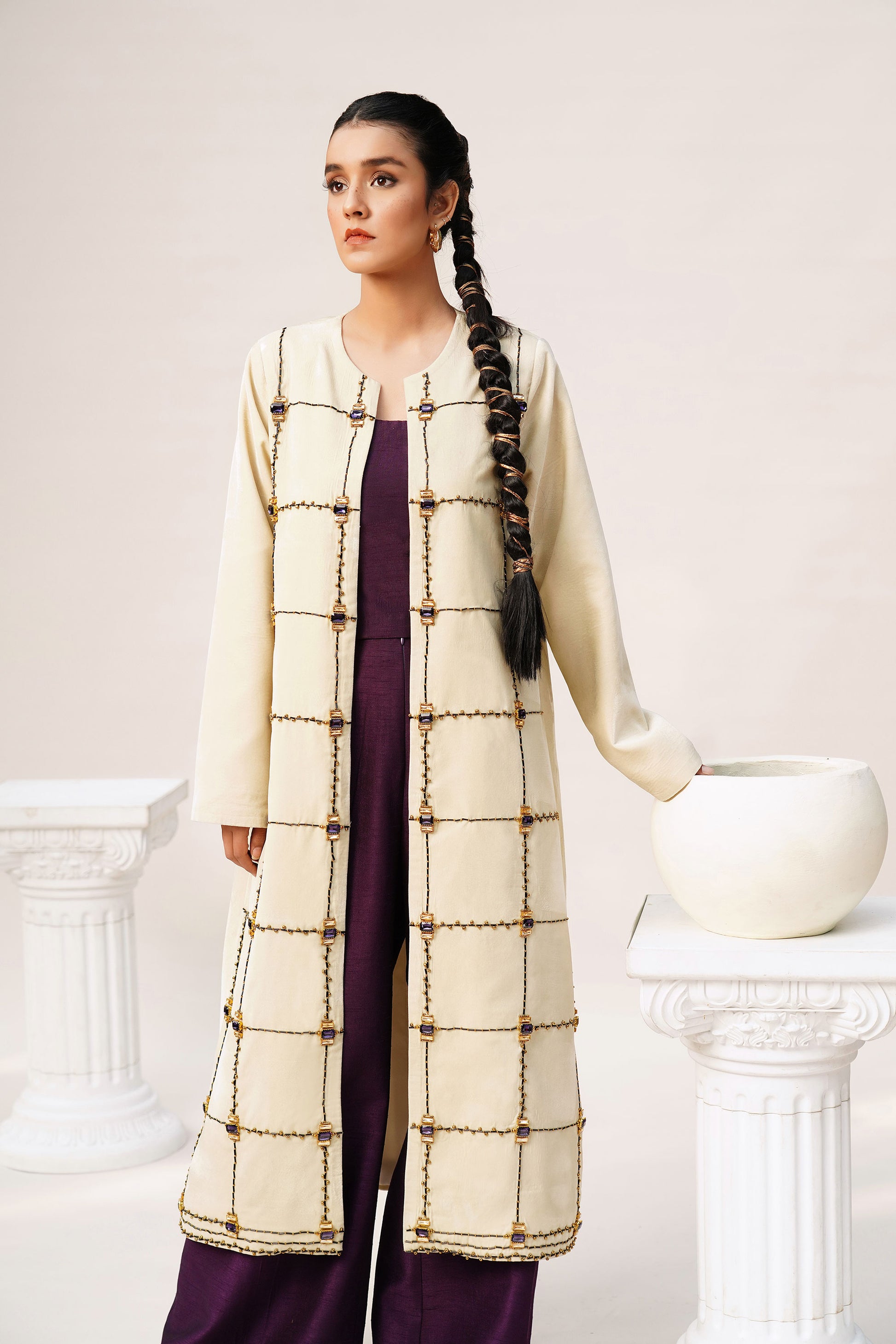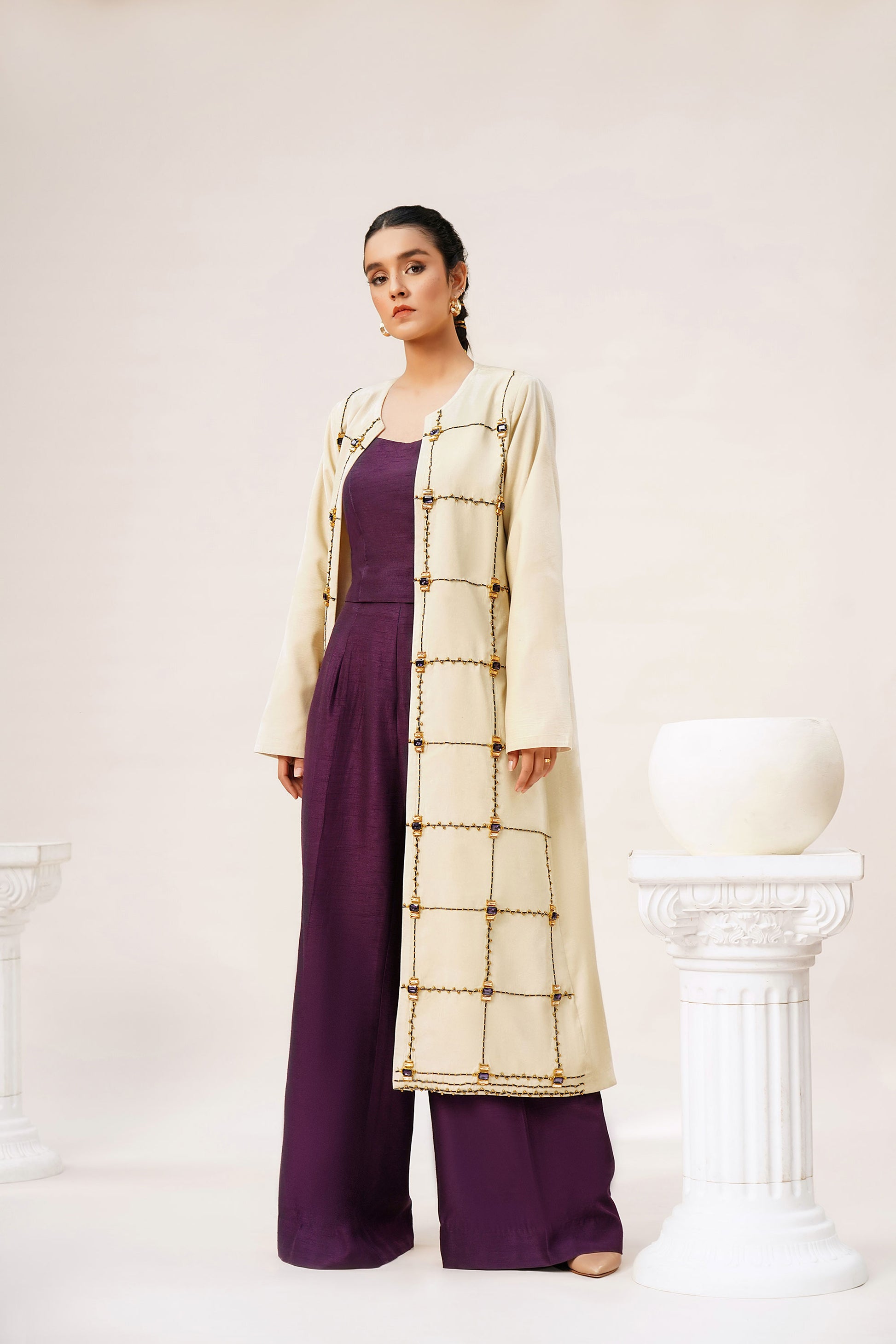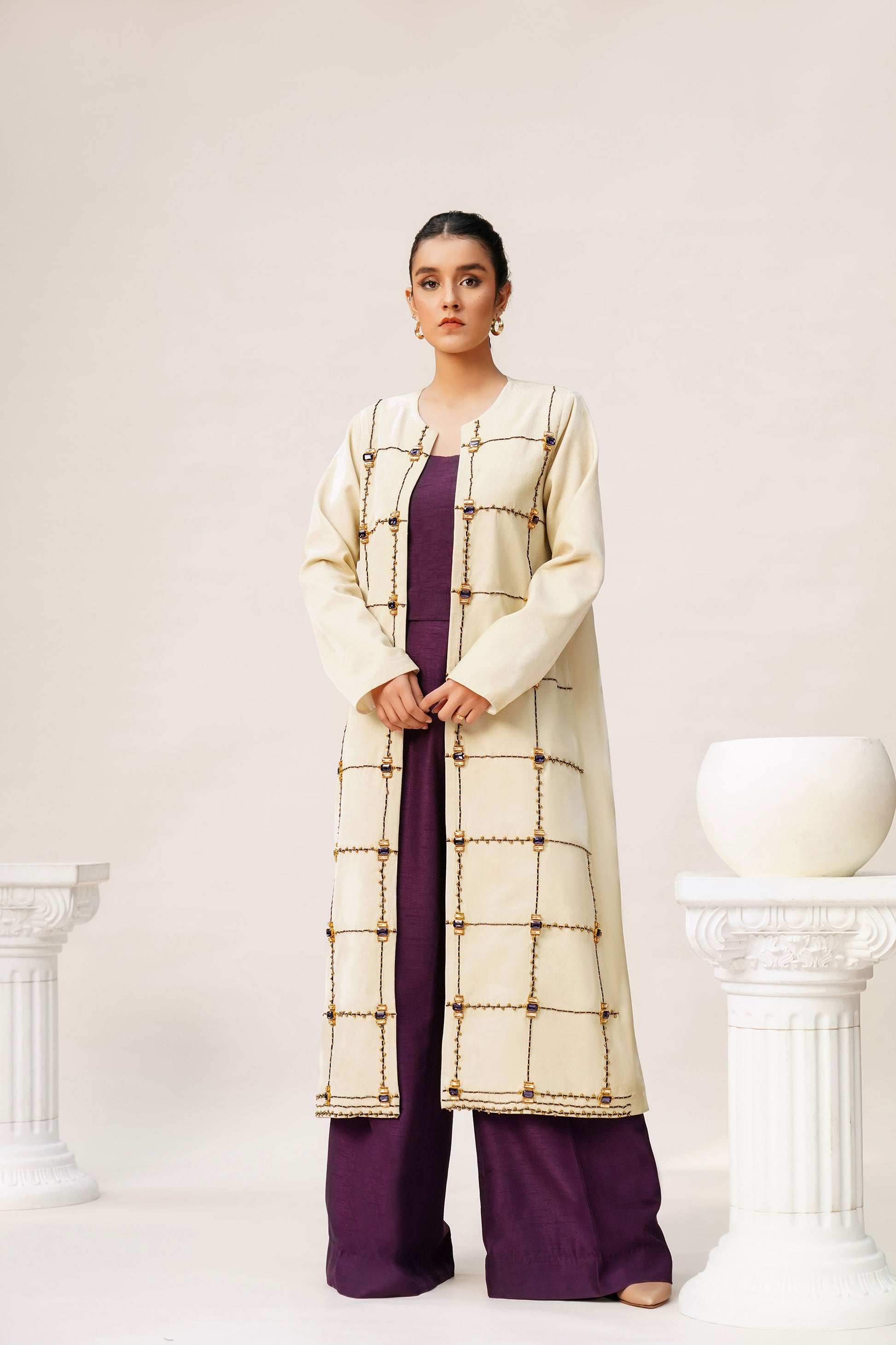 Description: Best western dress in Pakistan Ethereal is a cream overcoat with symmetrical stone embellishments paired with a wine silk corset and matching bootcut pants.