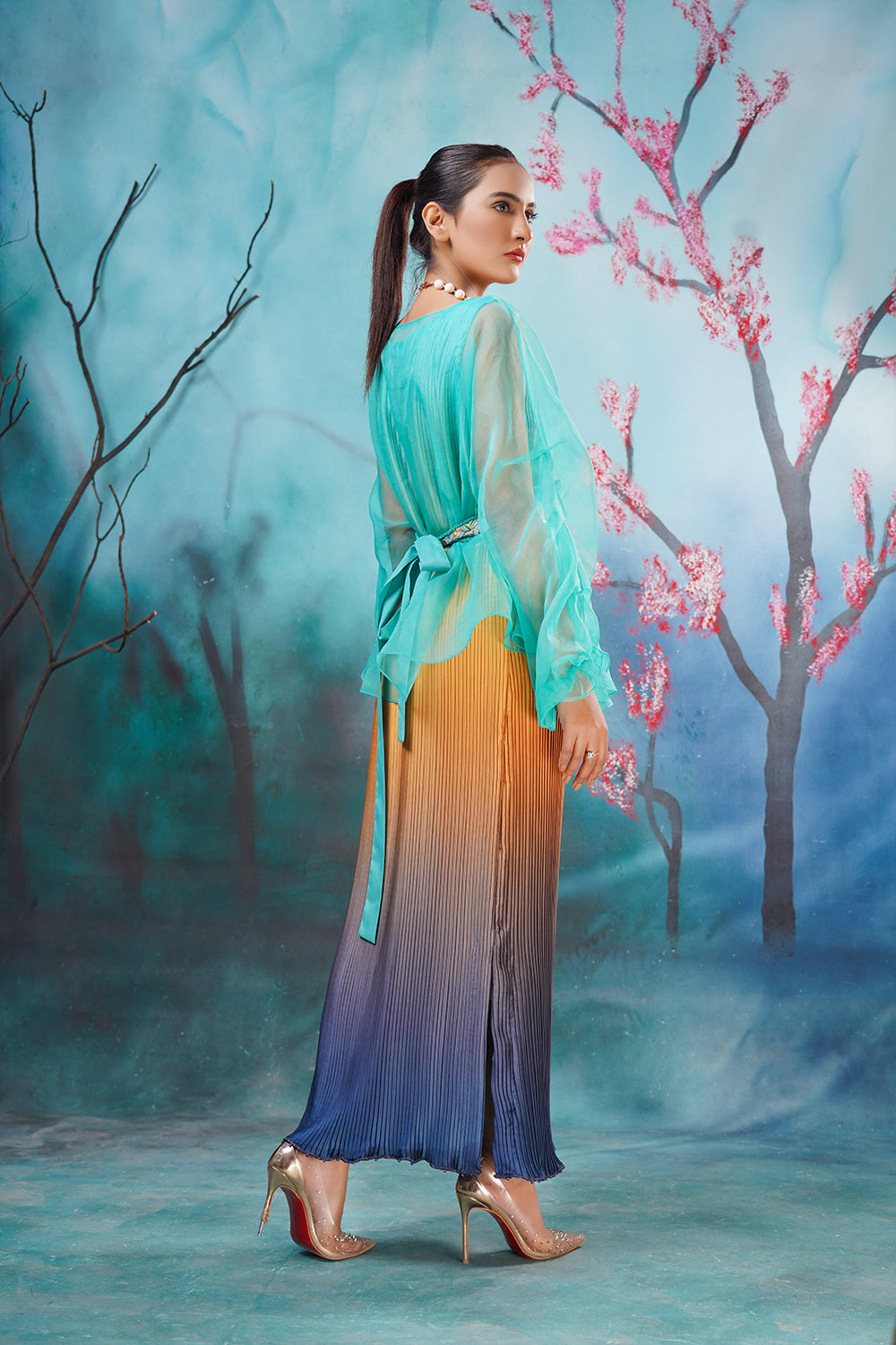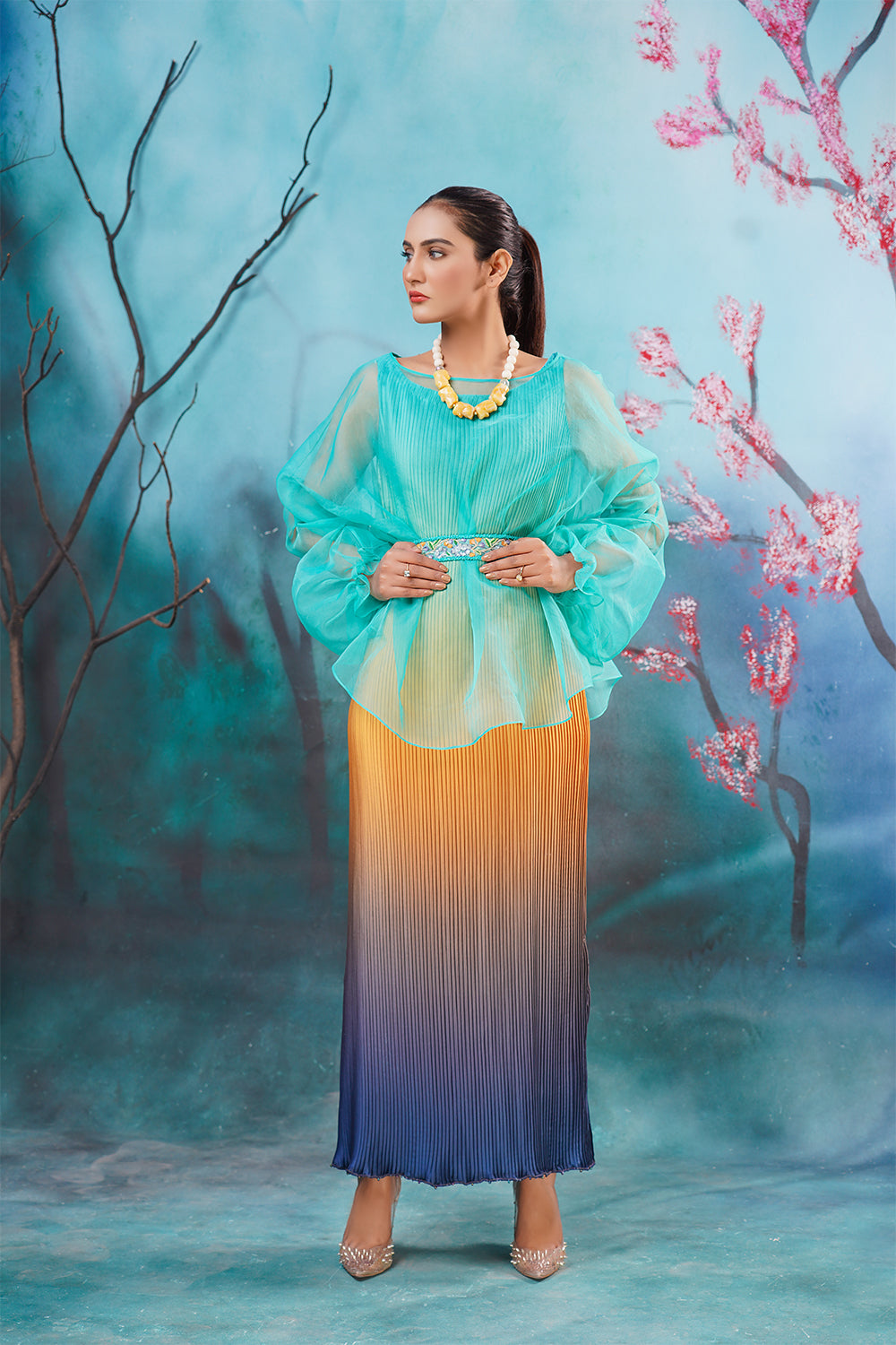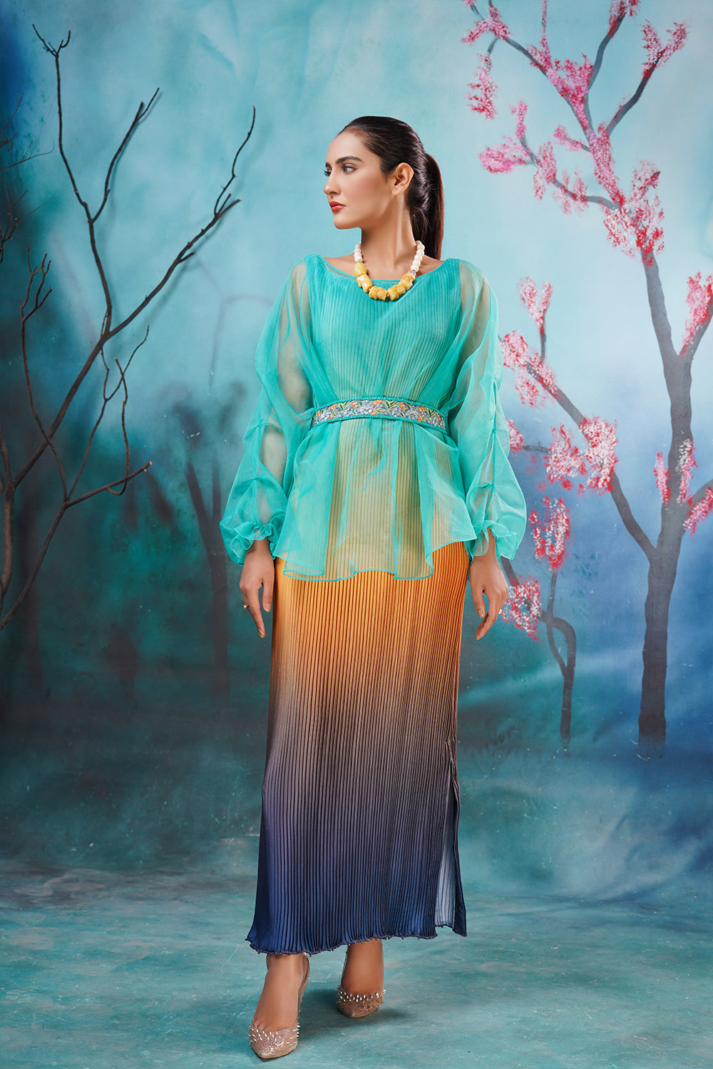 Description: The best western dress in Pakistan Ombre Affair is our crushed ombre long shirt with an organza pullover enhanced with a delicate hand-embroidered belt. Color Customization is available.