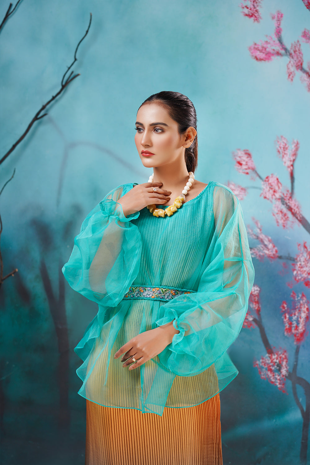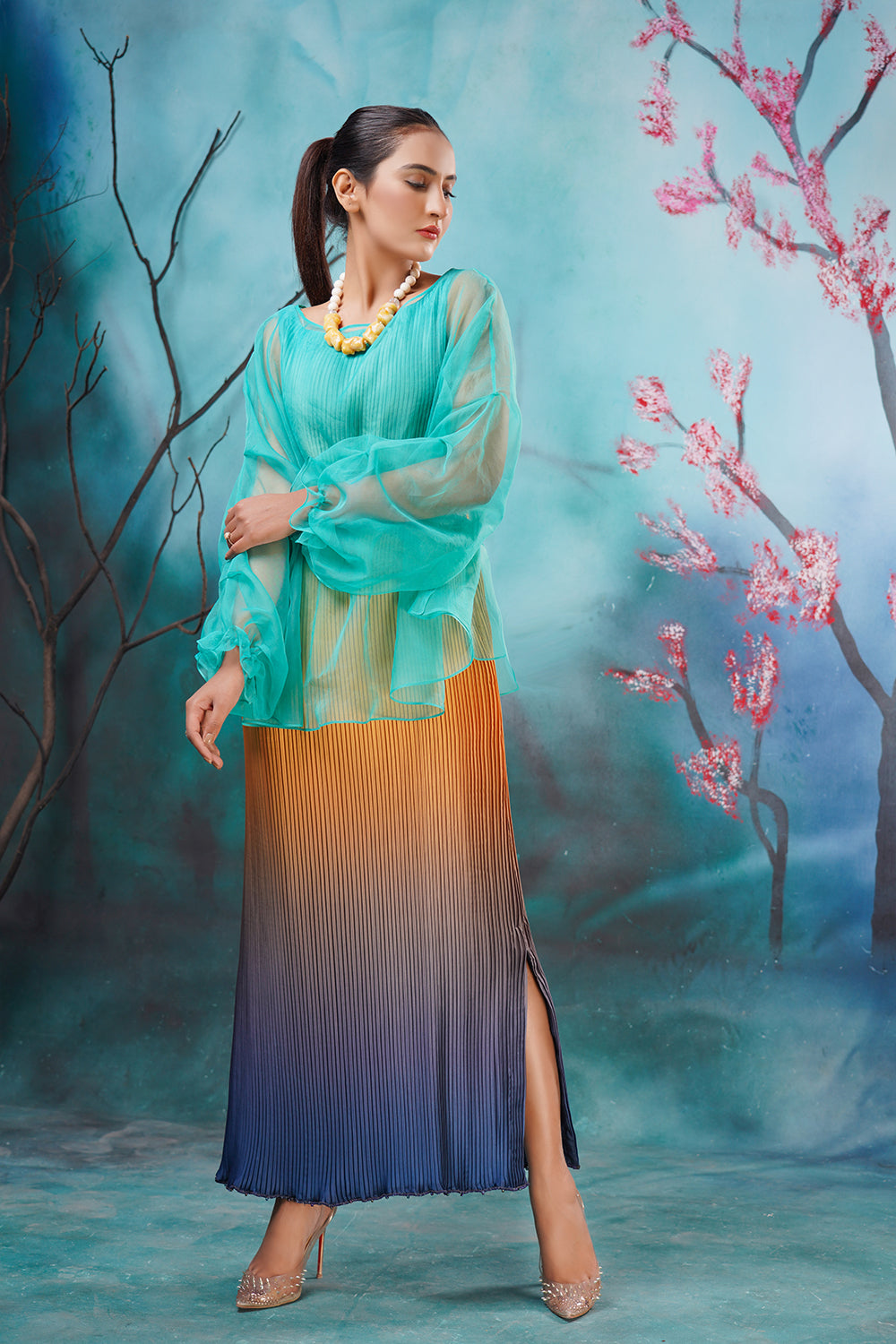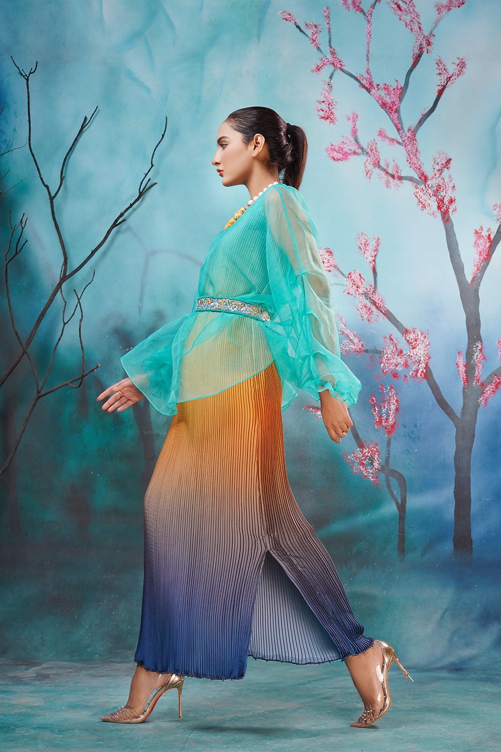 Description: The best western dress in Pakistan Ombre Affair is our crushed ombre long shirt with an organza pullover enhanced with a delicate hand-embroidered belt. Color Customization is available.