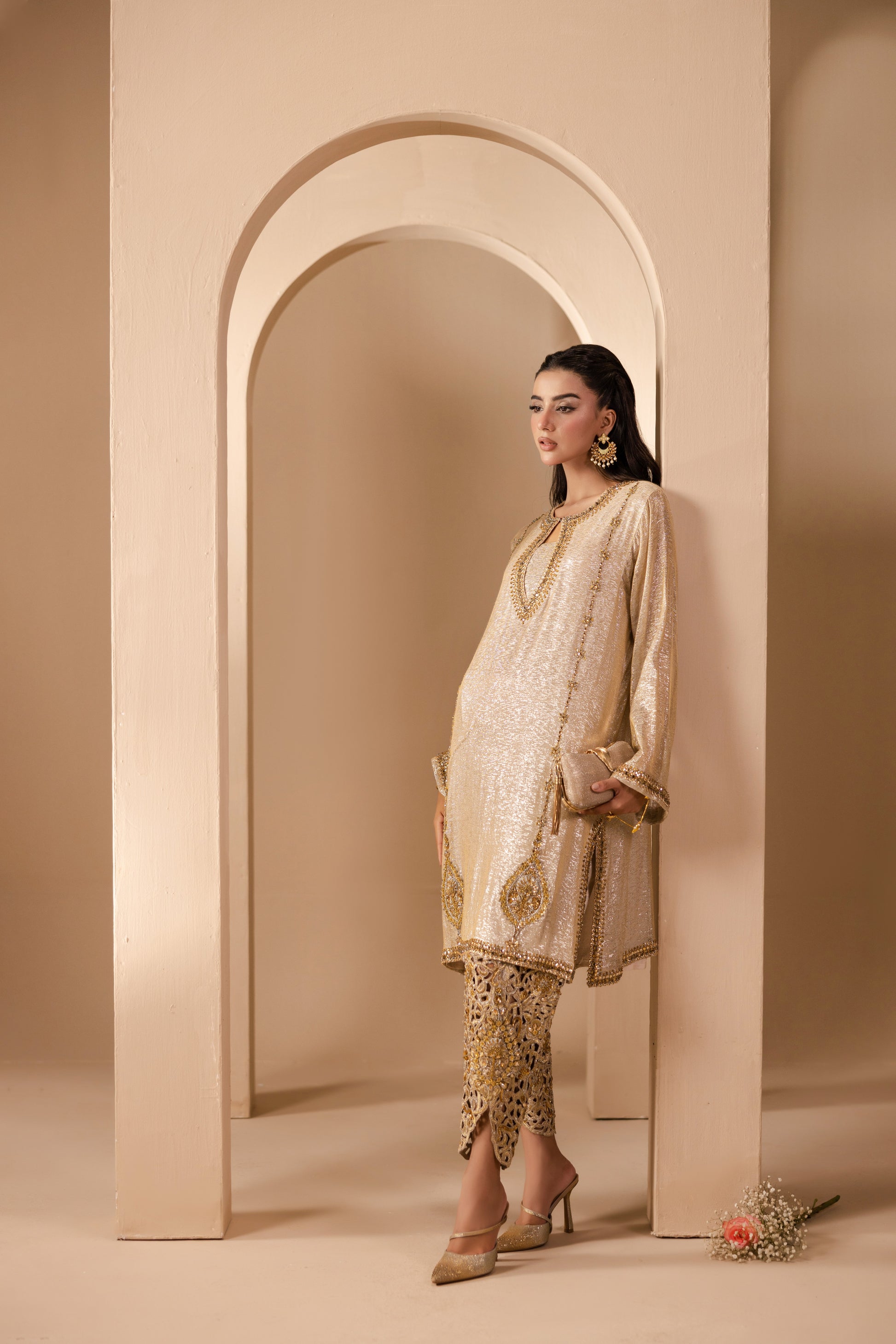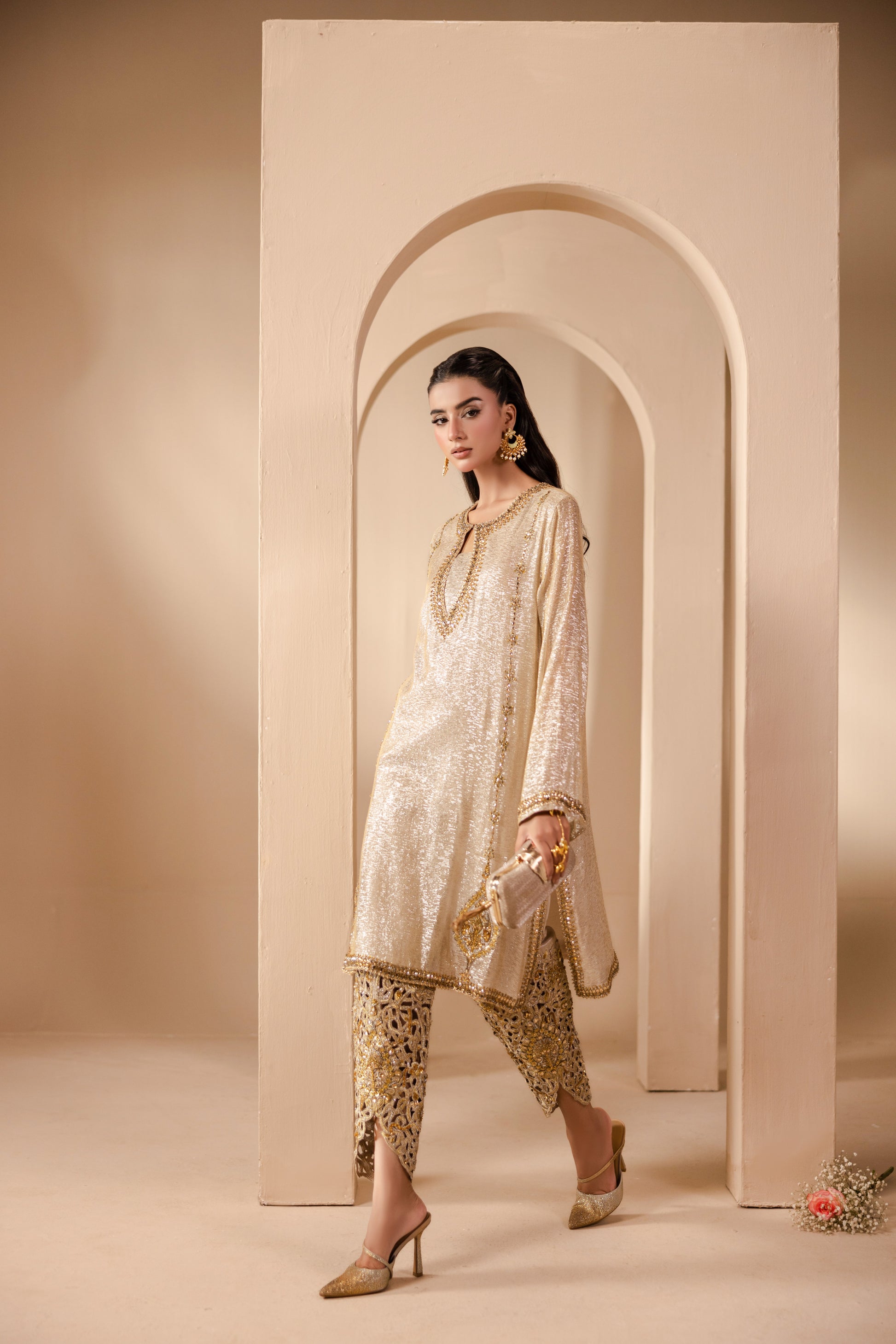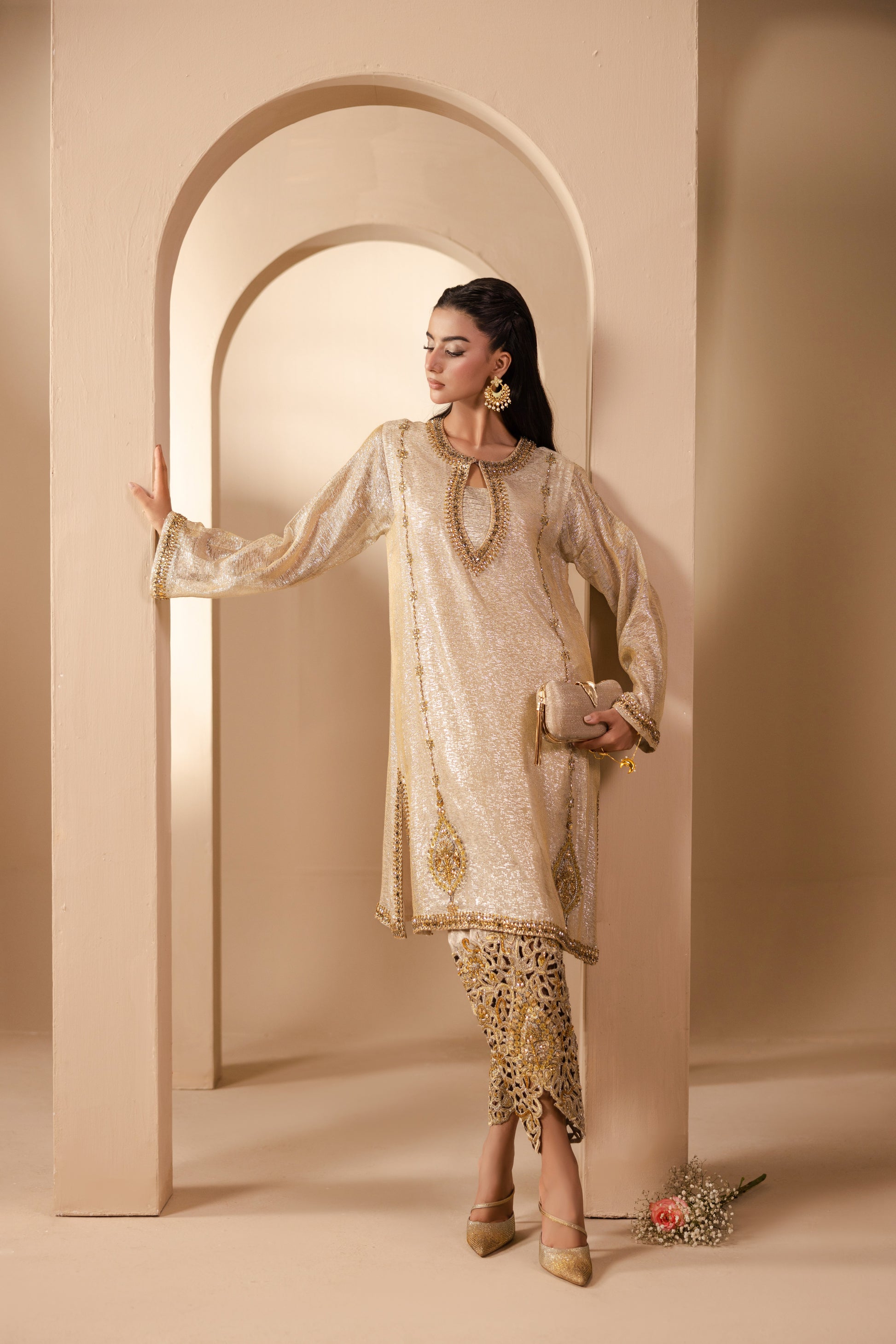 Description: An exquisite blend of tradition and elegance, this ensemble features intricate zardozi and crystal embellishments, paired with a delicate cutwork tulip shalwar for a statement finish. Crafted from luxurious zari organza and tissue fabric, the outfit radiates timeless charm and refined craftsmanship.