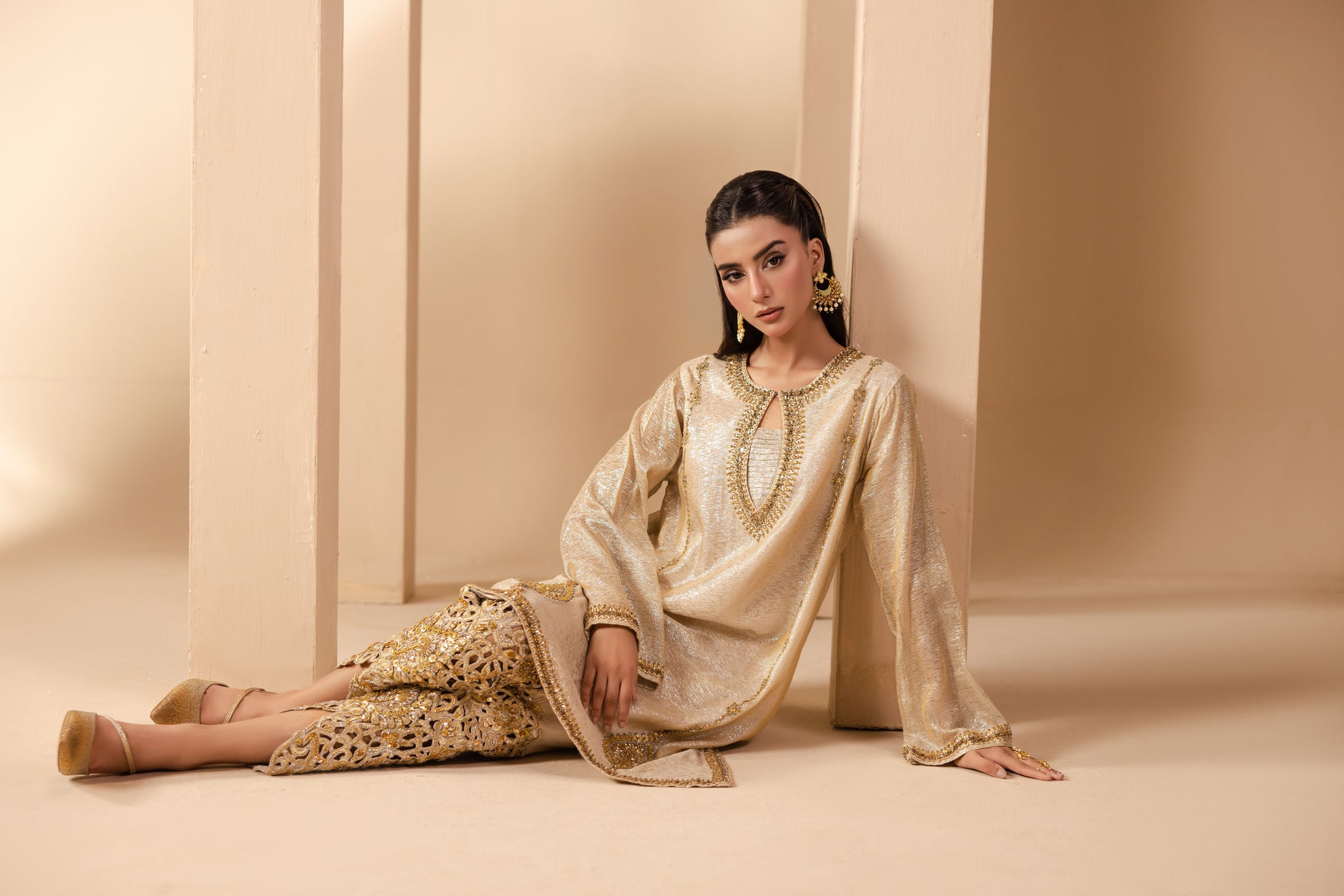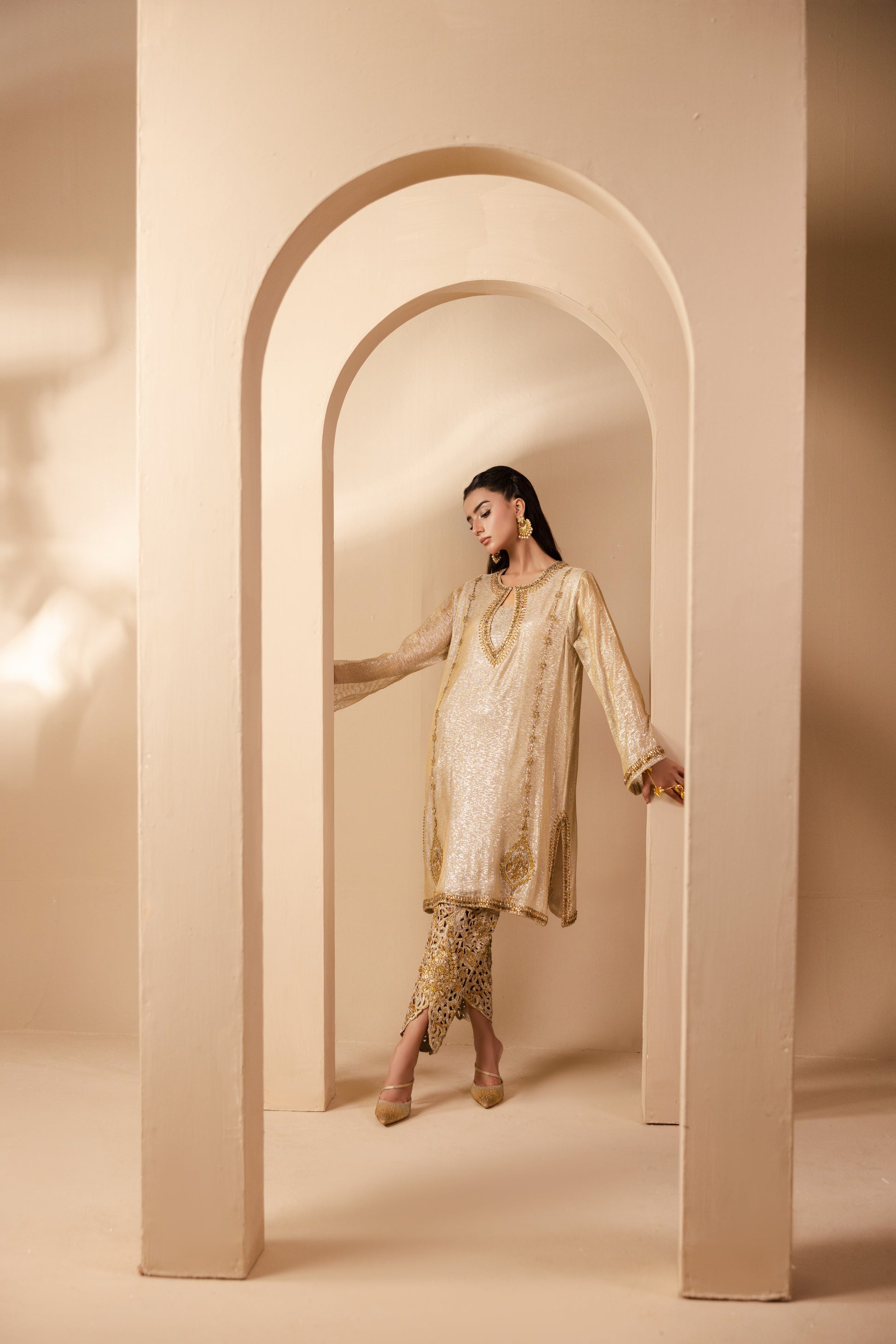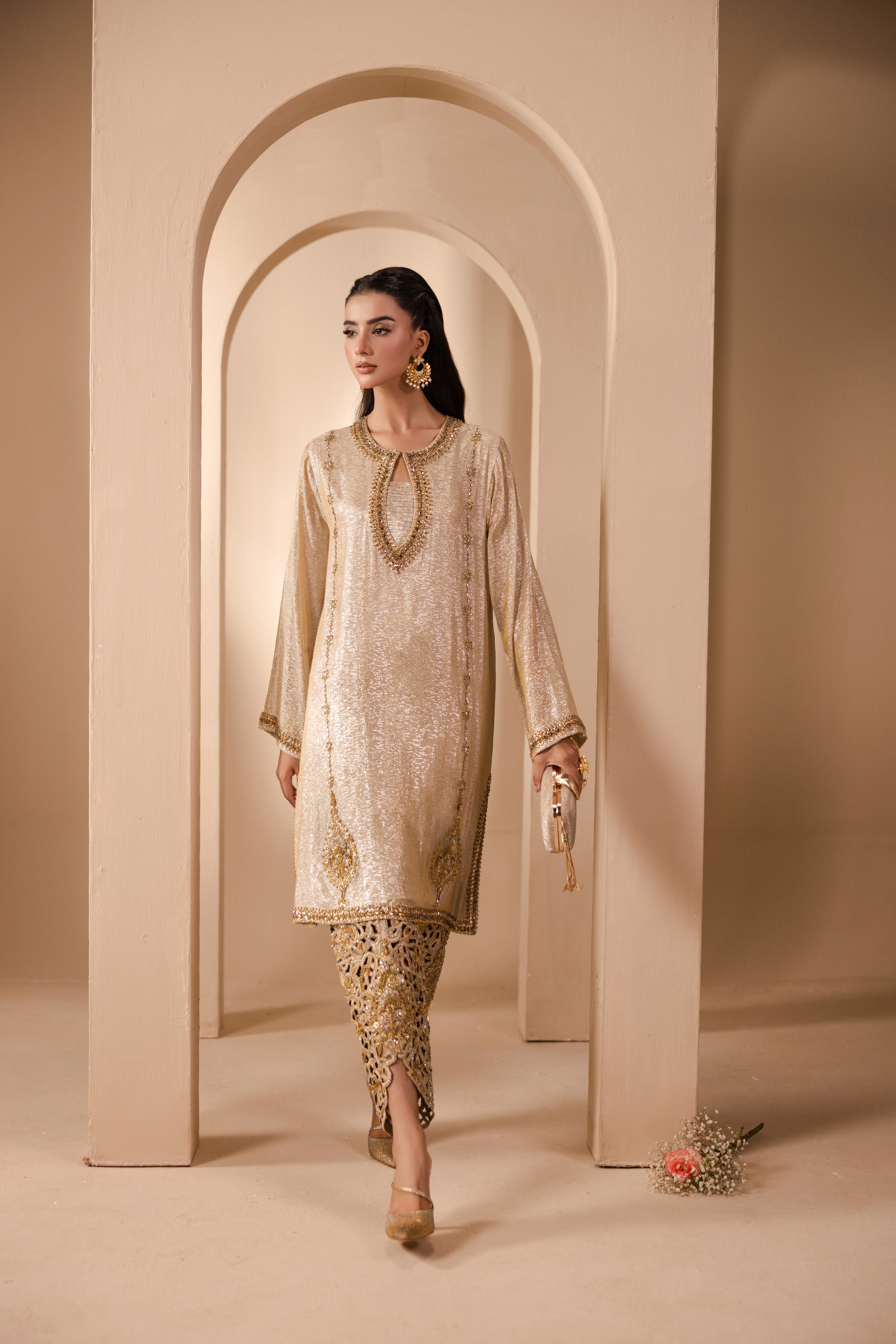 Description: An exquisite blend of tradition and elegance, this ensemble features intricate zardozi and crystal embellishments, paired with a delicate cutwork tulip shalwar for a statement finish. Crafted from luxurious zari organza and tissue fabric, the outfit radiates timeless charm and refined craftsmanship.