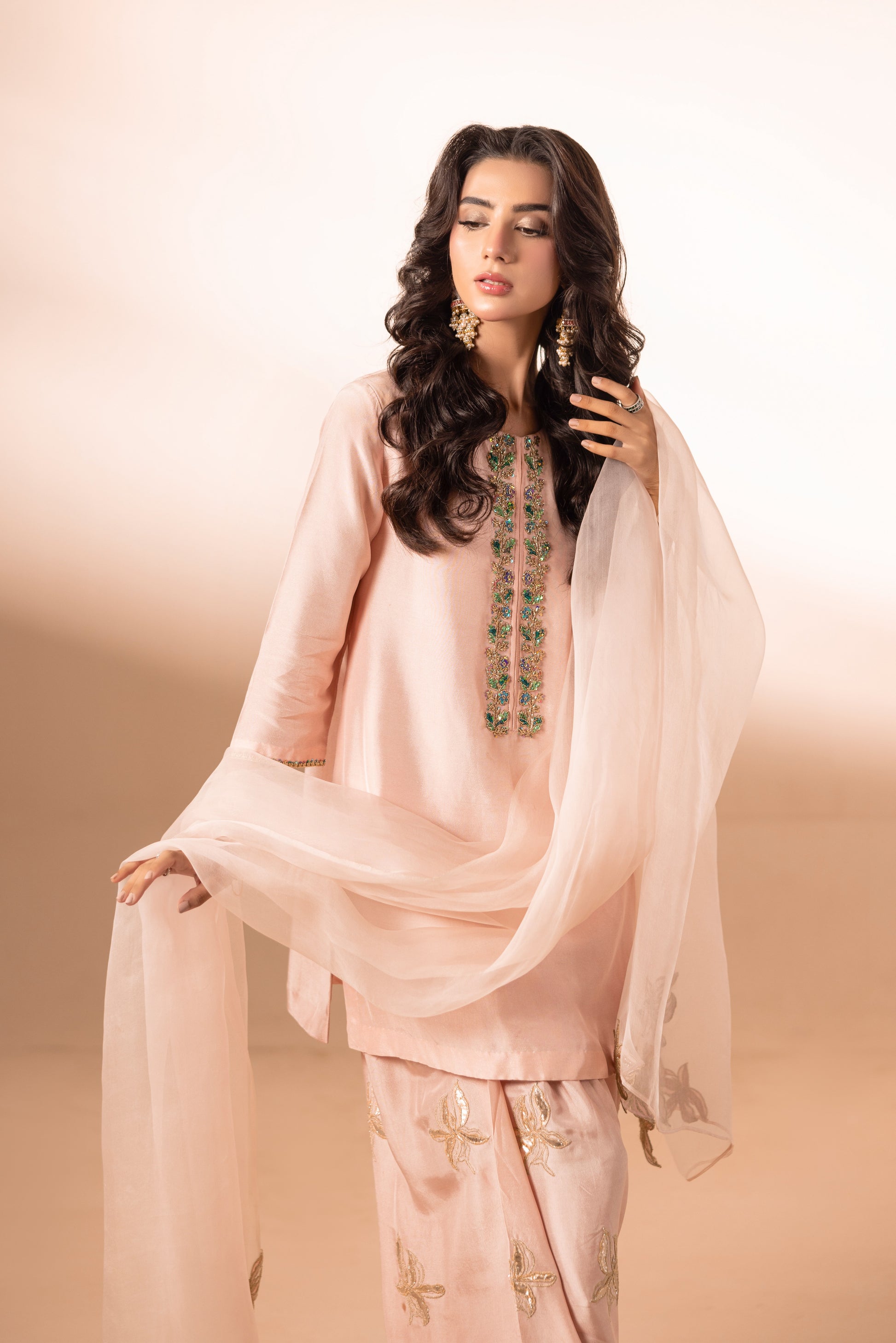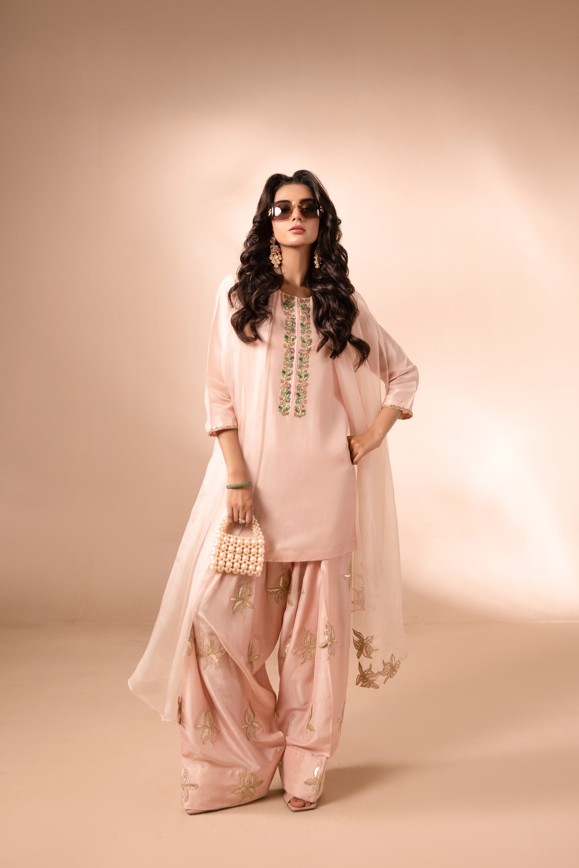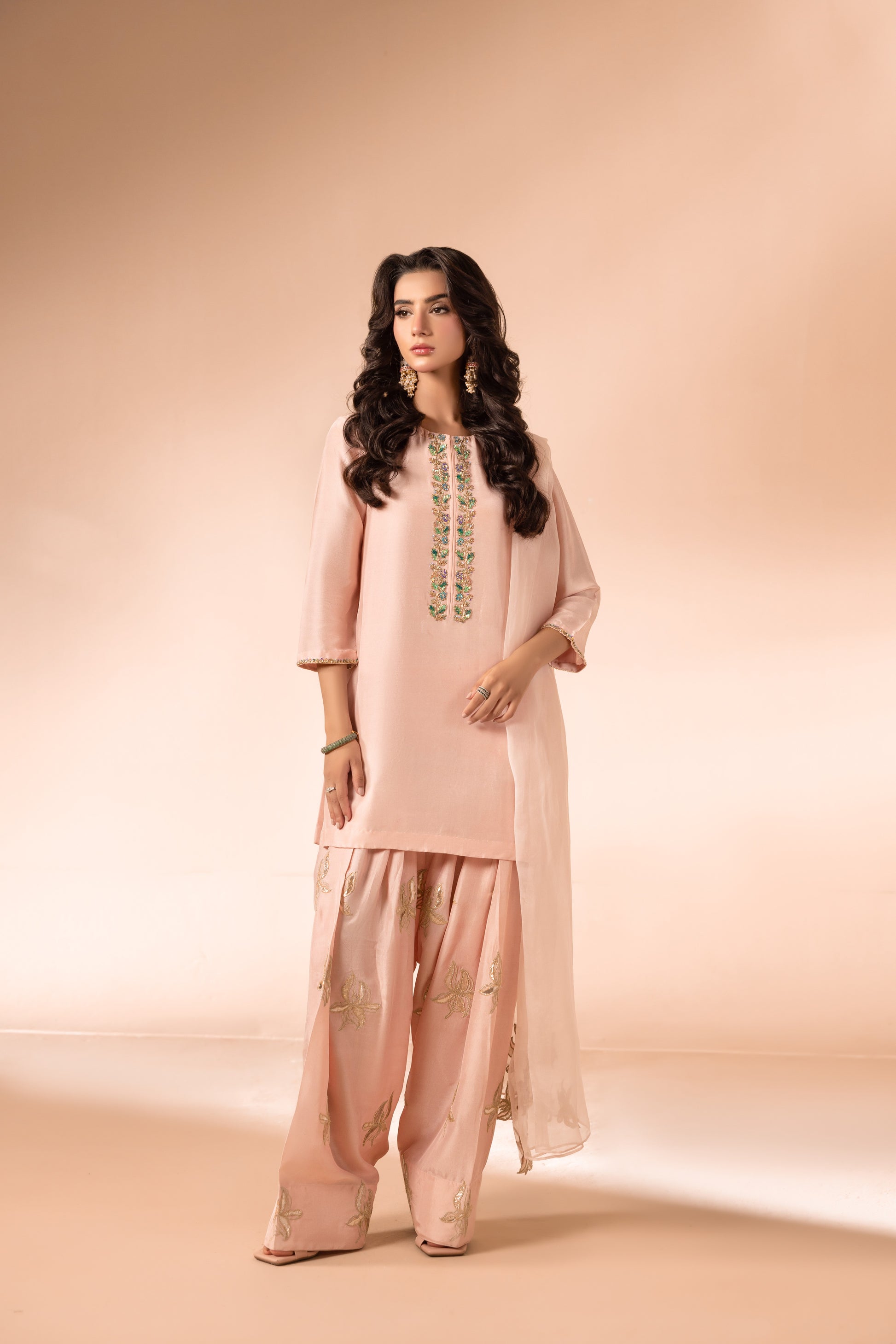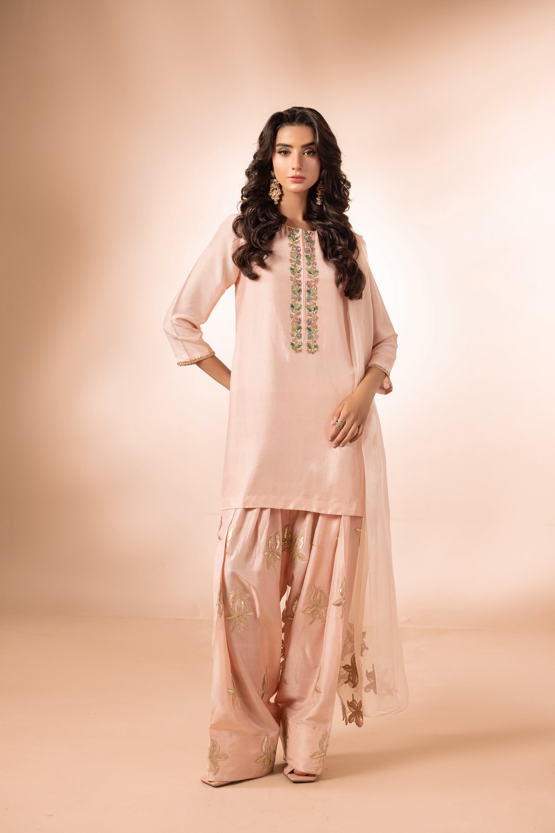 Description: A beautifully crafted shirt featuring delicate hand embellishments. Paired with a shalwar adorned in intricate gotta and tissue work, enhanced by the refined leafing technique. The look is completed with a dupatta detailed with elegant corner motifs.