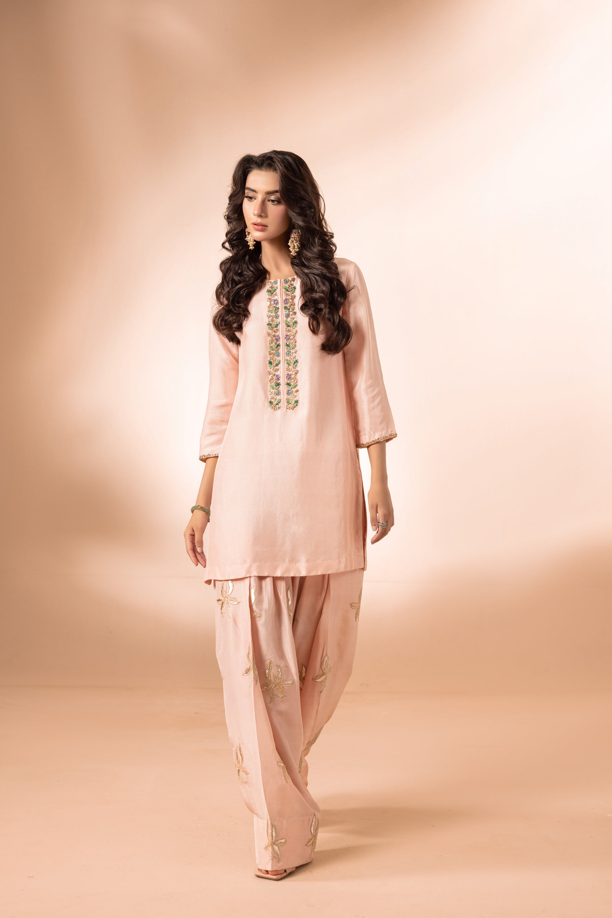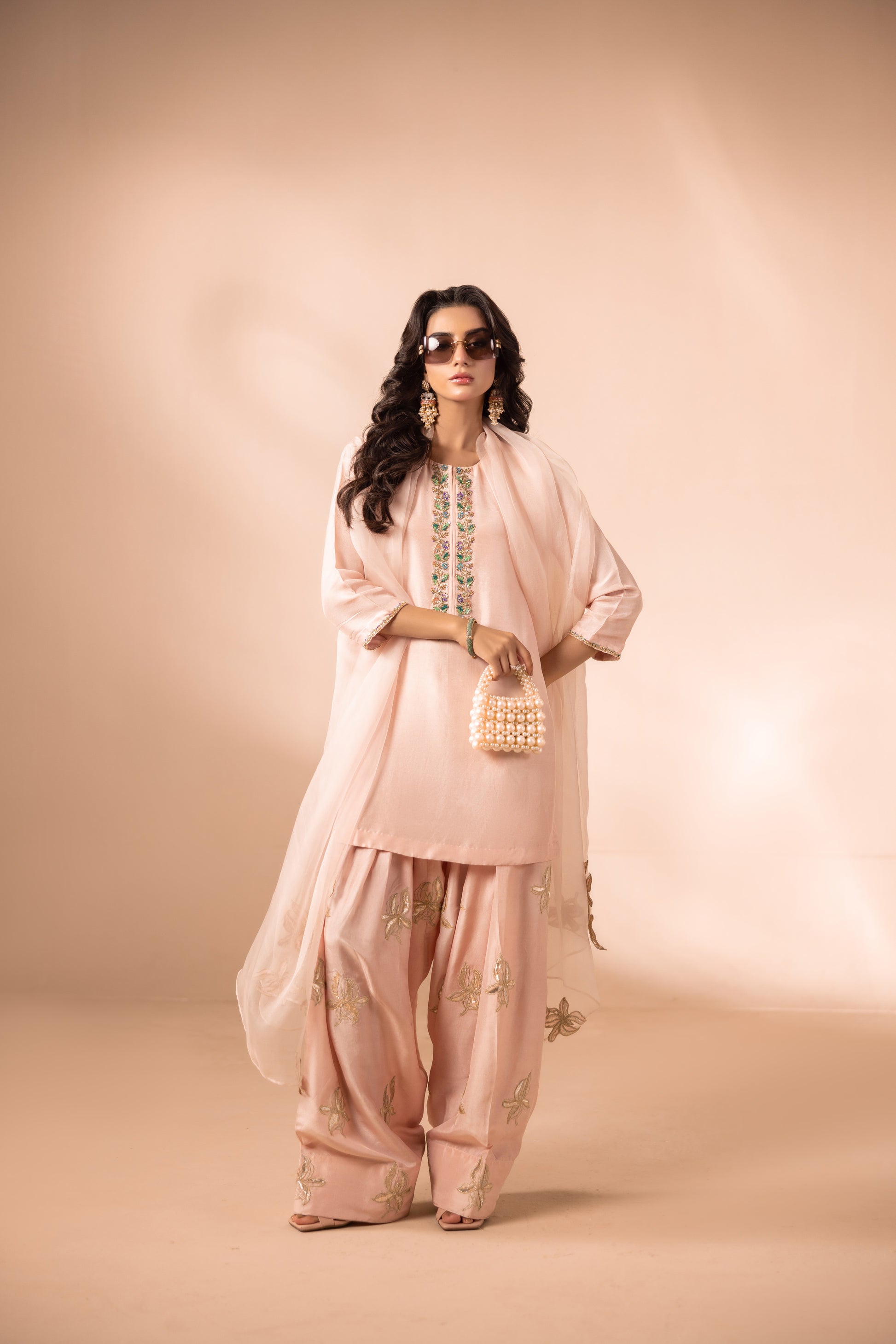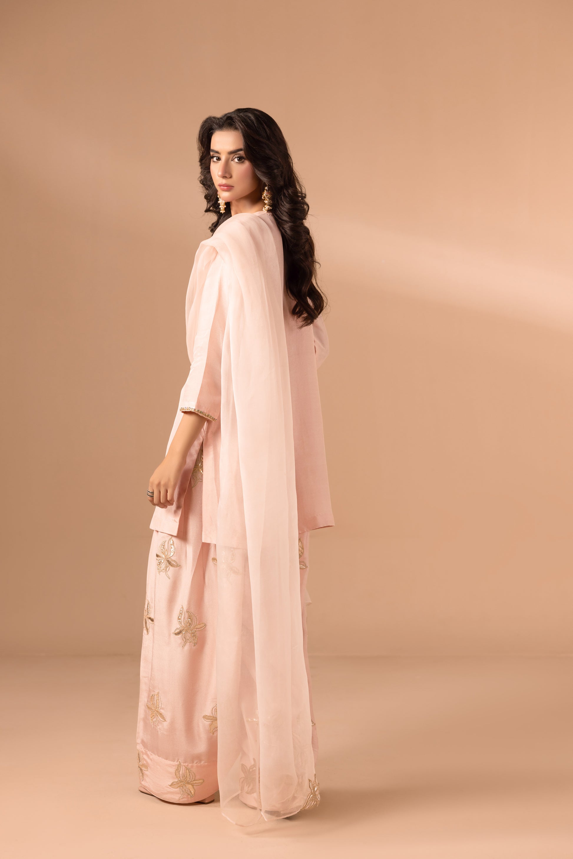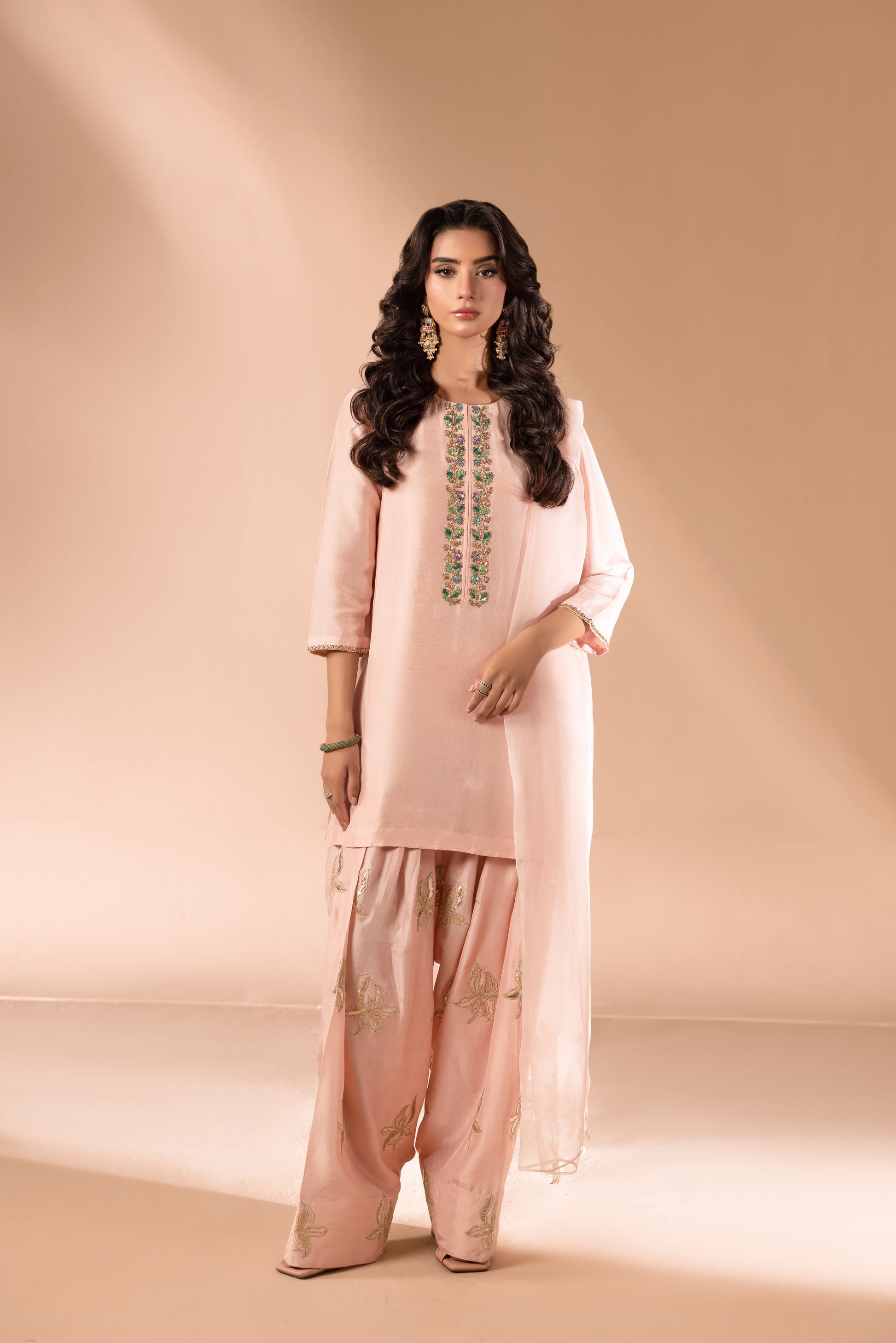 Description: A beautifully crafted shirt featuring delicate hand embellishments. Paired with a shalwar adorned in intricate gotta and tissue work, enhanced by the refined leafing technique. The look is completed with a dupatta detailed with elegant corner motifs.