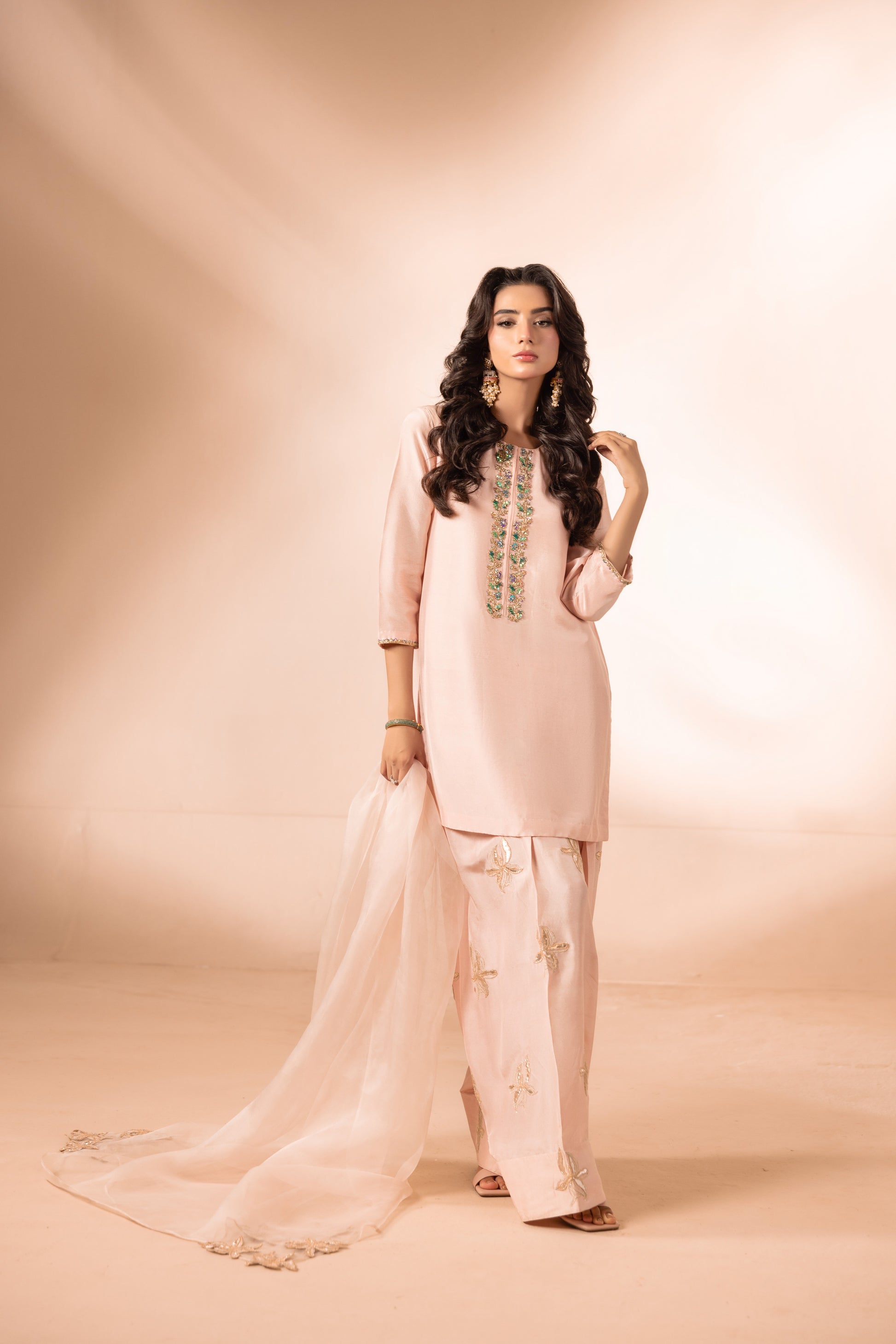 Description: A beautifully crafted shirt featuring delicate hand embellishments. Paired with a shalwar adorned in intricate gotta and tissue work, enhanced by the refined leafing technique. The look is completed with a dupatta detailed with elegant corner motifs.
