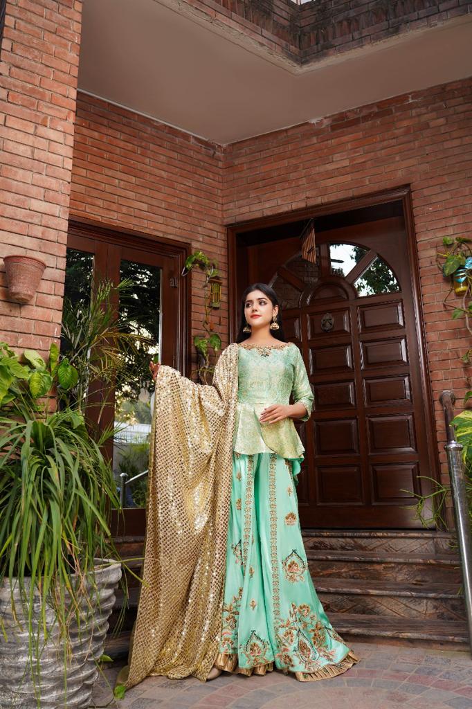 Description: Beautifully crafted peplum with double flared sharara pants embellished with resham, zardozi work, gota, and sequences.
