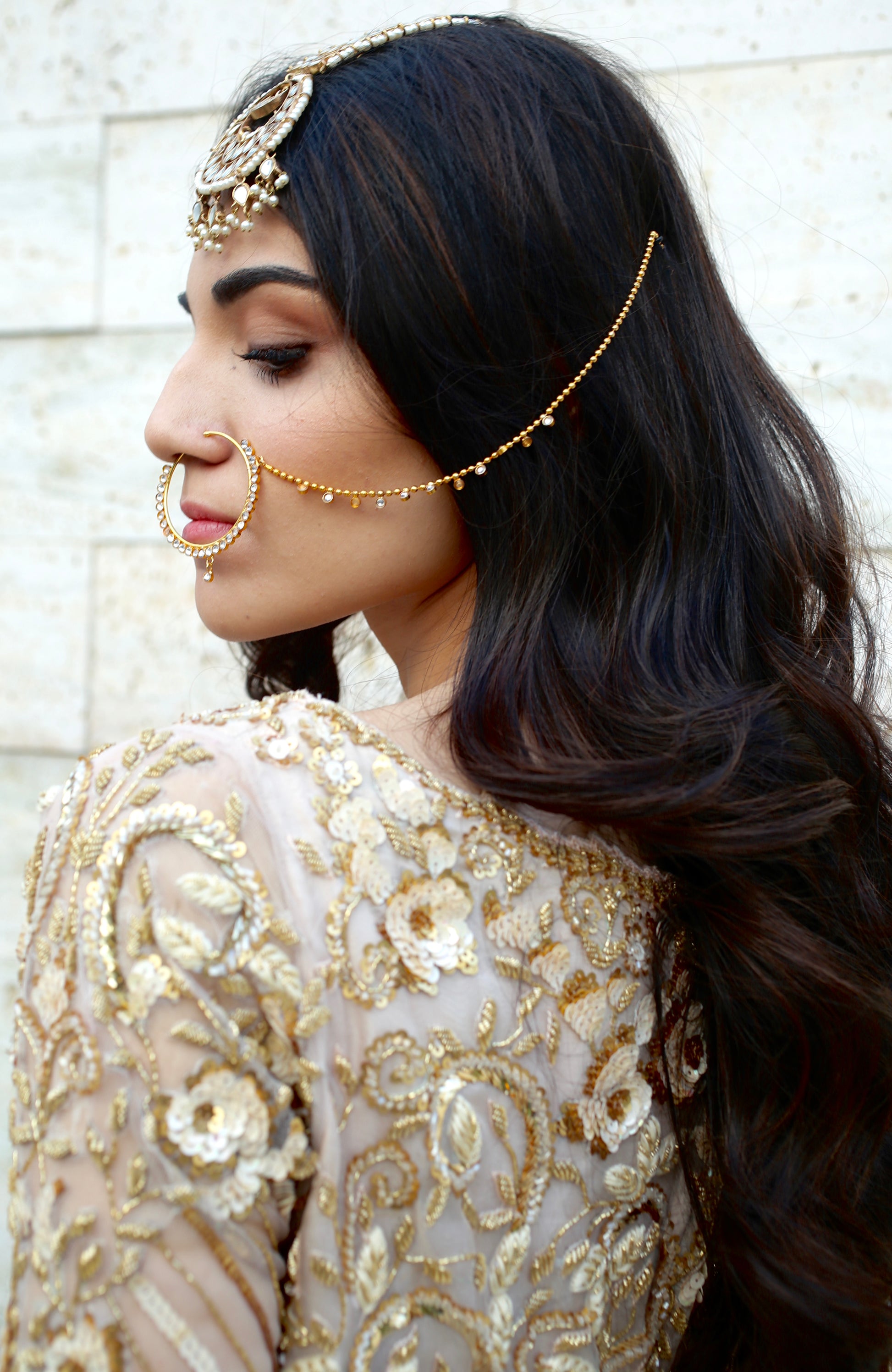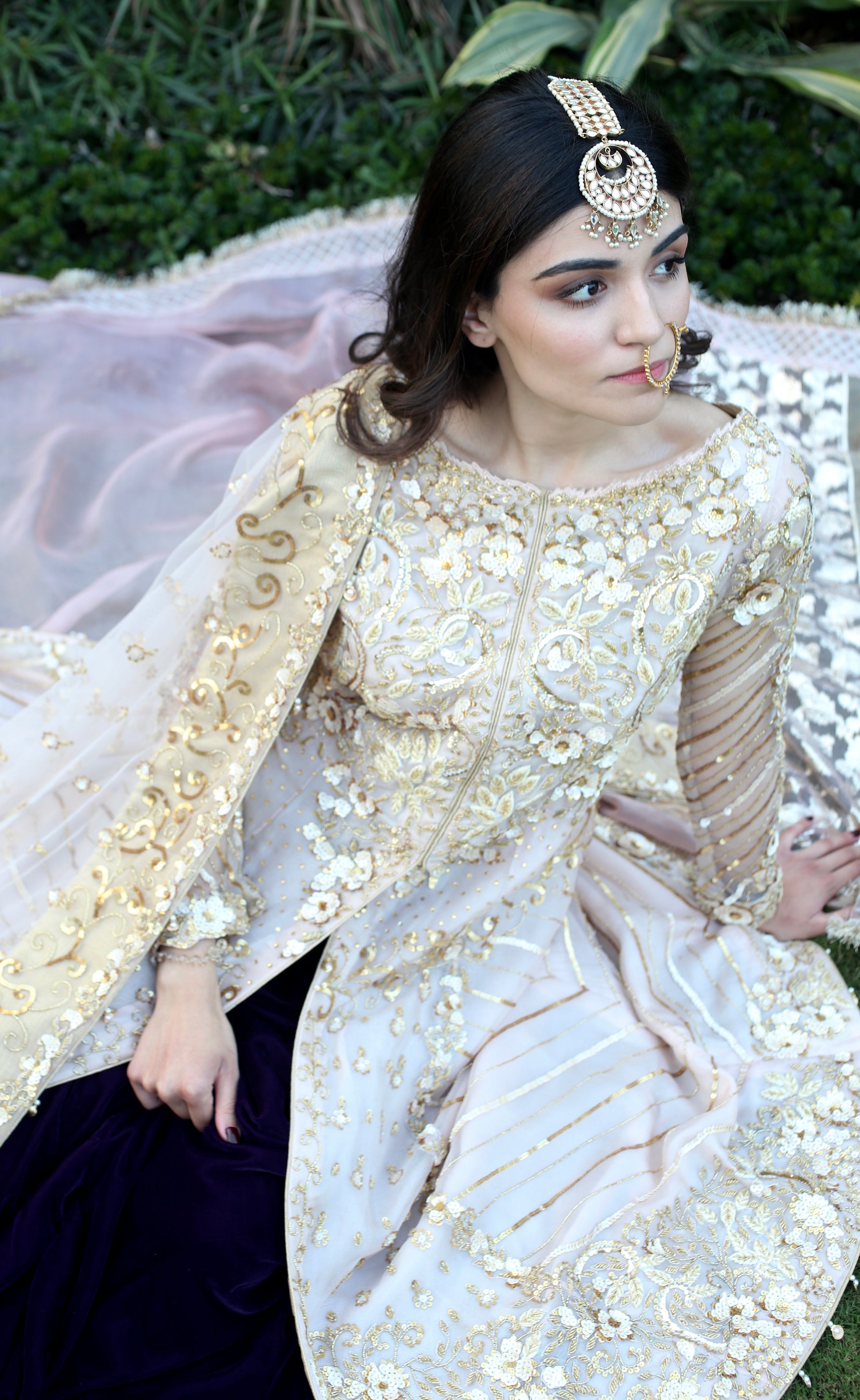 Description: Our intricately designed gown adorned with sequins, pearls, Mukaish and zardozi paired with a deep purple lehnga.