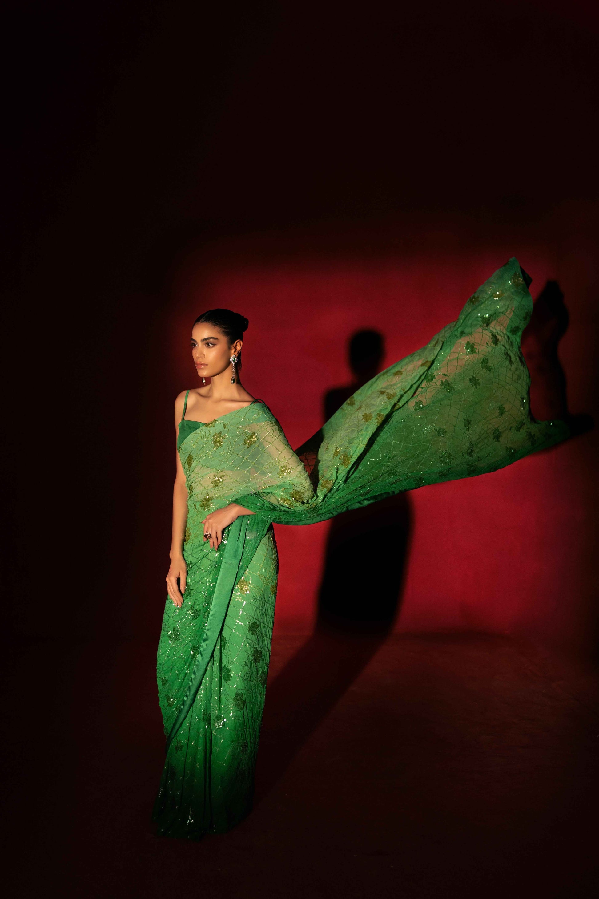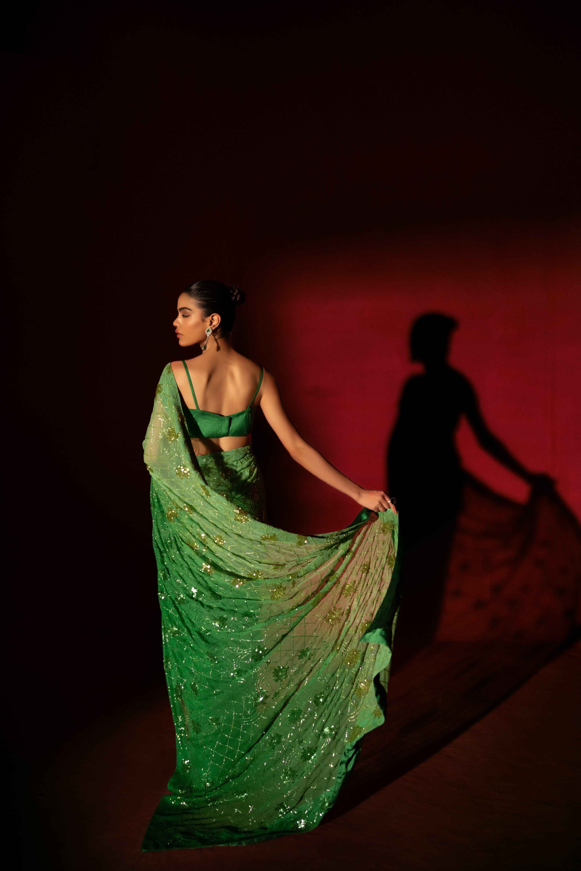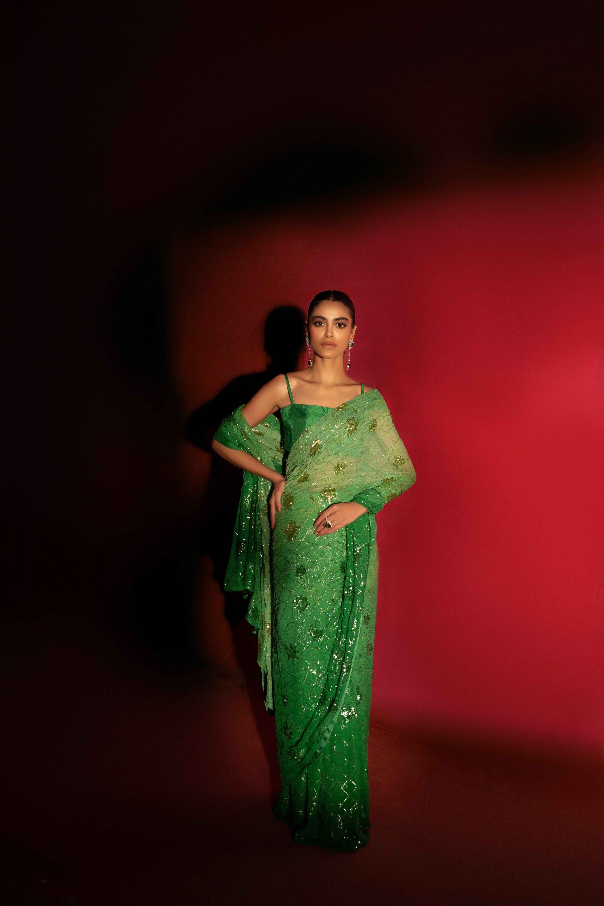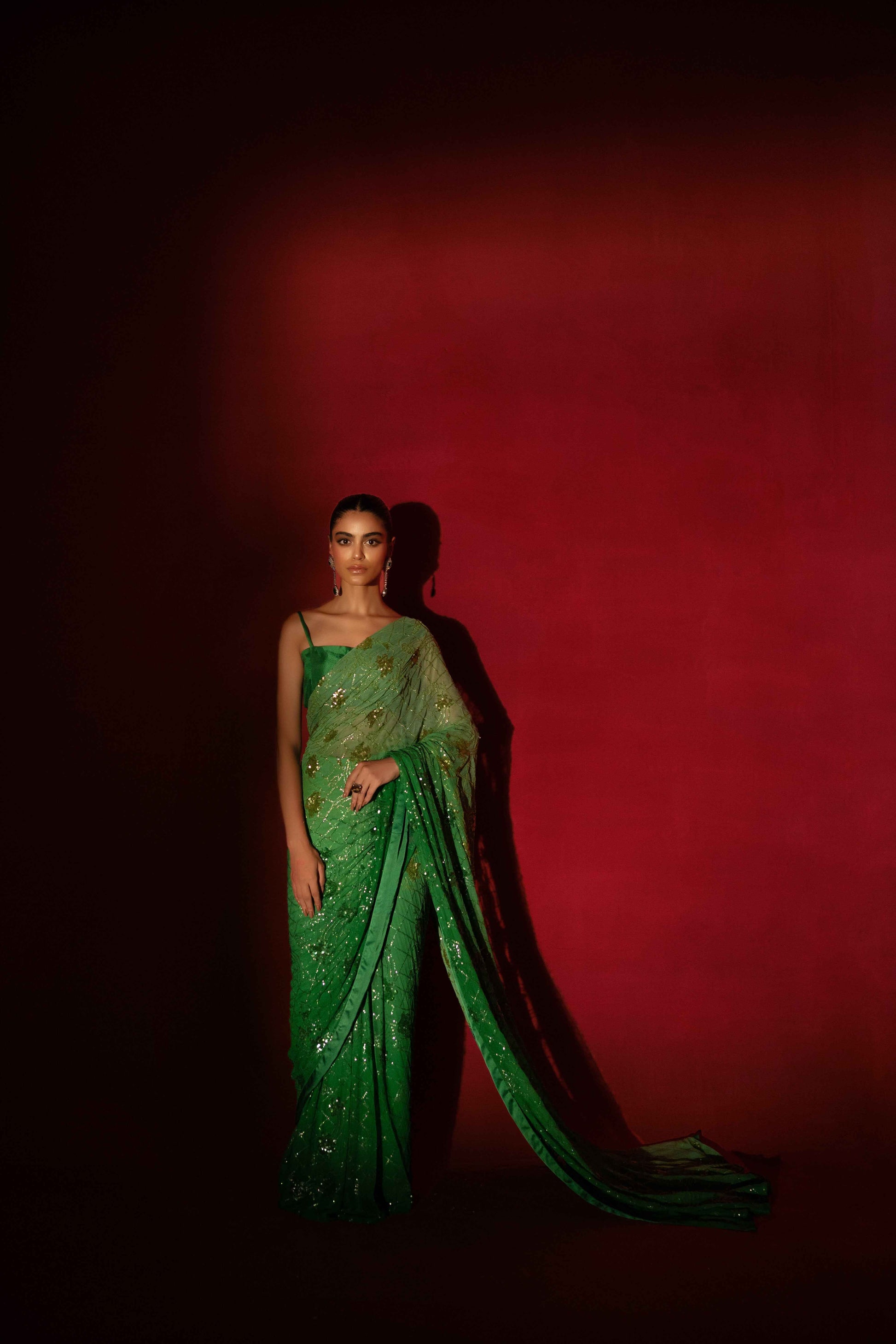 Description: A symphony of opulence and sophistication in every drape. Immerse yourself in the allure of this high-end masterpiece – a green oasis of sleekness and luxury. The meticulous sequence work and ombré fabric create a canvas of intricate design, making every moment in this saree a statement of refined elegance. Elevate your style, embody luxury.