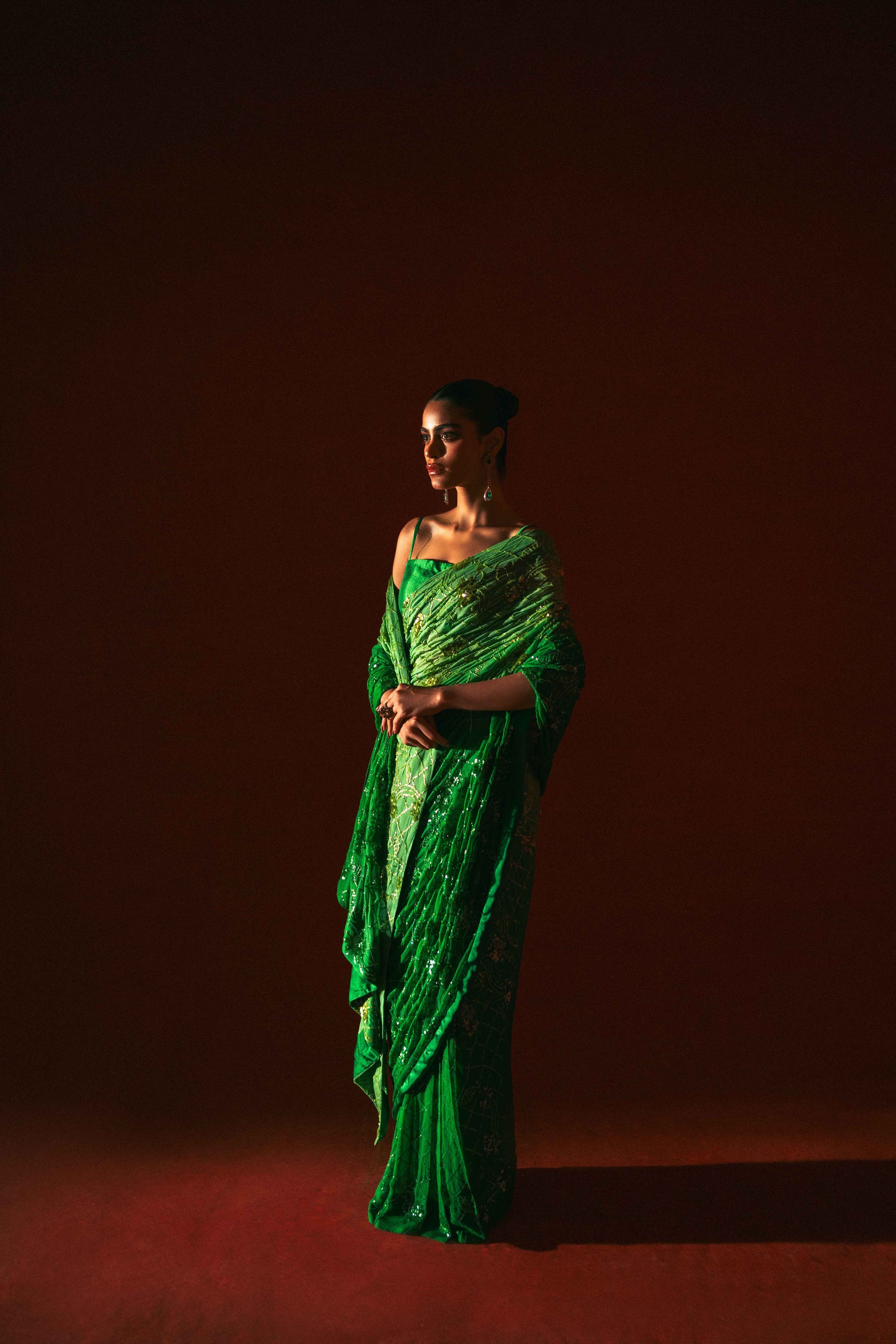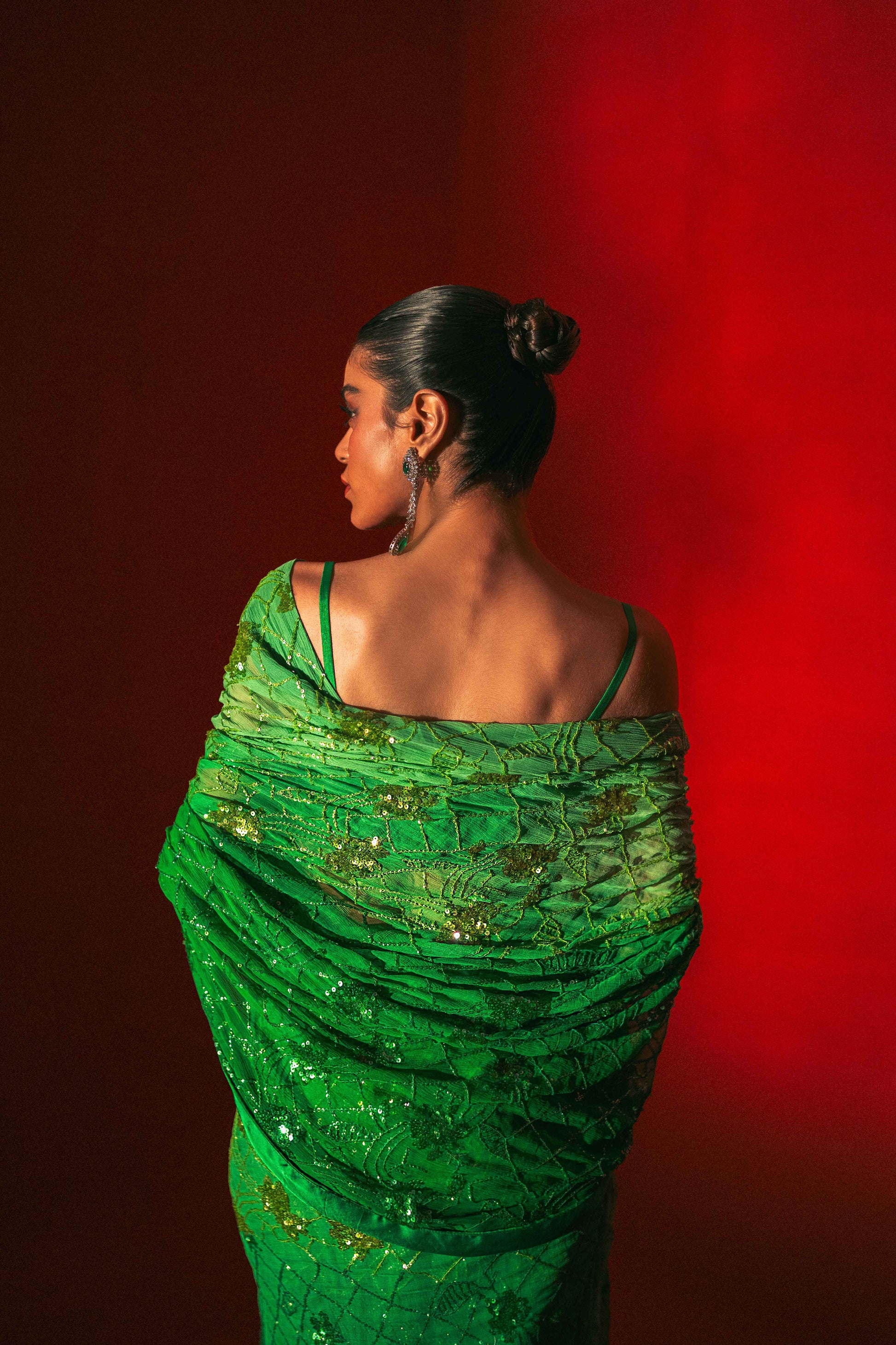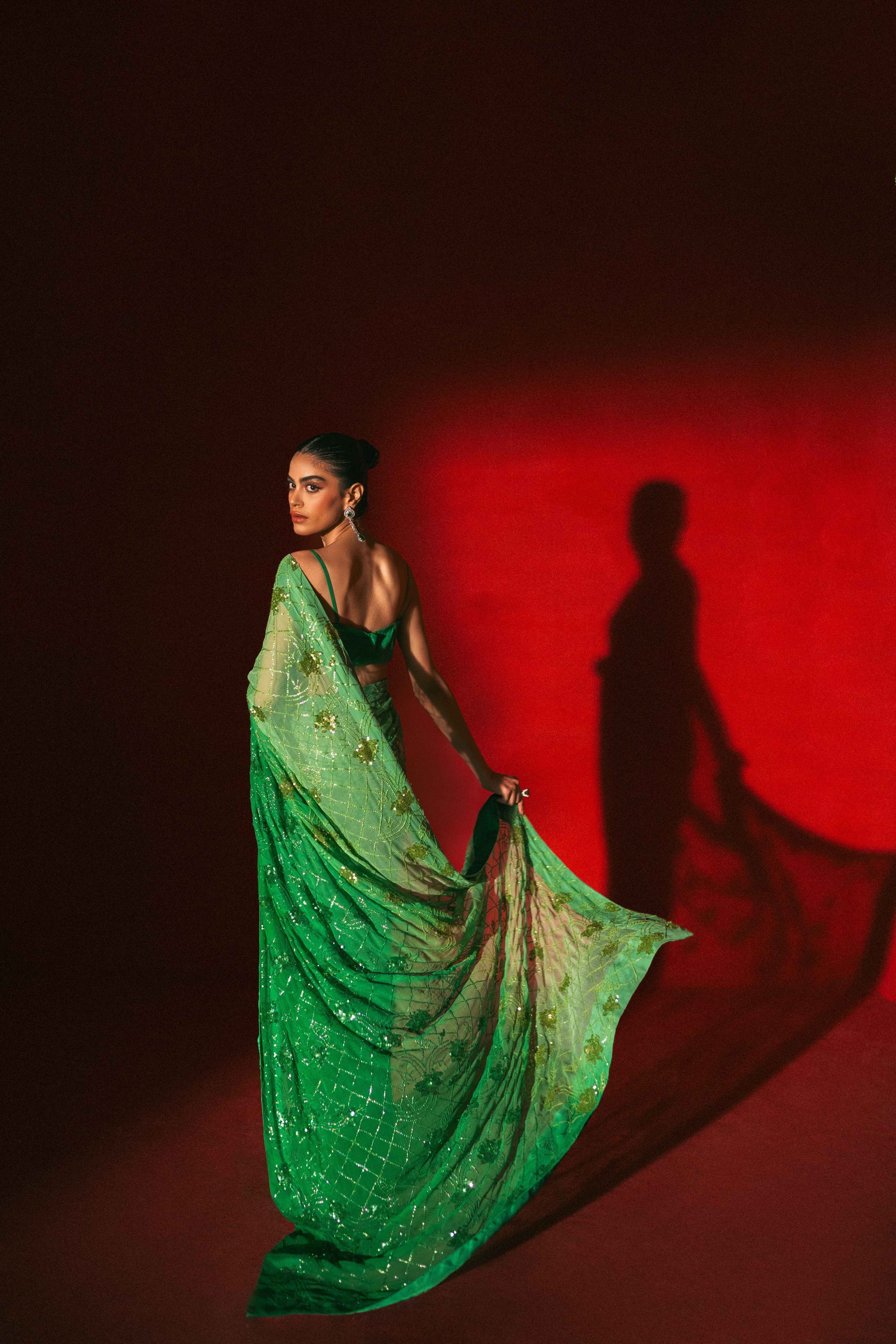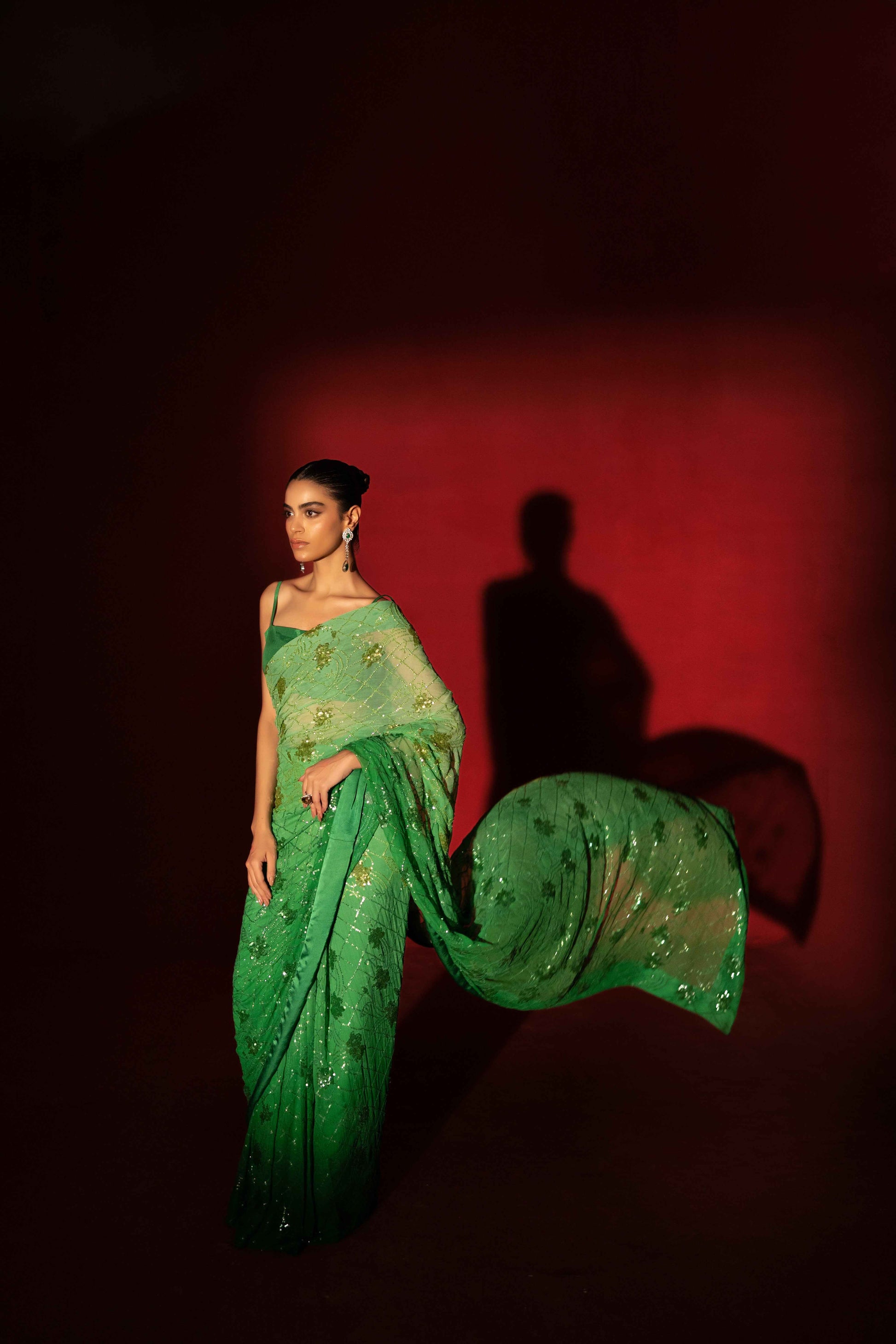 Description: A symphony of opulence and sophistication in every drape. Immerse yourself in the allure of this high-end masterpiece – a green oasis of sleekness and luxury. The meticulous sequence work and ombré fabric create a canvas of intricate design, making every moment in this saree a statement of refined elegance. Elevate your style, embody luxury.
