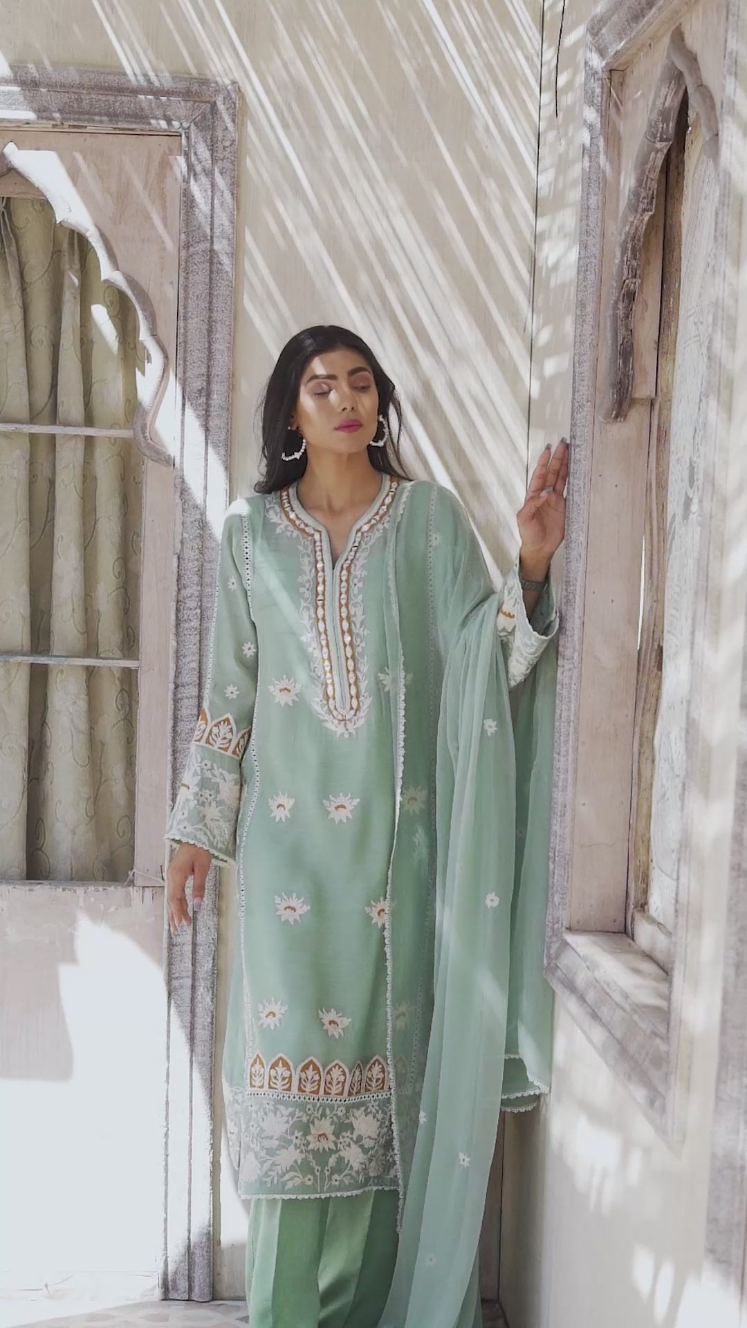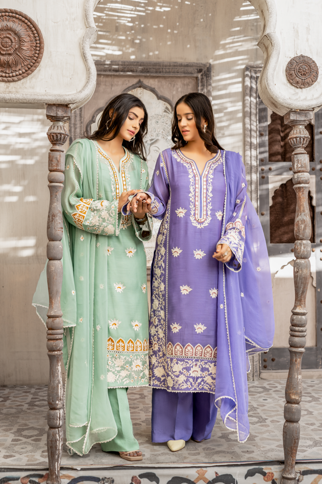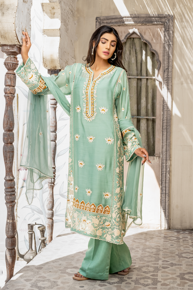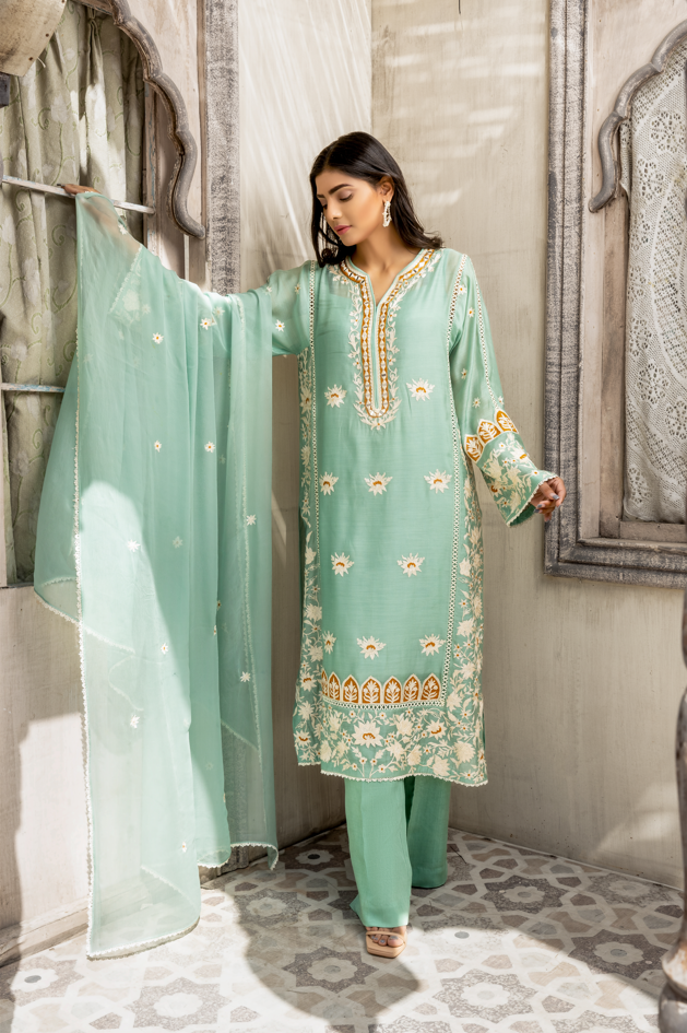 Description: Ariwork kurta adorned with mirrors neckline. Paired with a beautiful dupatta.
