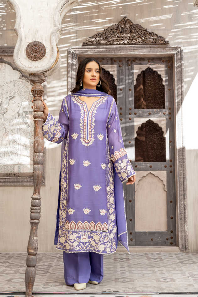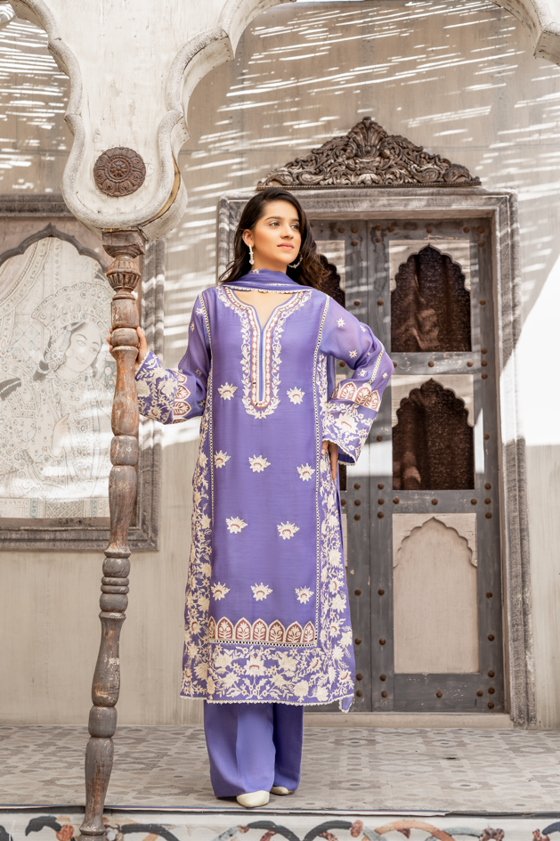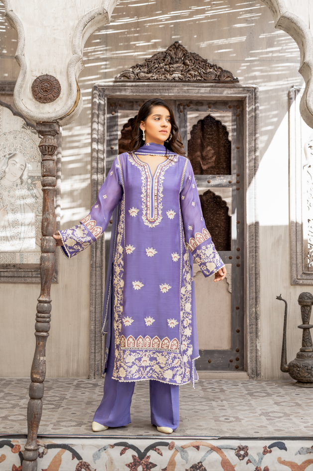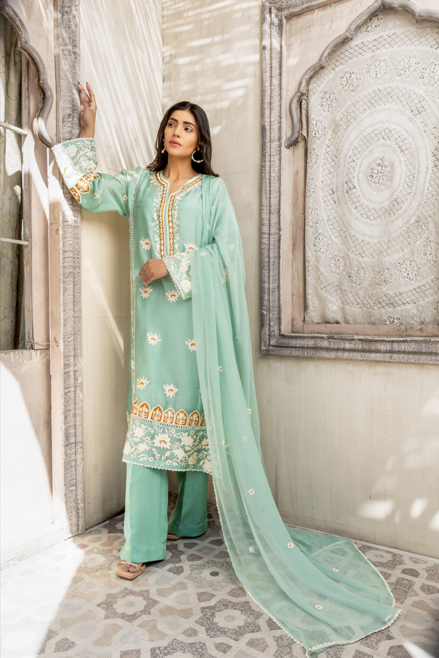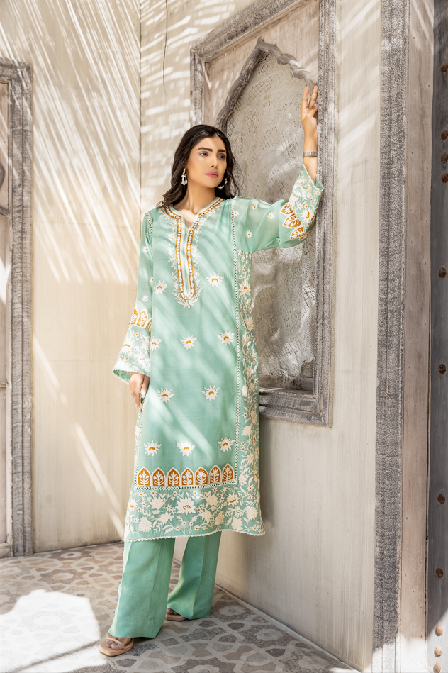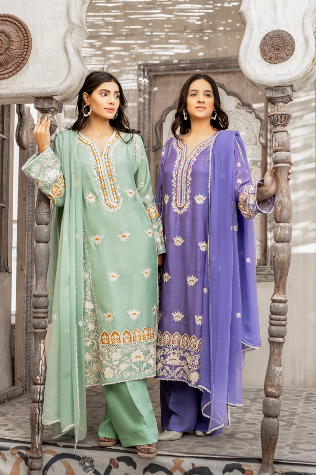 Description: Ariwork kurta adorned with mirrors neckline. Paired with a beautiful dupatta.