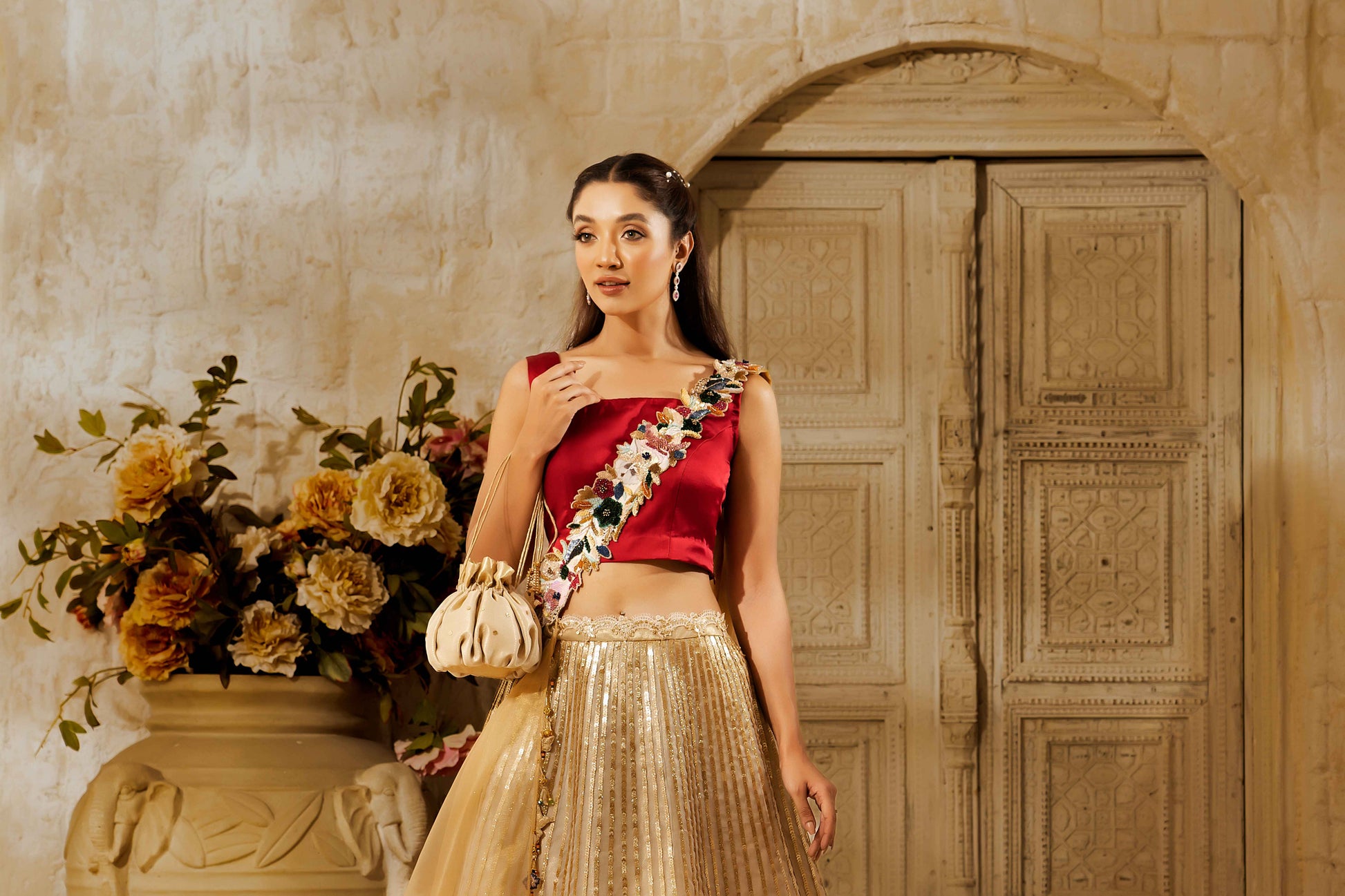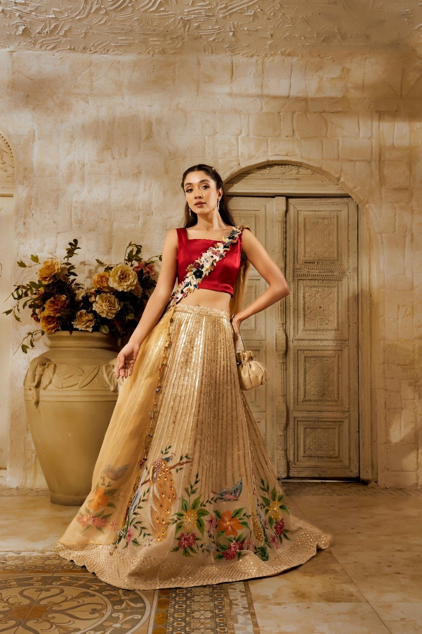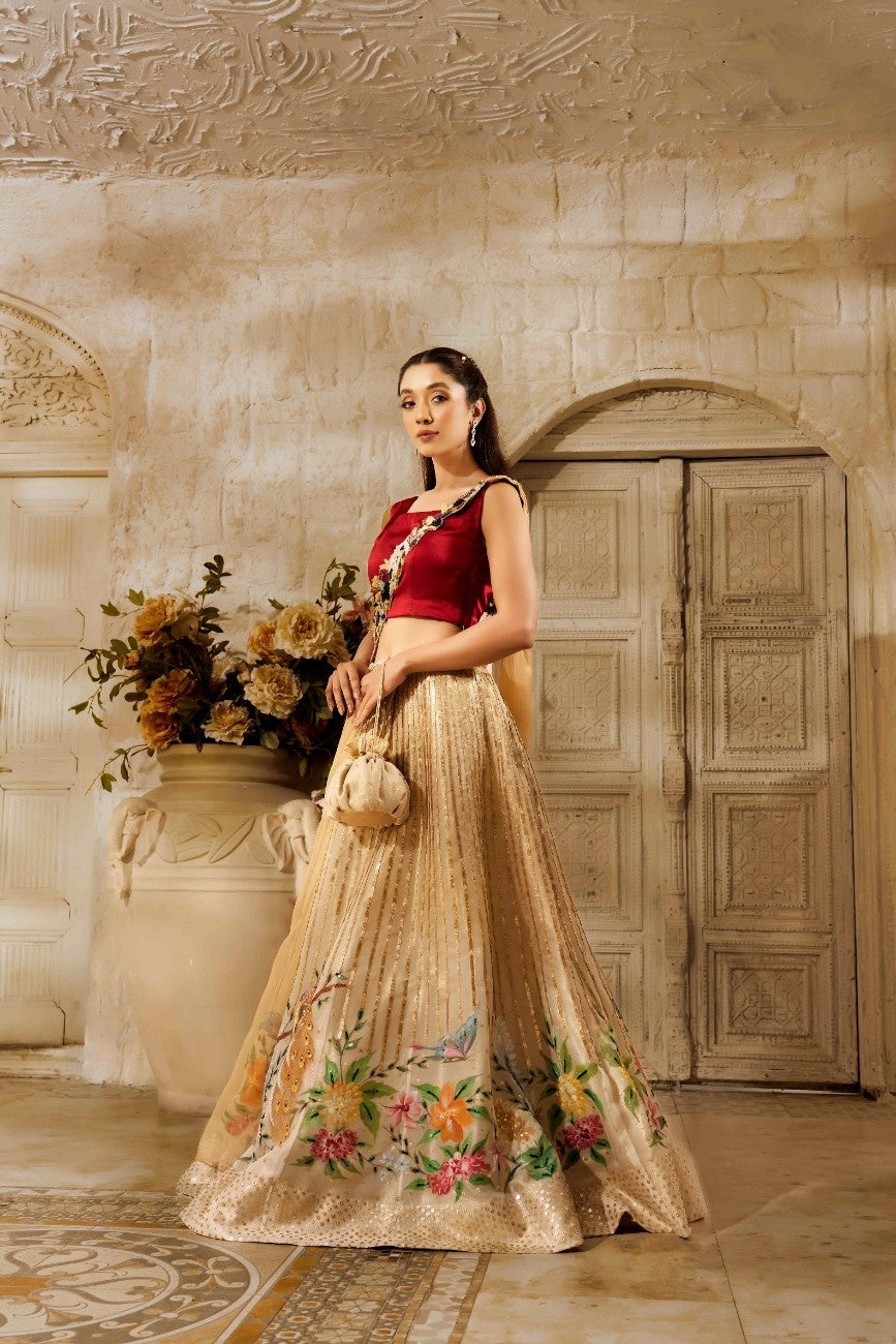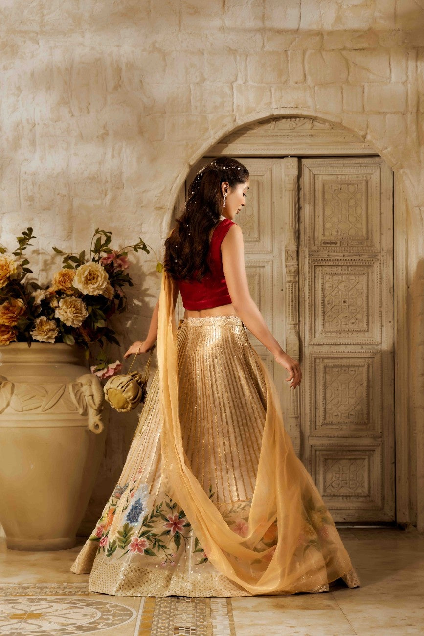 Description:-This intricately hand-painted lehnga donned in luxurious sequence work paired with a burst of three-dimensional hand-embellished floral motifs dupatta is what we must have outfitted this wedding season.