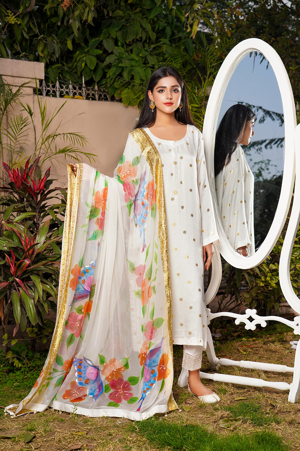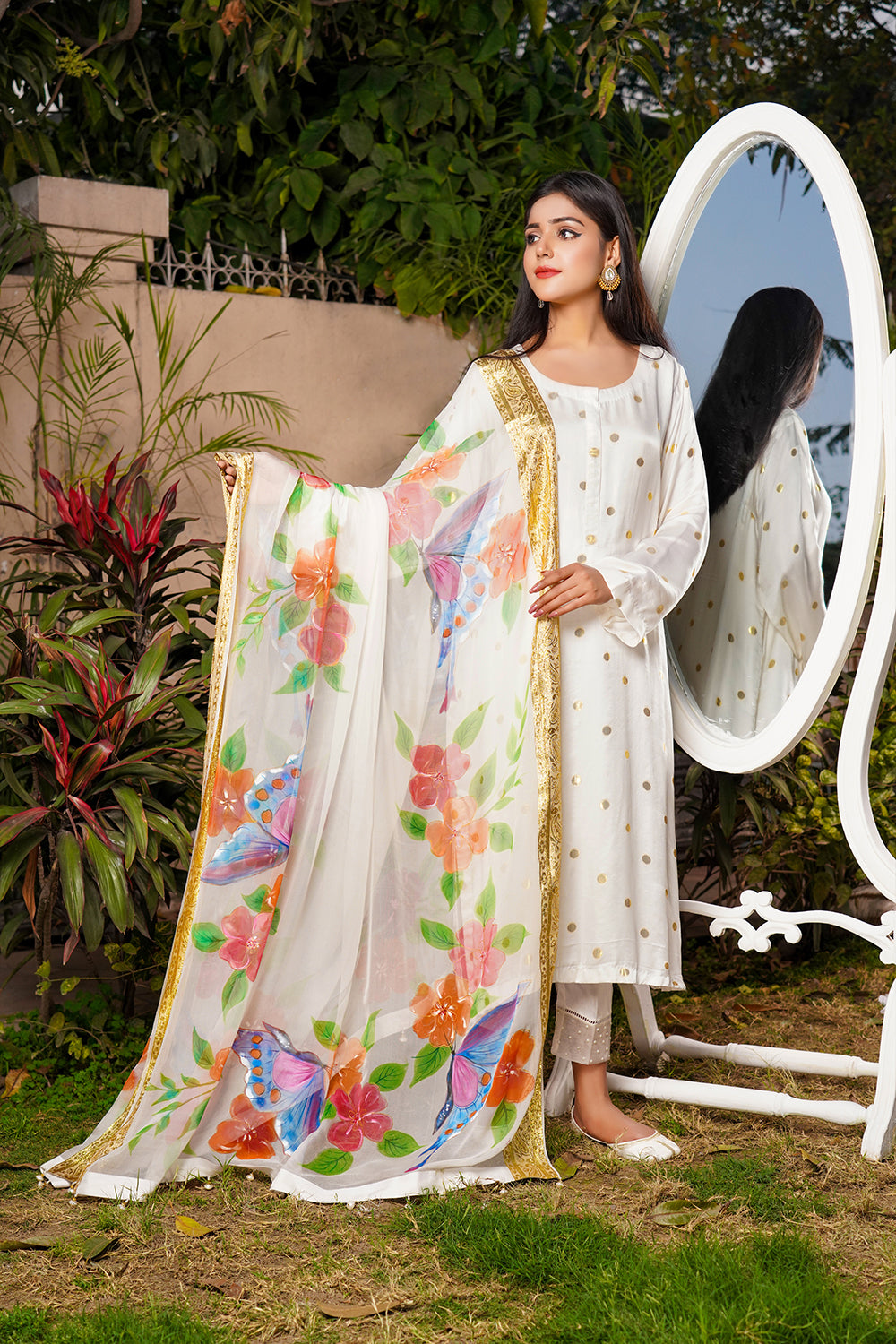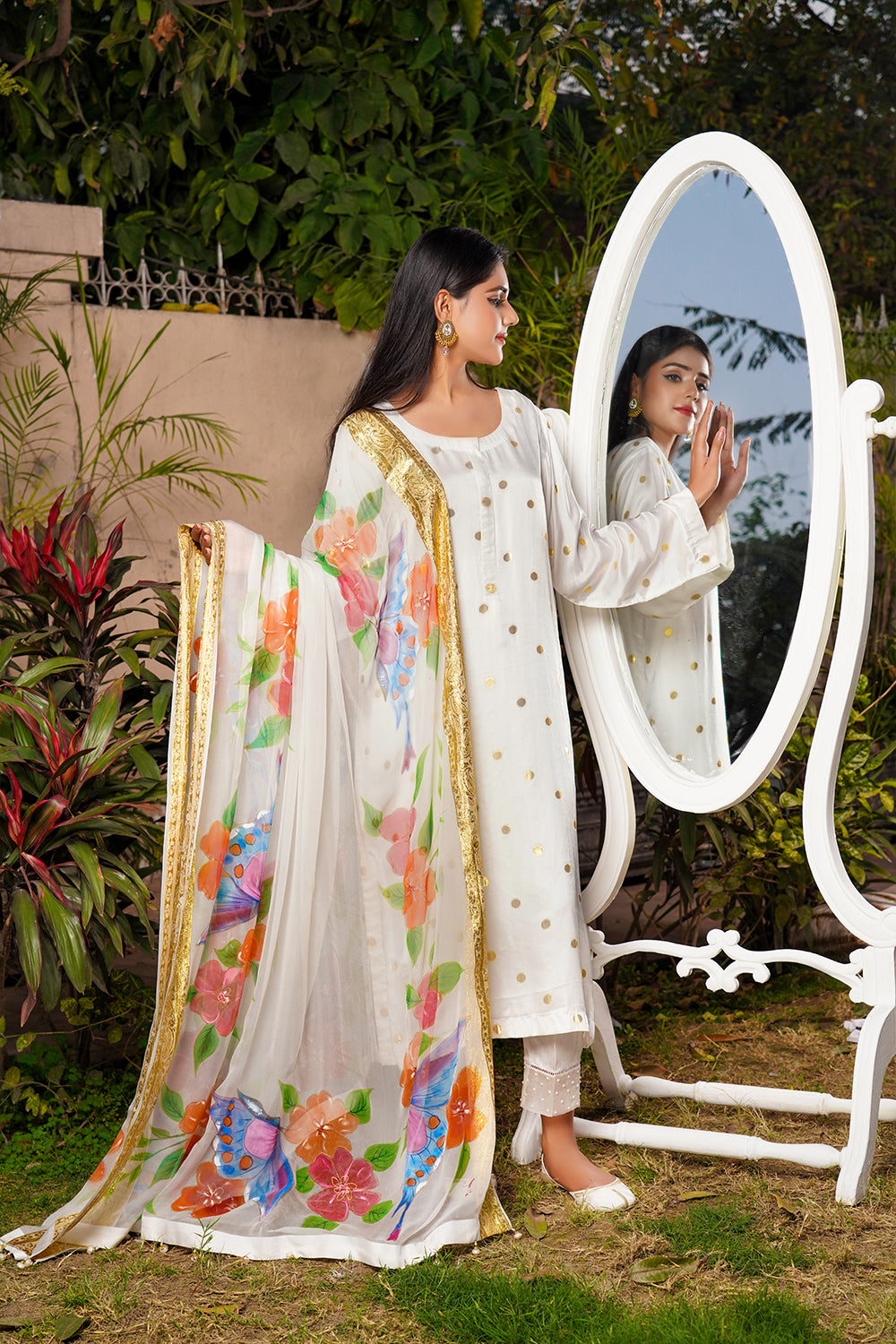 A white silk kurta with gold embellishments worn with matching pure rawsilk trousers. Paired with a hand-painted chiffon dupatta made unique with floral textured motives and soft colors.