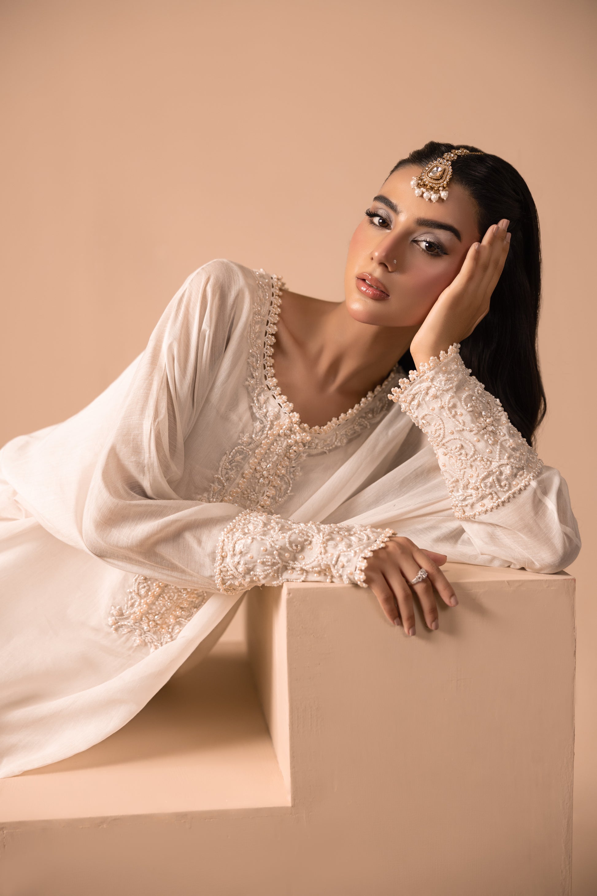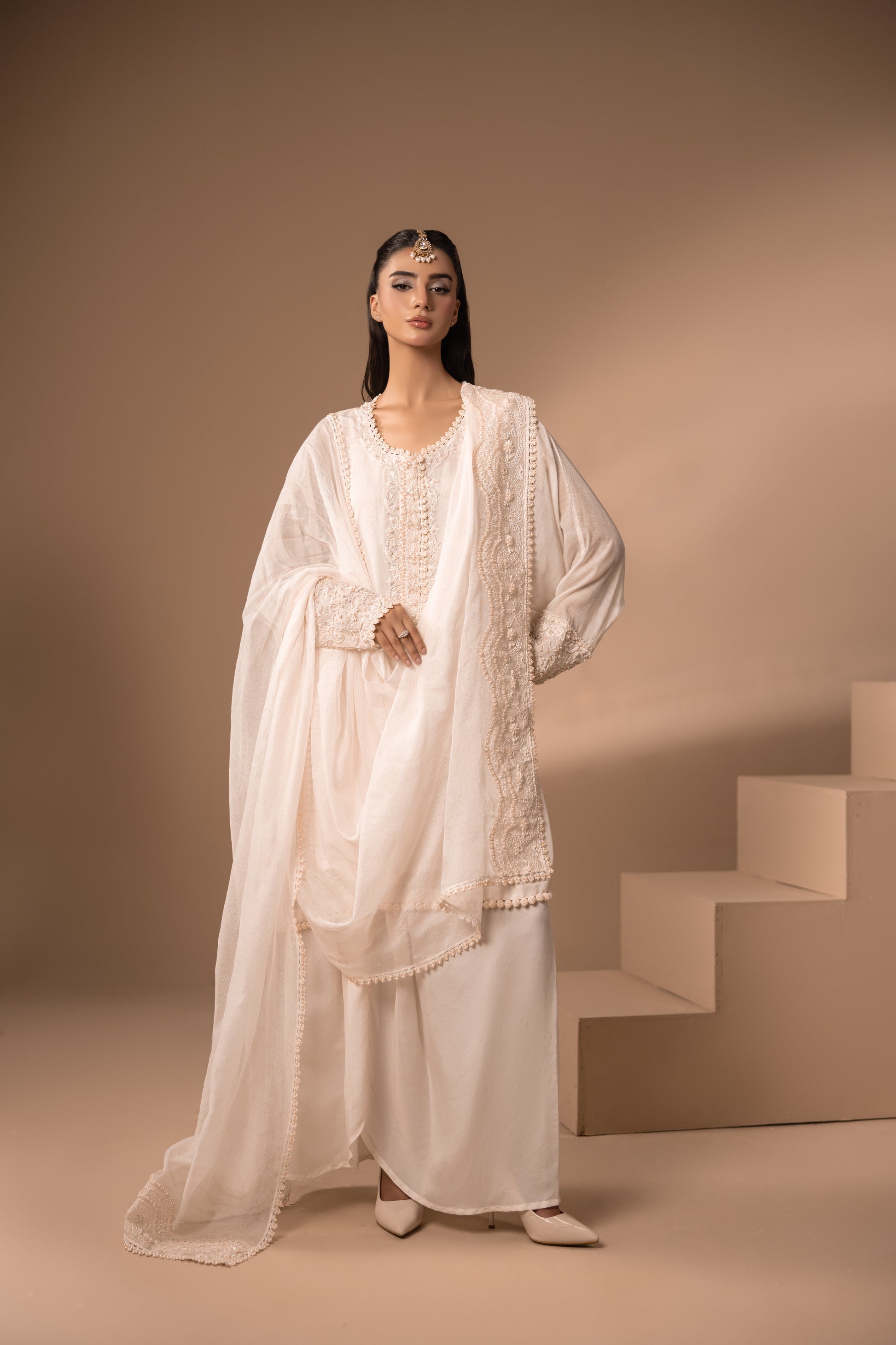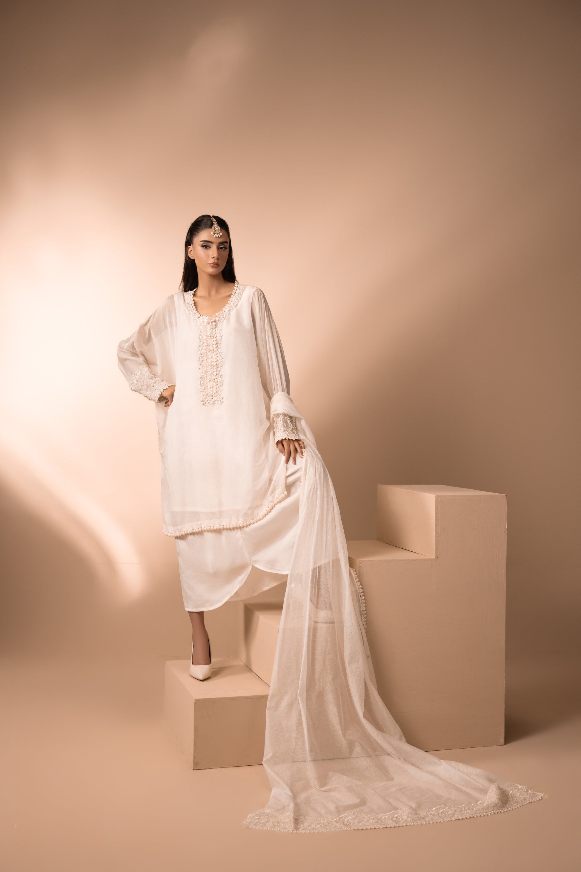 Description: A smart, baggy white kurta delicately adorned with luminous pearls and intricate beadwork, radiating understated elegance. Paired with a gracefully draped dupatta and your choice of chic sarong or classic shalwar, this ensemble embodies effortless sophistication and timeless charm.