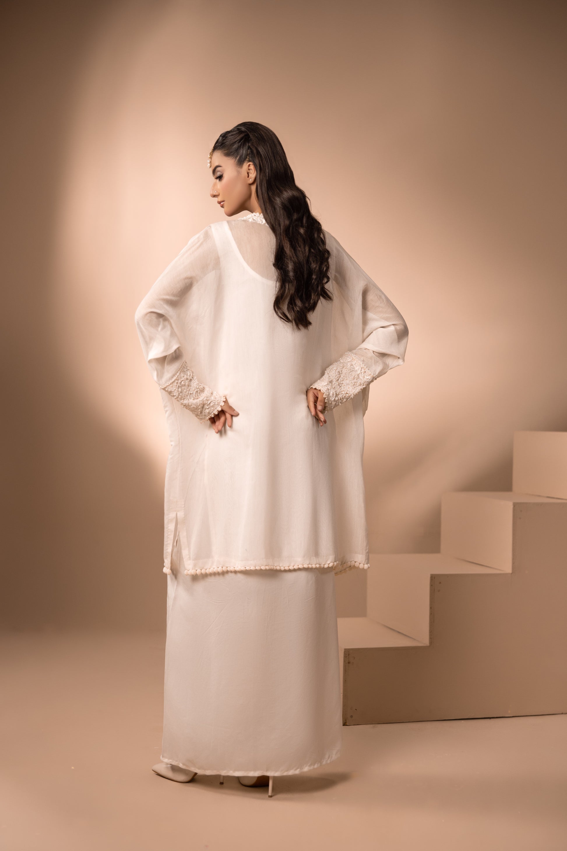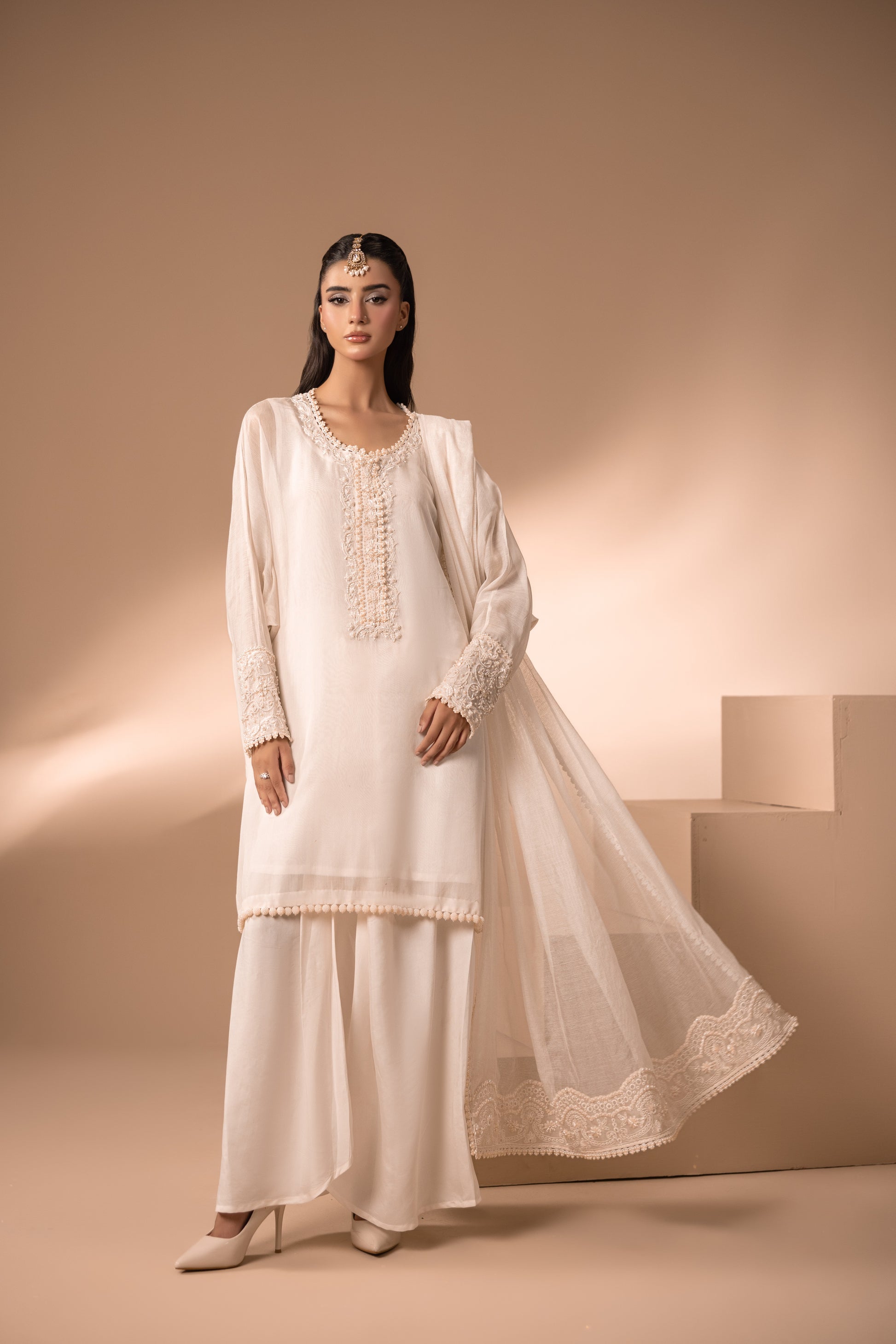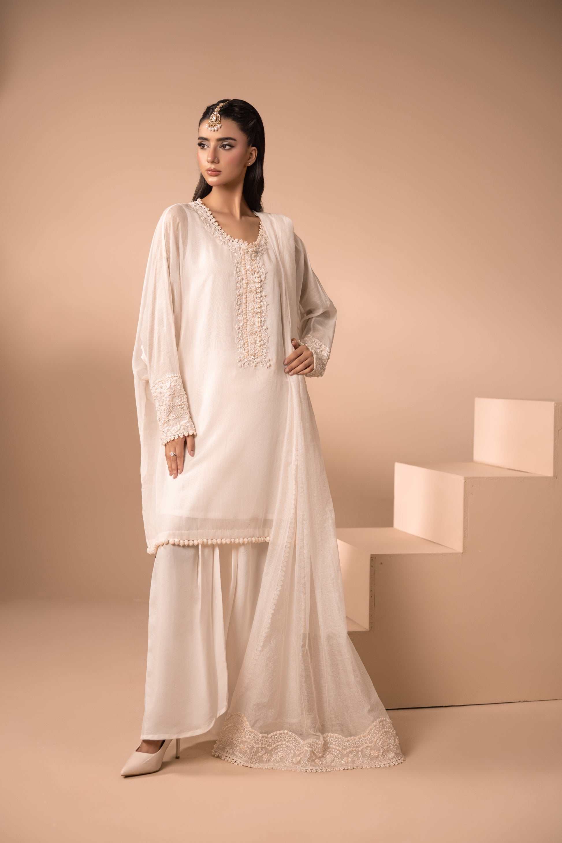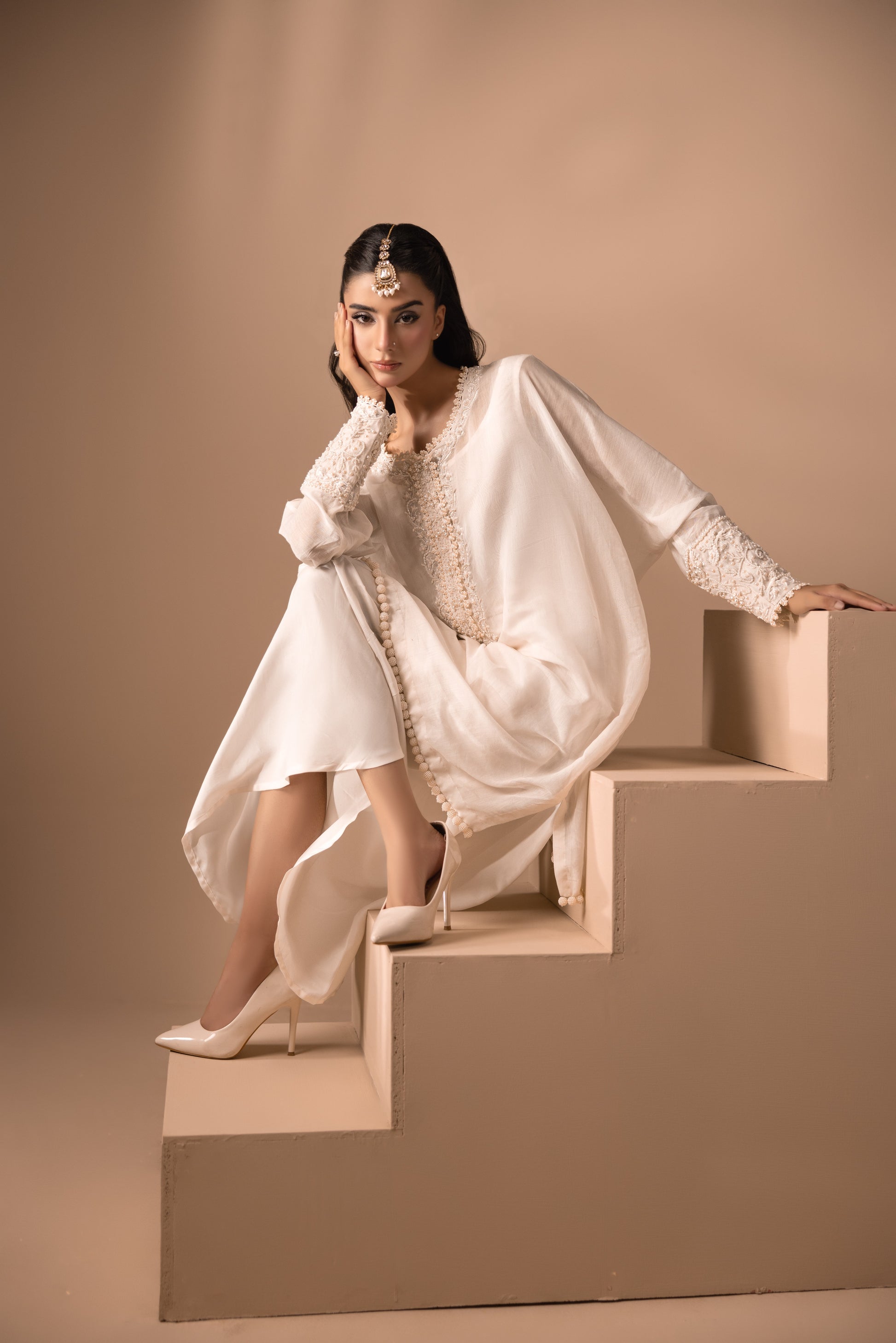 Description: A smart, baggy white kurta delicately adorned with luminous pearls and intricate beadwork, radiating understated elegance. Paired with a gracefully draped dupatta and your choice of chic sarong or classic shalwar, this ensemble embodies effortless sophistication and timeless charm.