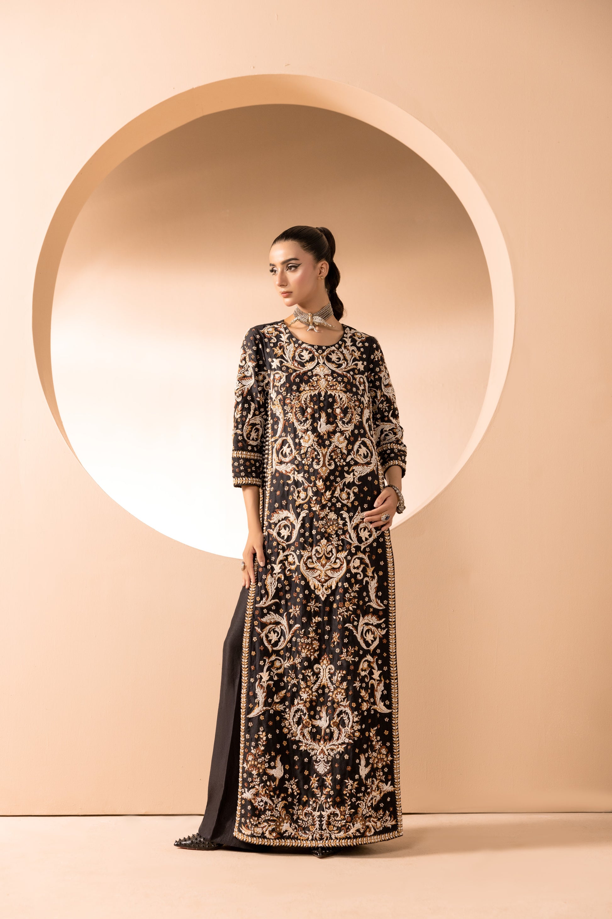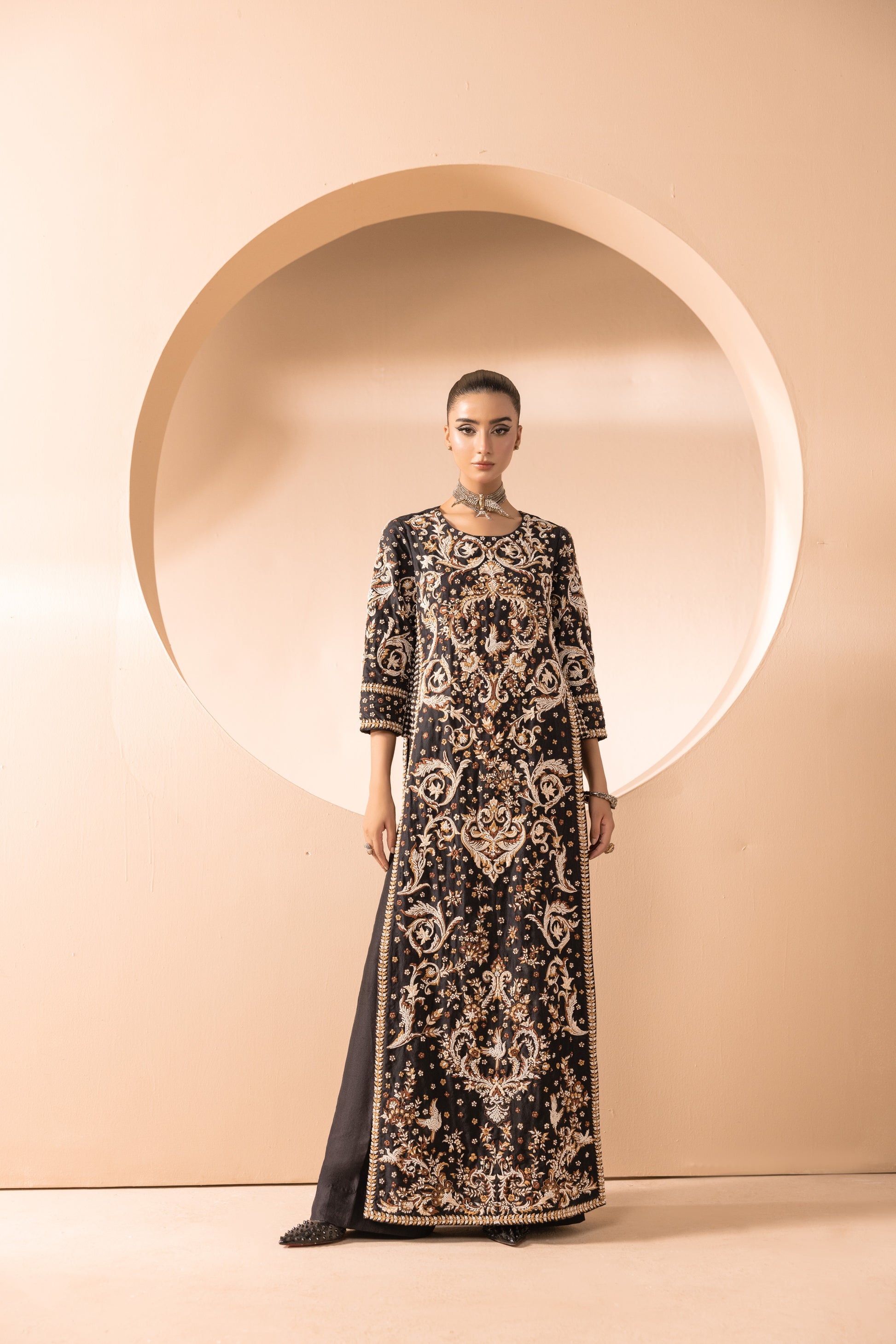 Description: An opulent masterpiece crafted on a deep black canvas, Noir Éclat is adorned with intricate resham embroidery, delicately hand-set pearls, and shimmering sequins. The design comes alive with exquisite bird motifs, symbolizing grace and freedom, woven seamlessly into the regal patterns. Every detail catches the light, exuding timeless grandeur and modern sophistication. A statement silhouette, perfect for evenings where elegance is non-negotiable.