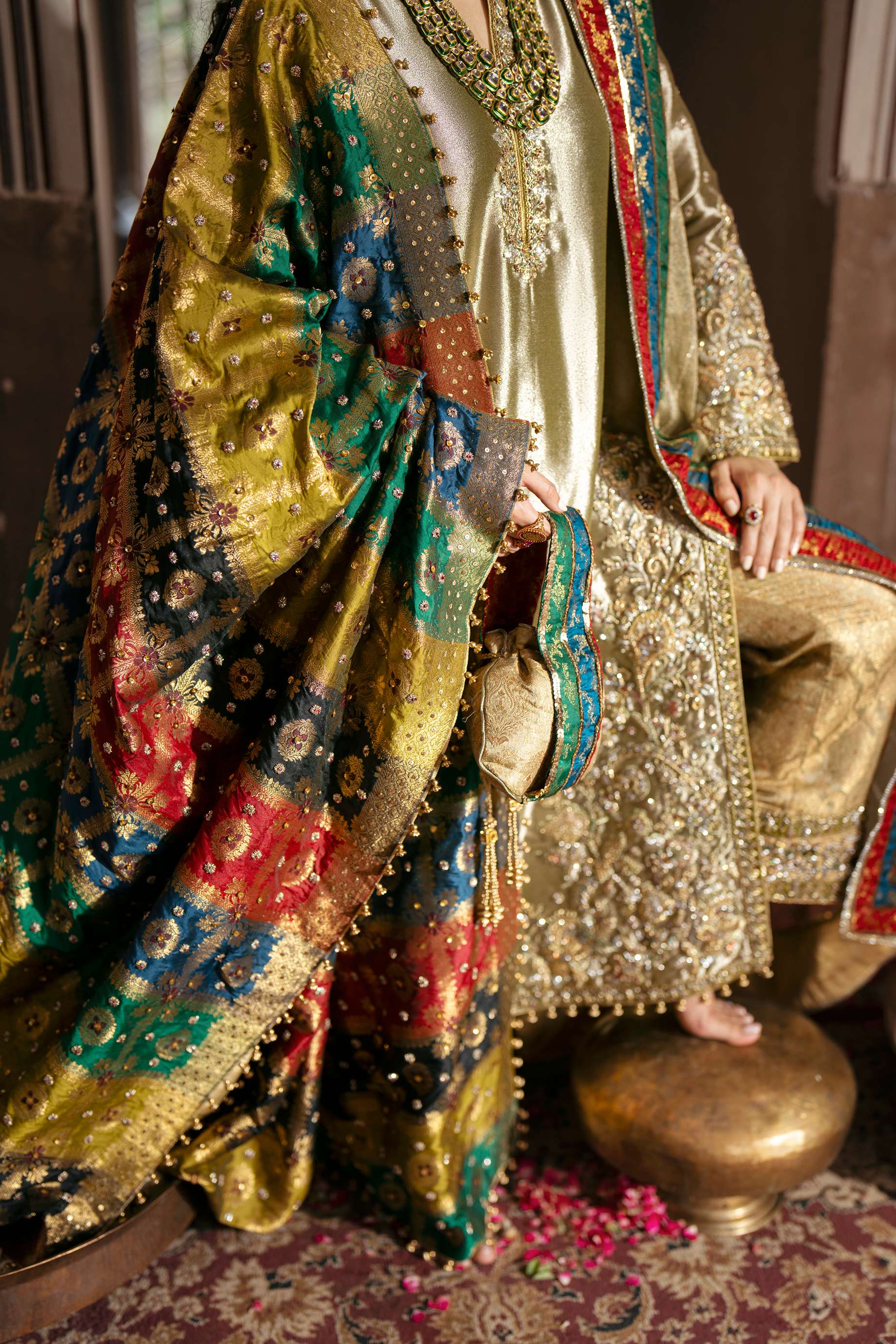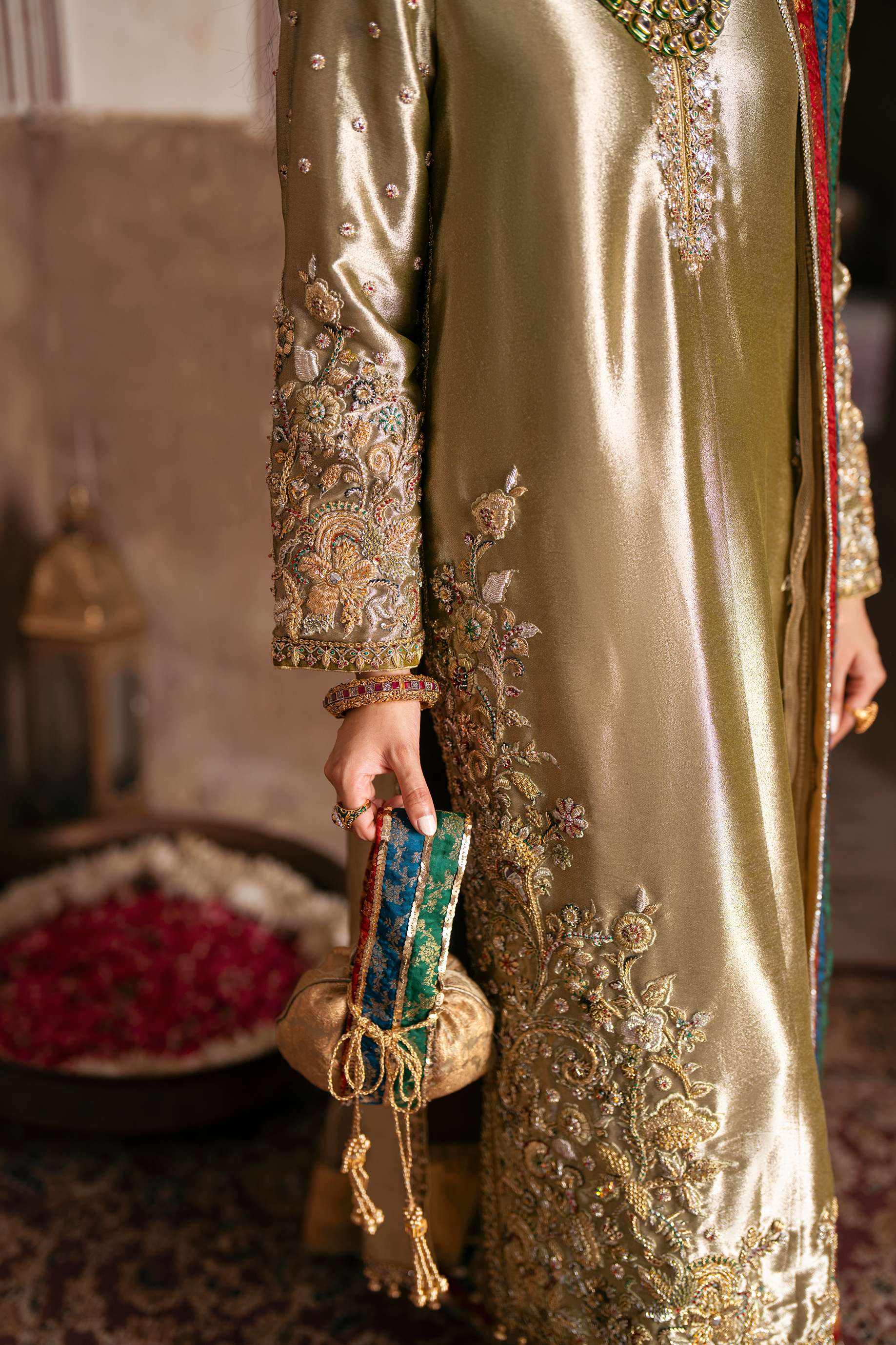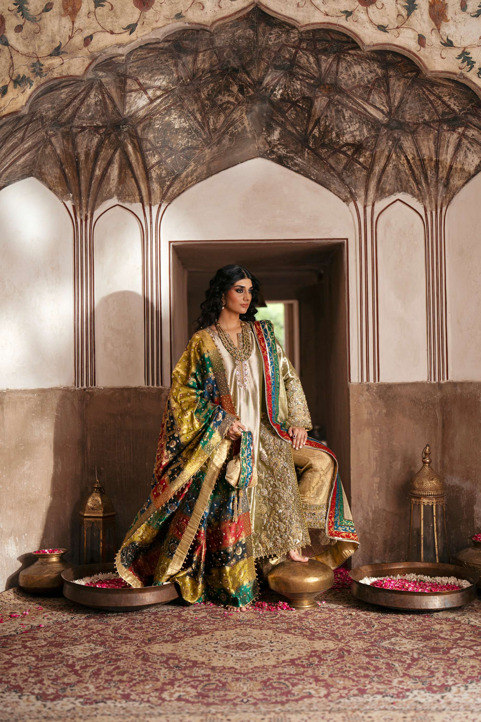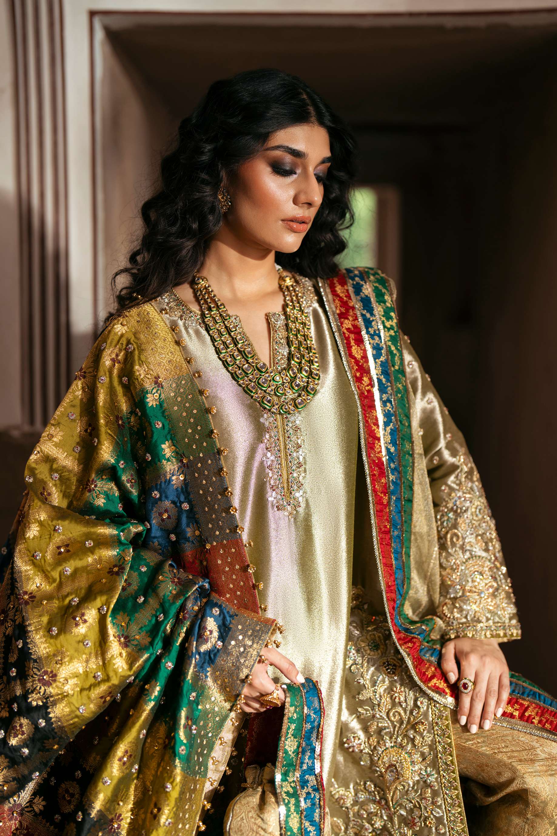 Description: This olive-gold handcrafted dress is embellished with detailed zardozi and resham artistry, each motif echoing heritage craftsmanship. The vibrant multi-hued shawl adds a poetic splash of color, while the extra dupatta elevates the silhouette into a truly majestic statement. A timeless piece for your most unforgettable moments.