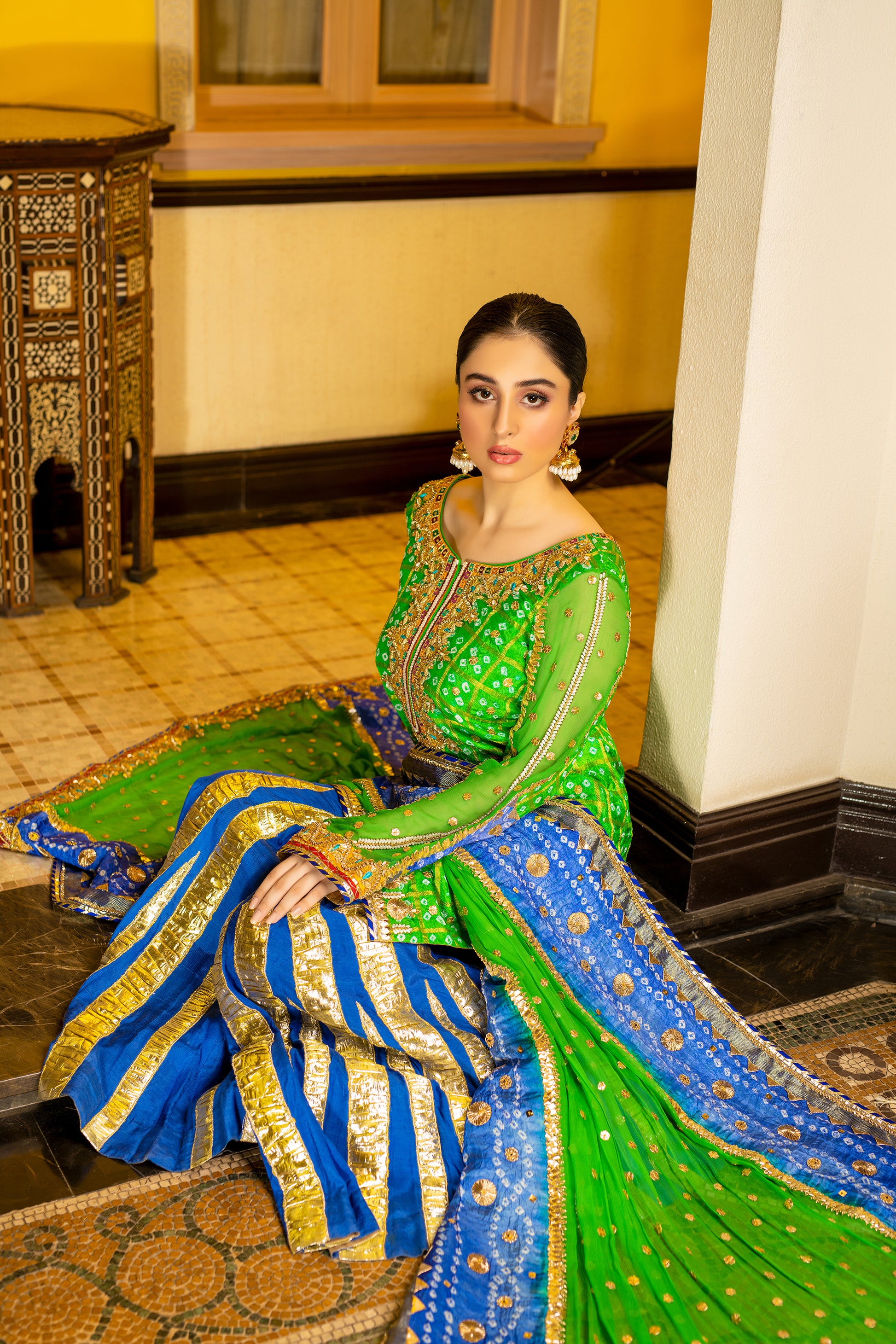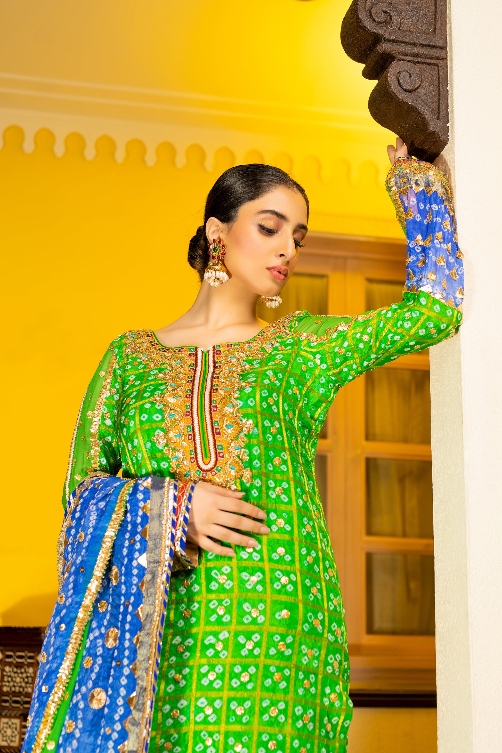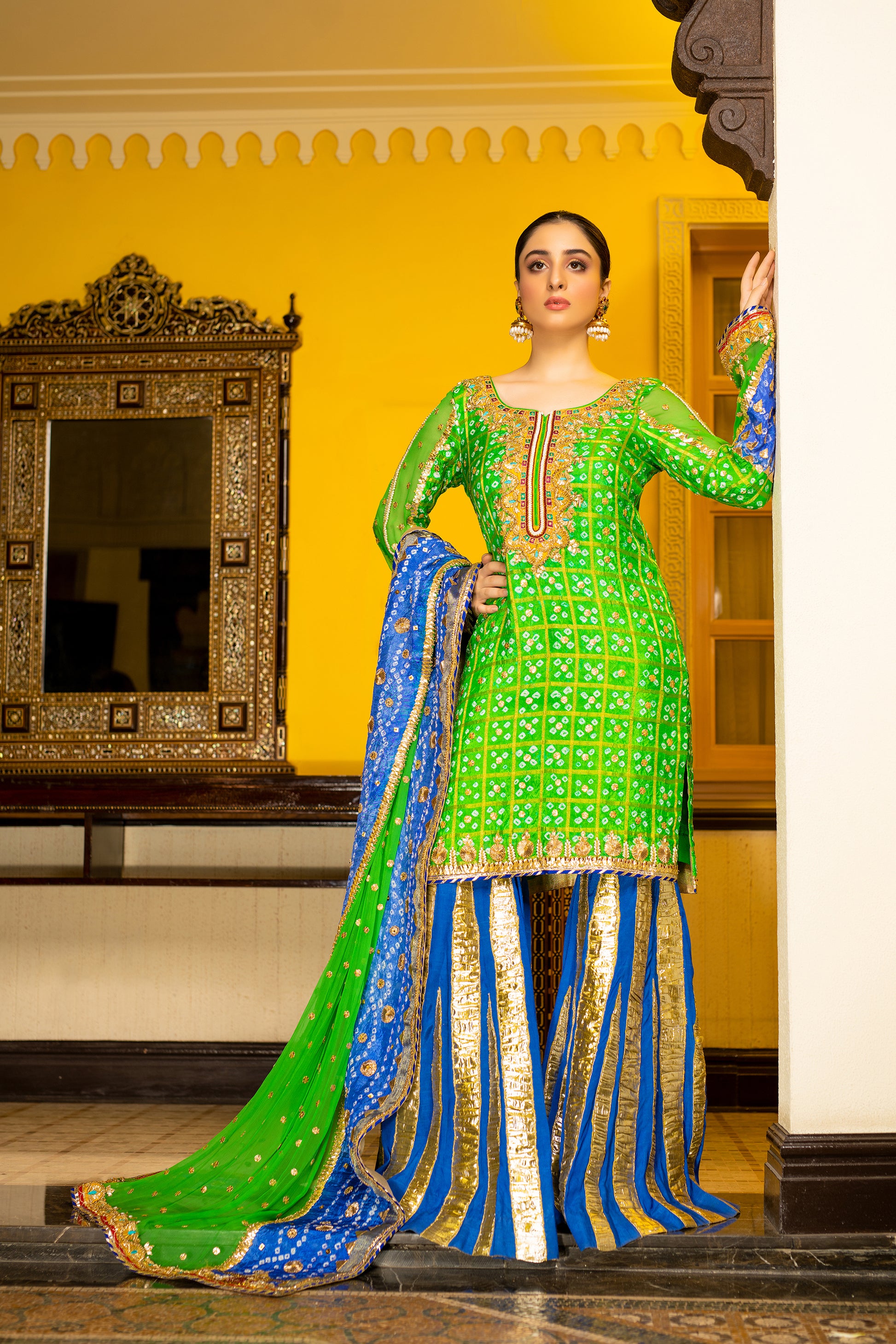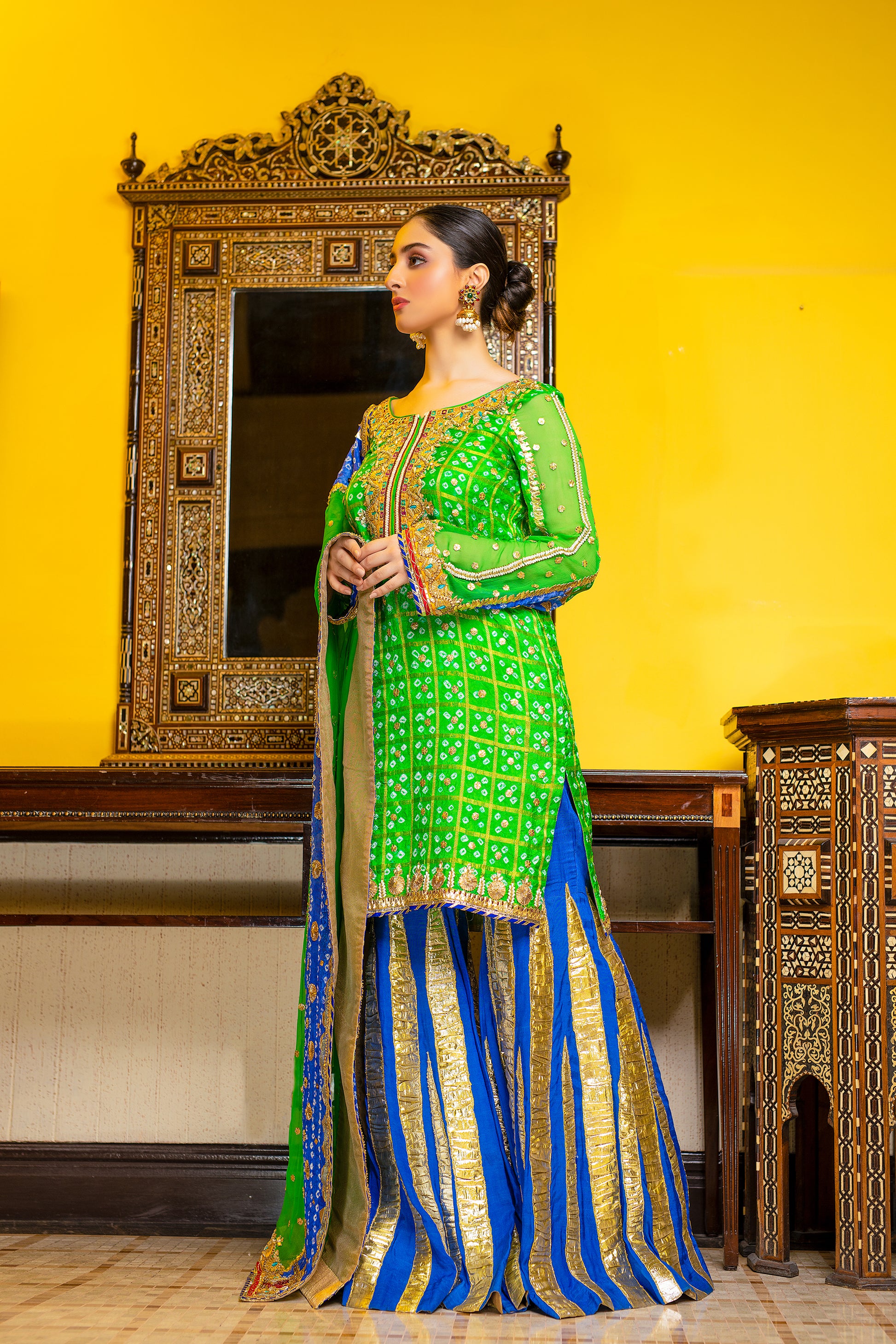 Finished off with striking sharara pants and a unique chunri bordered dupatta.