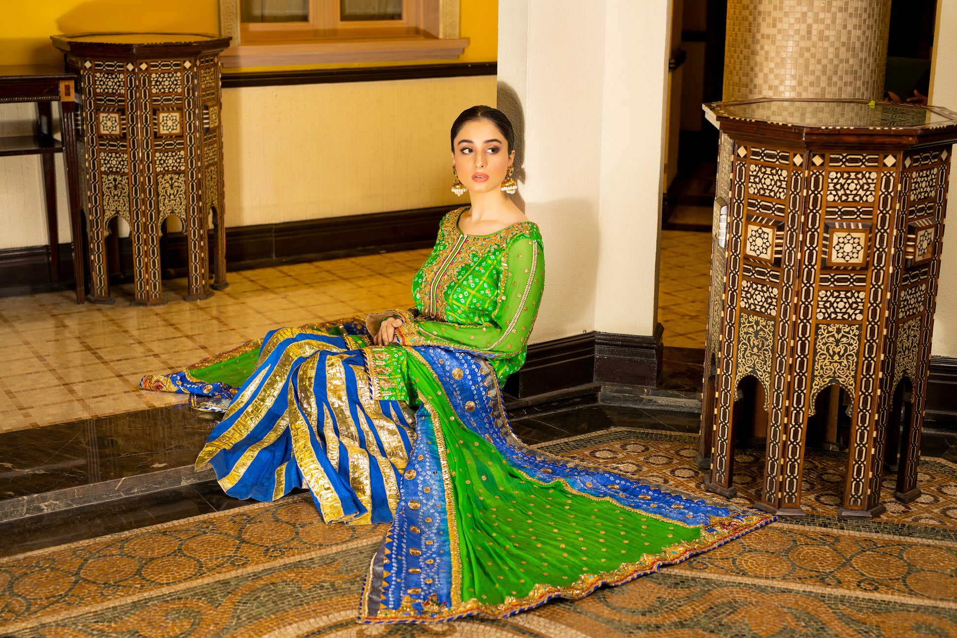 A vibrant number to light up any room you walk into. It is hand worked on gharchola with zardozi, gota, pearls, and sequins.
