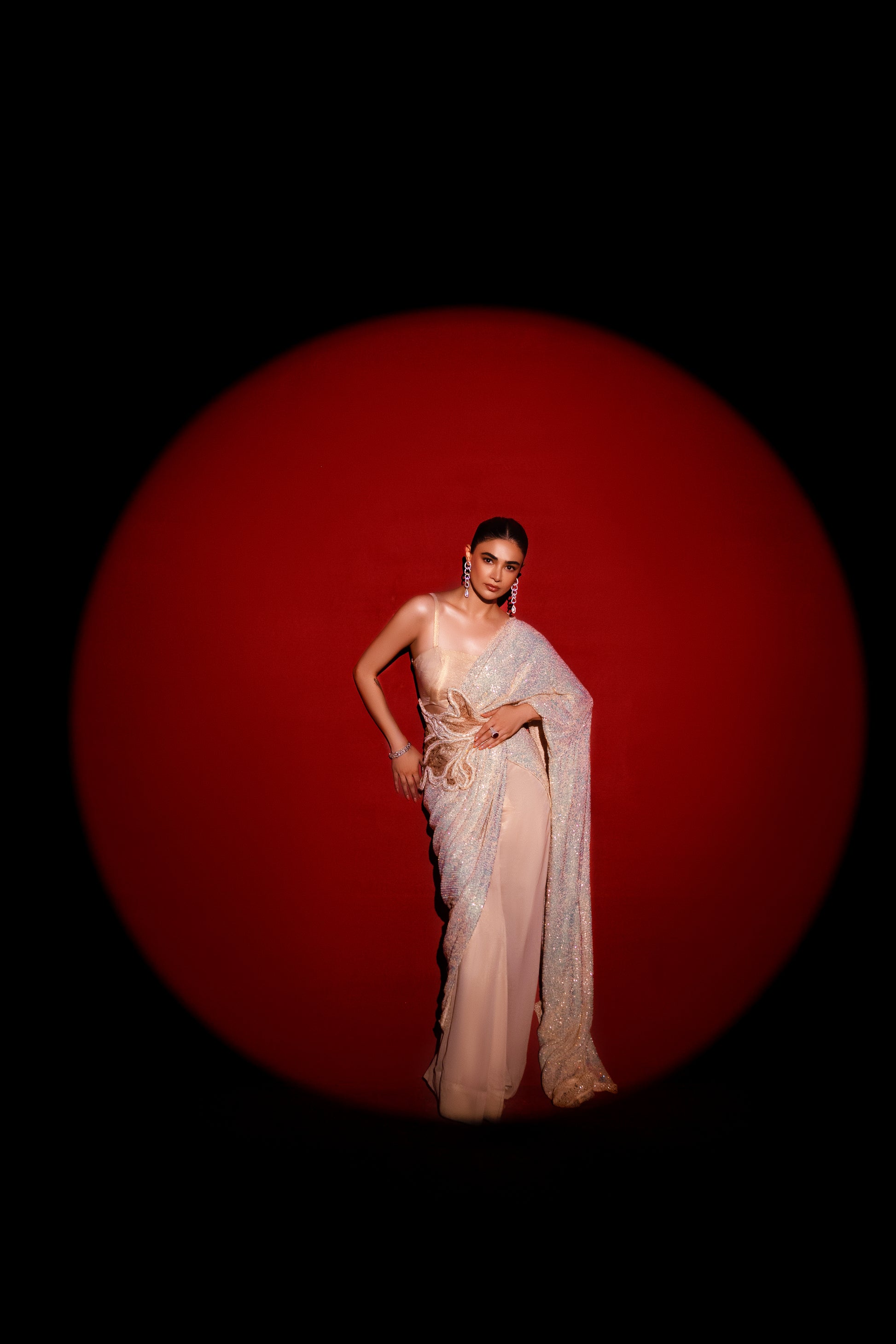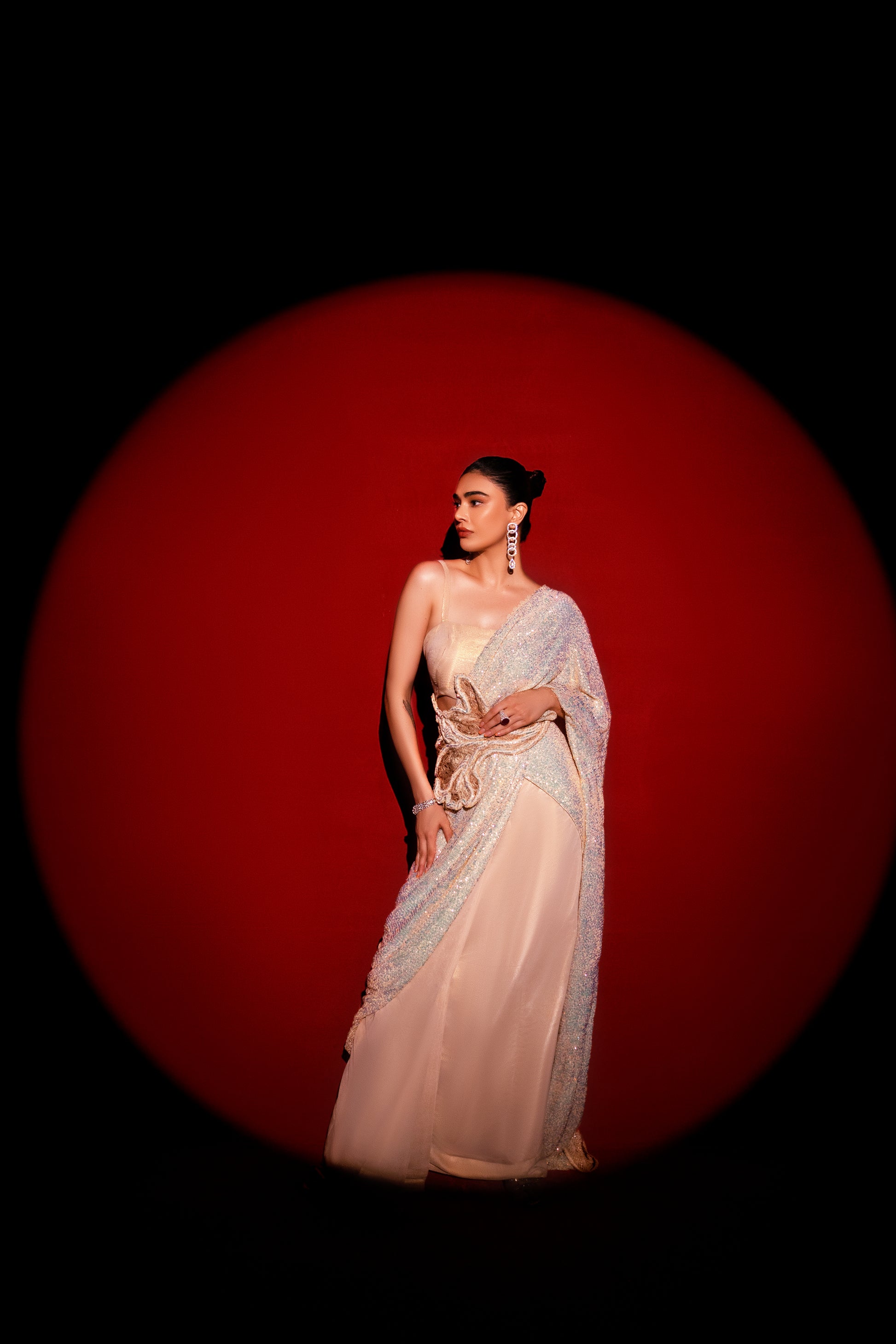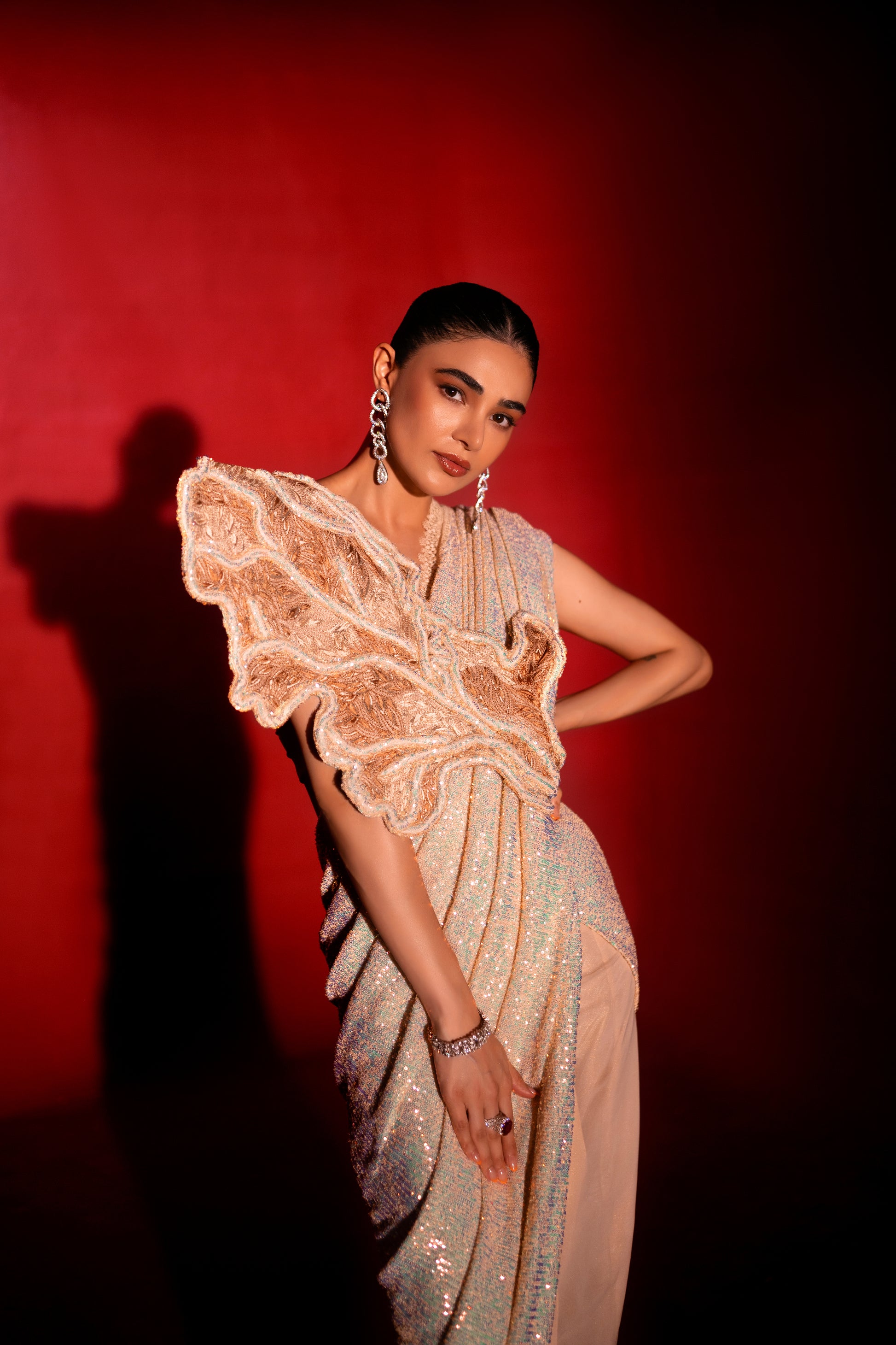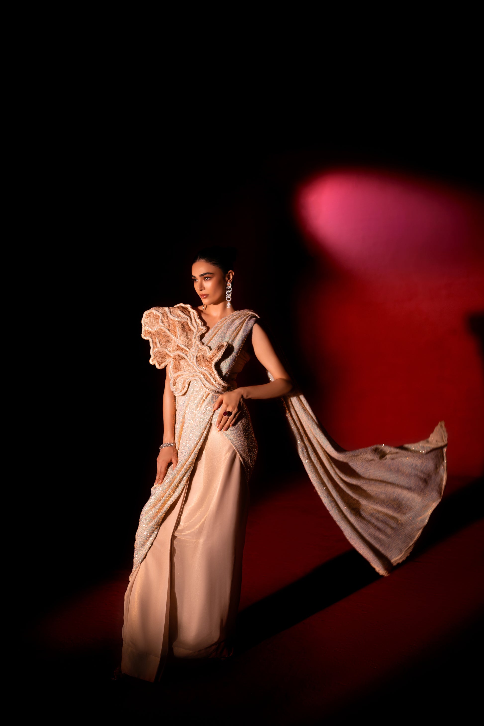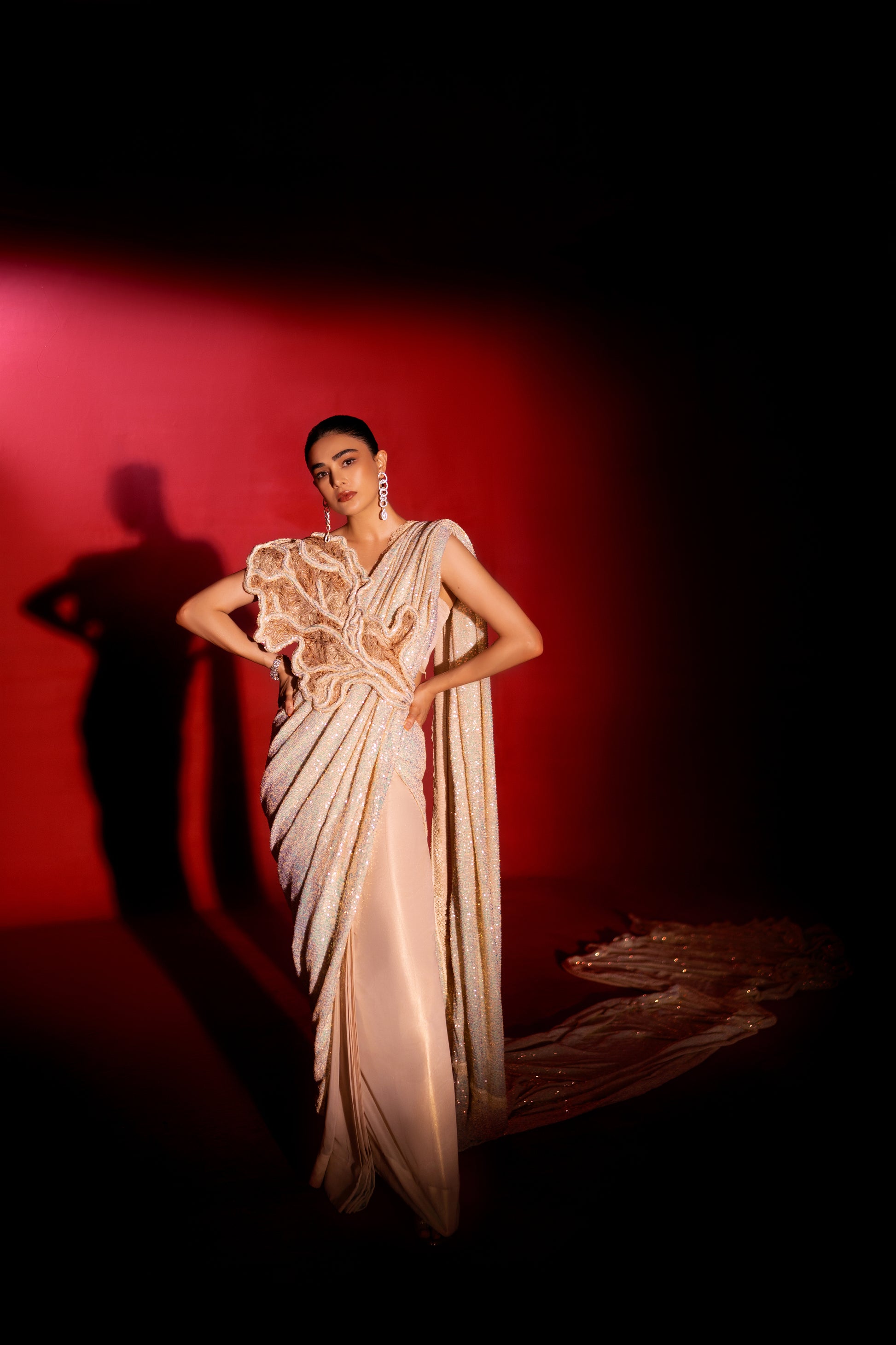 Description: “Breath” - Indulge in our intricate cording and leafing on the beautiful cosmic latte saree, as styled by the oh-so-gorgeous Saheefa Jabbar 🌟