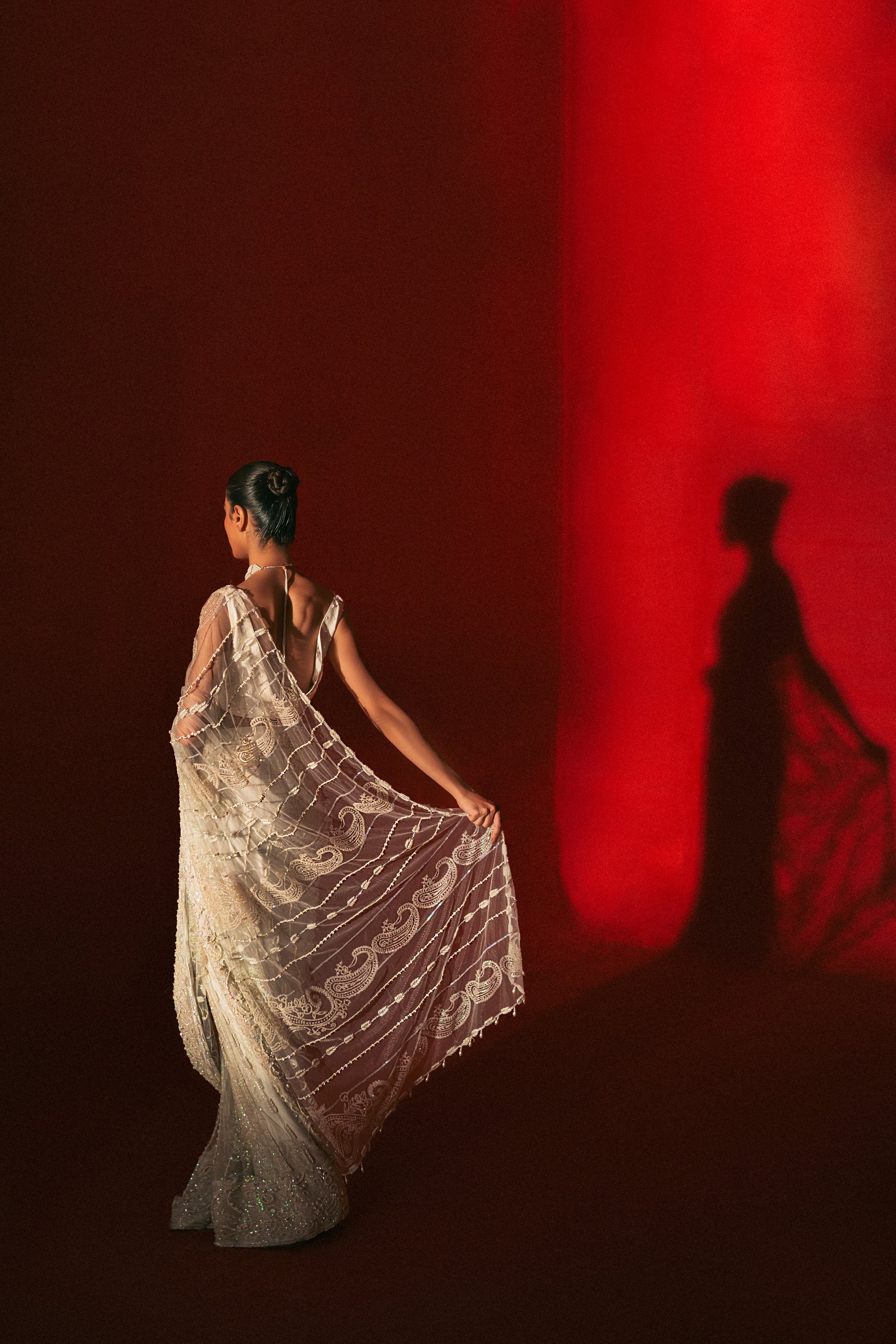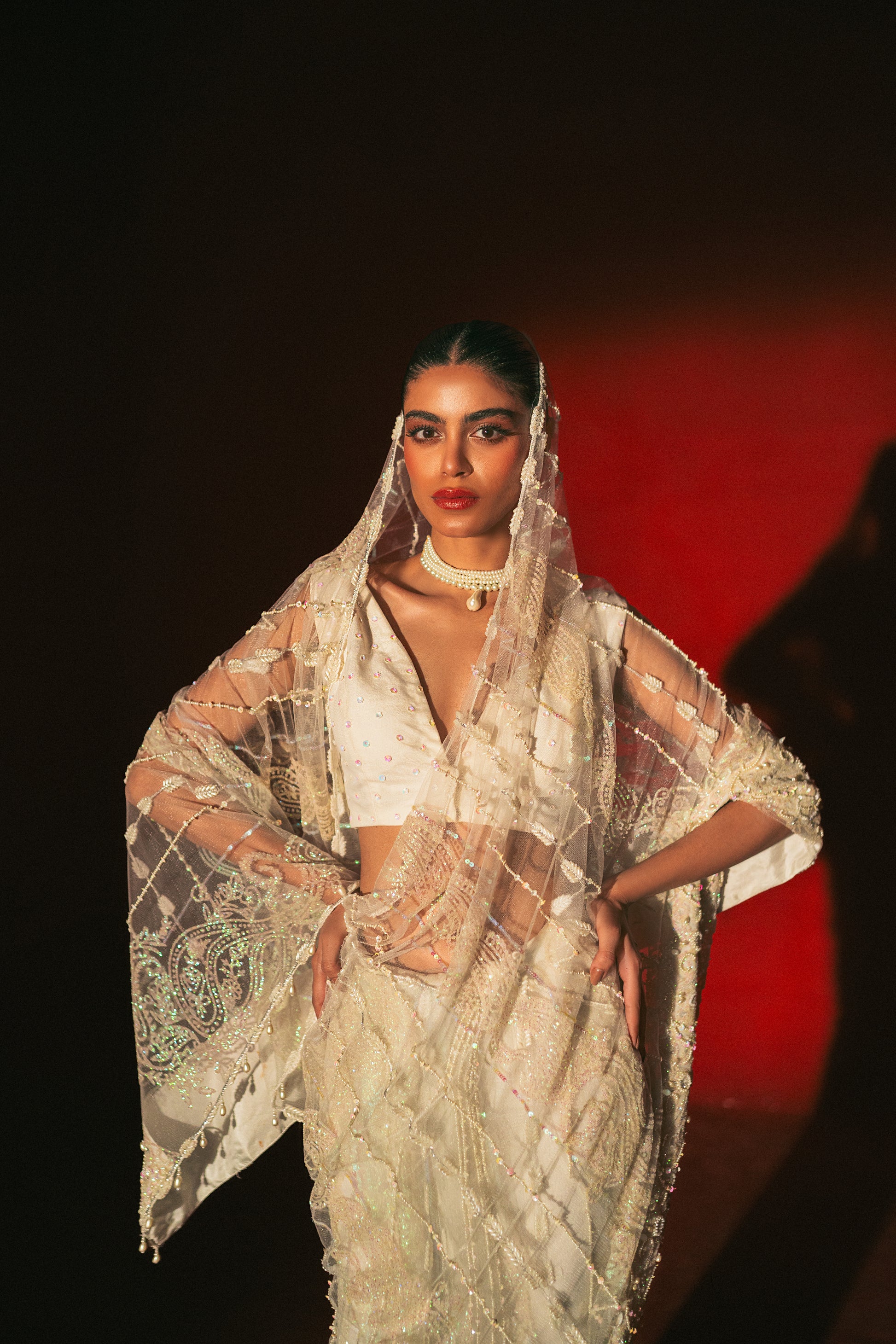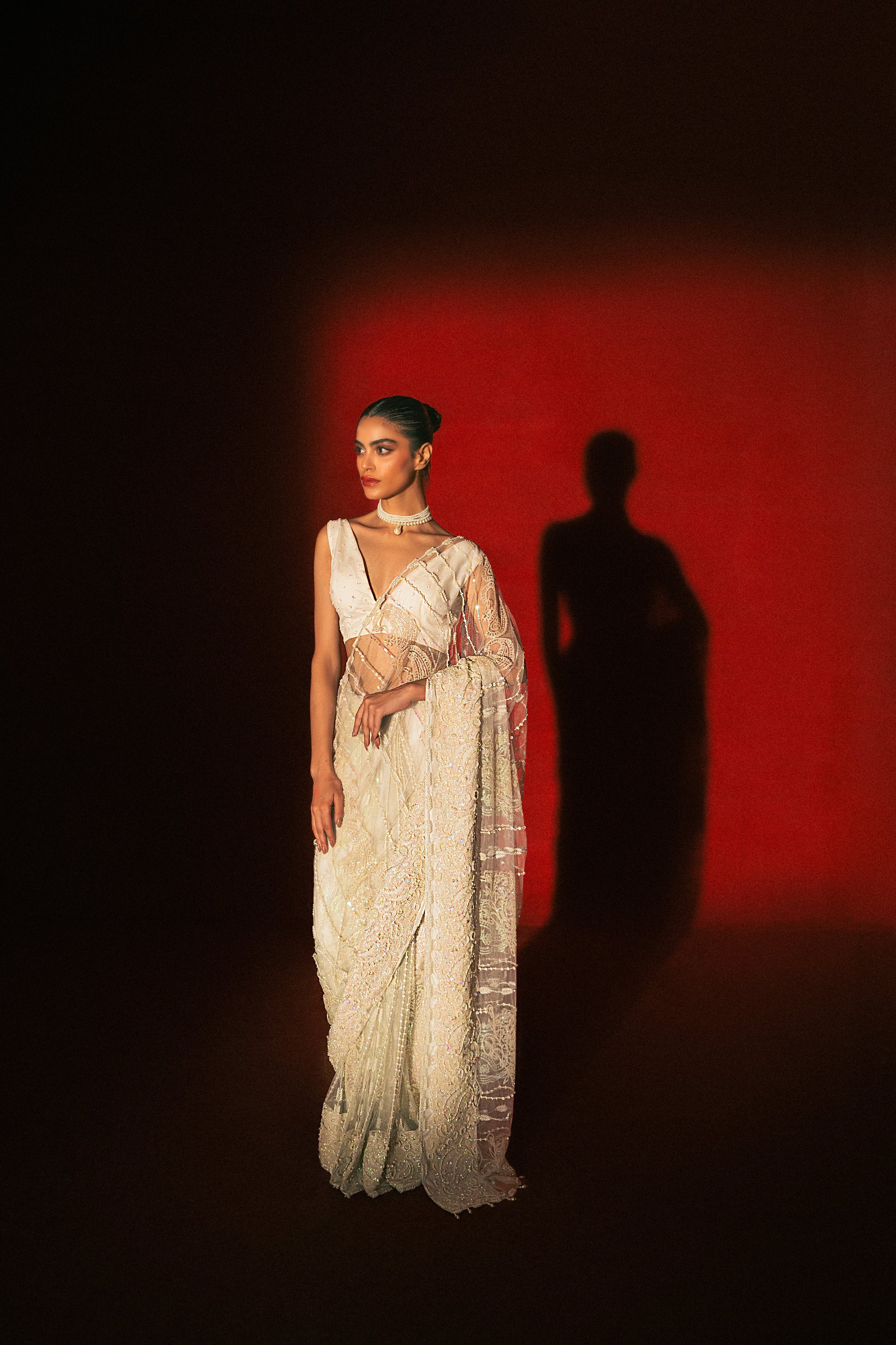 Description: Meet 'Opal' – an ethereal creation in pure pearl white. Each thread woven with passion, this handcrafted marvel is tailored exclusively for you. Opal, a saree of unparalleled opulence, adorned with lustrous pearls and delicate sequin work. Experience sophistication redefined, curated just for the discerning you. Elevate your style, embrace the allure.