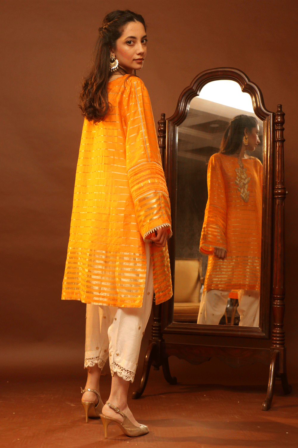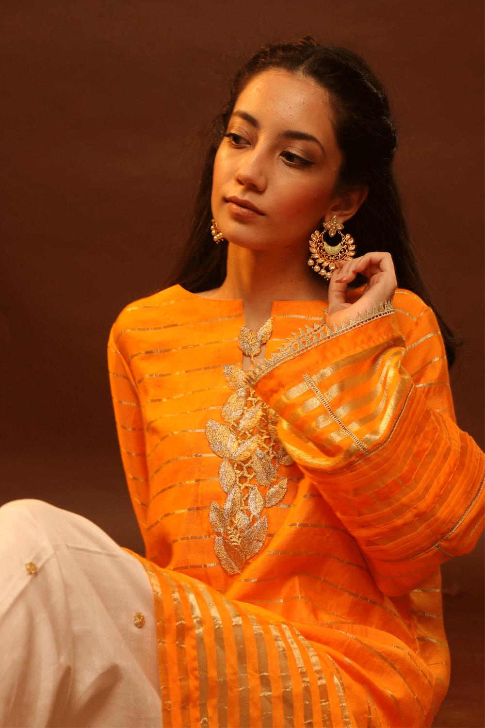 Description: This article from our Eid Collection is embellished with gold and silver tilla leaves on the neckline and finished with gota detailing on the sleeves.