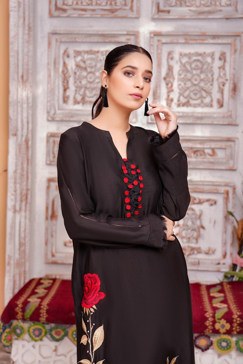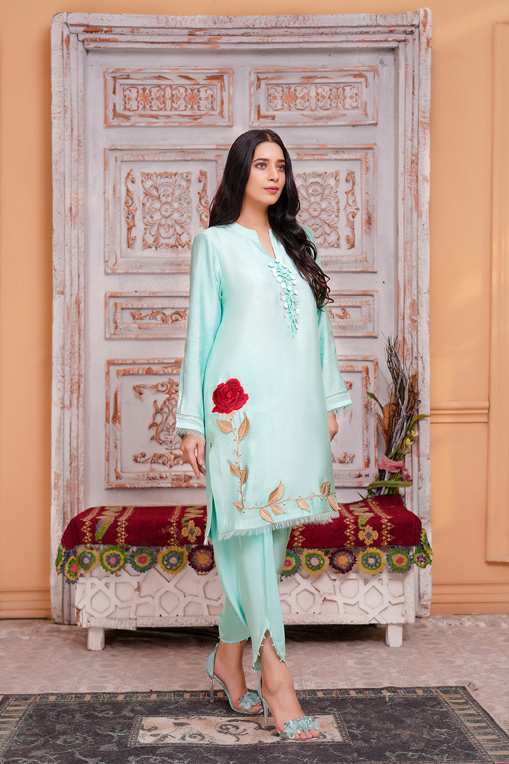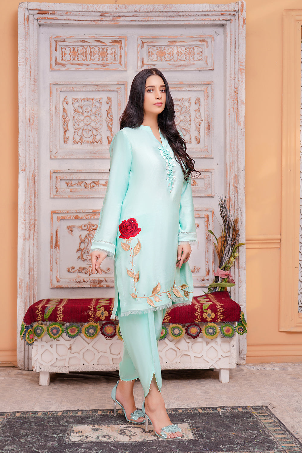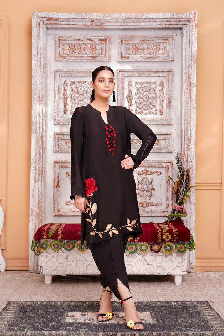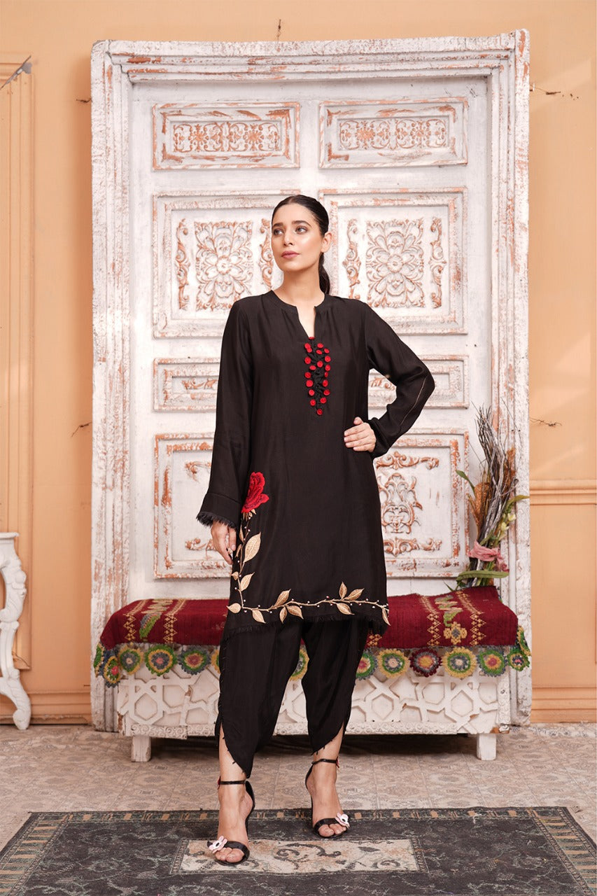 Description: Inspired by the intricacies of roses, this breathtaking ensemble with an embroidered Resham sequence rose motif is drenched in 3d tilla leaves. Along with a hand-made center, Patti is crafted with knotting and cording techniques.