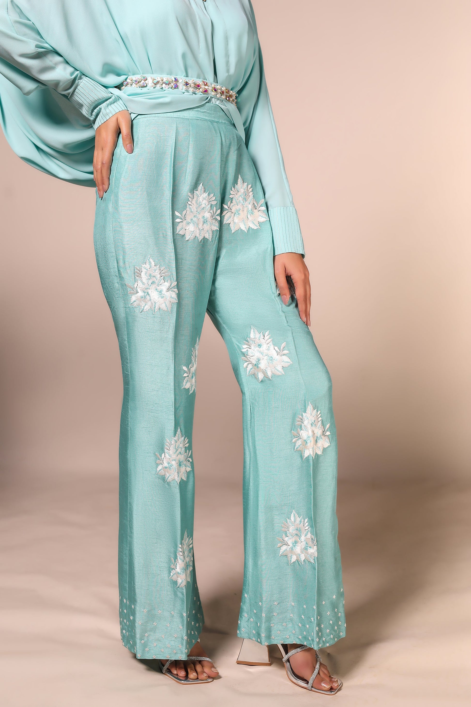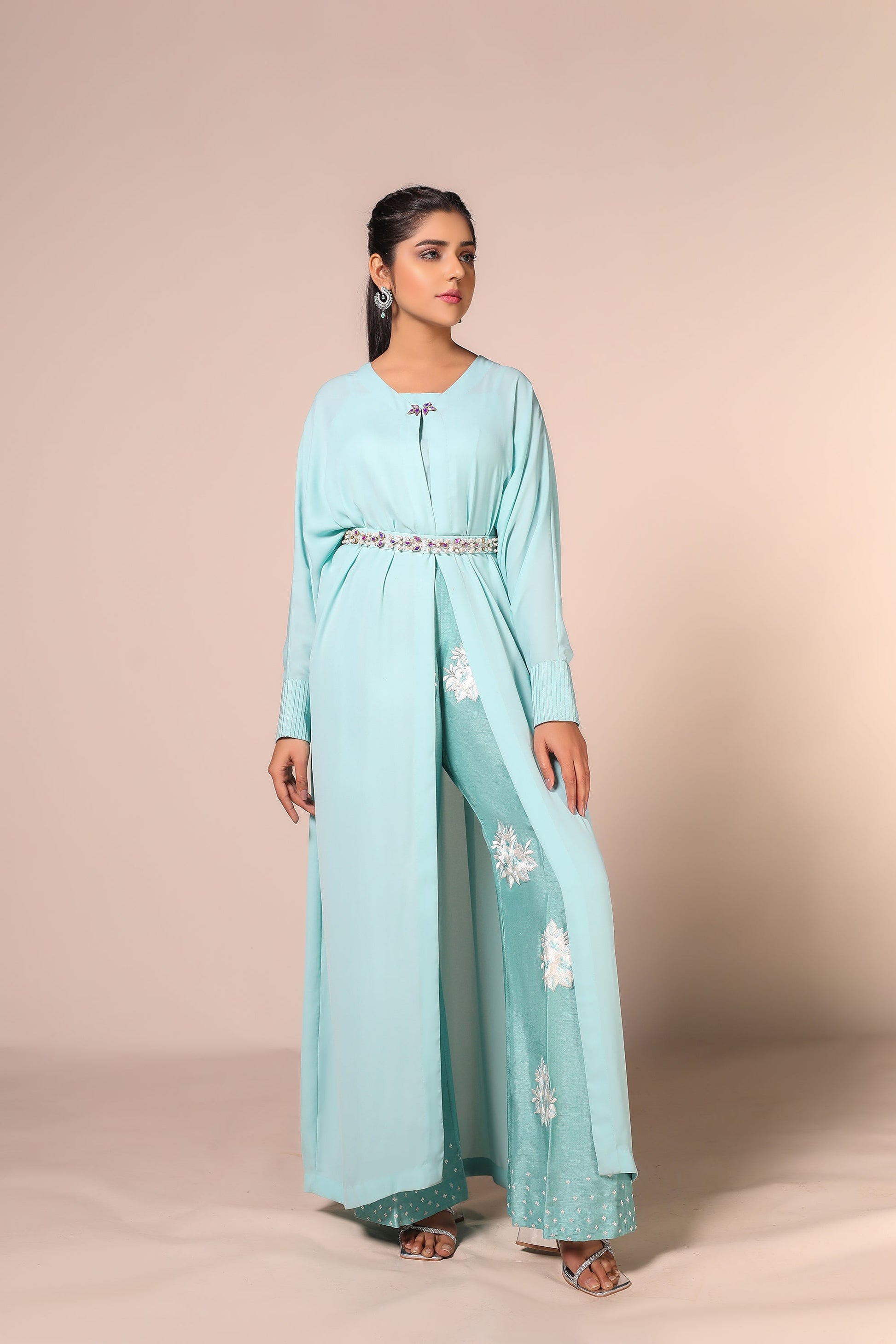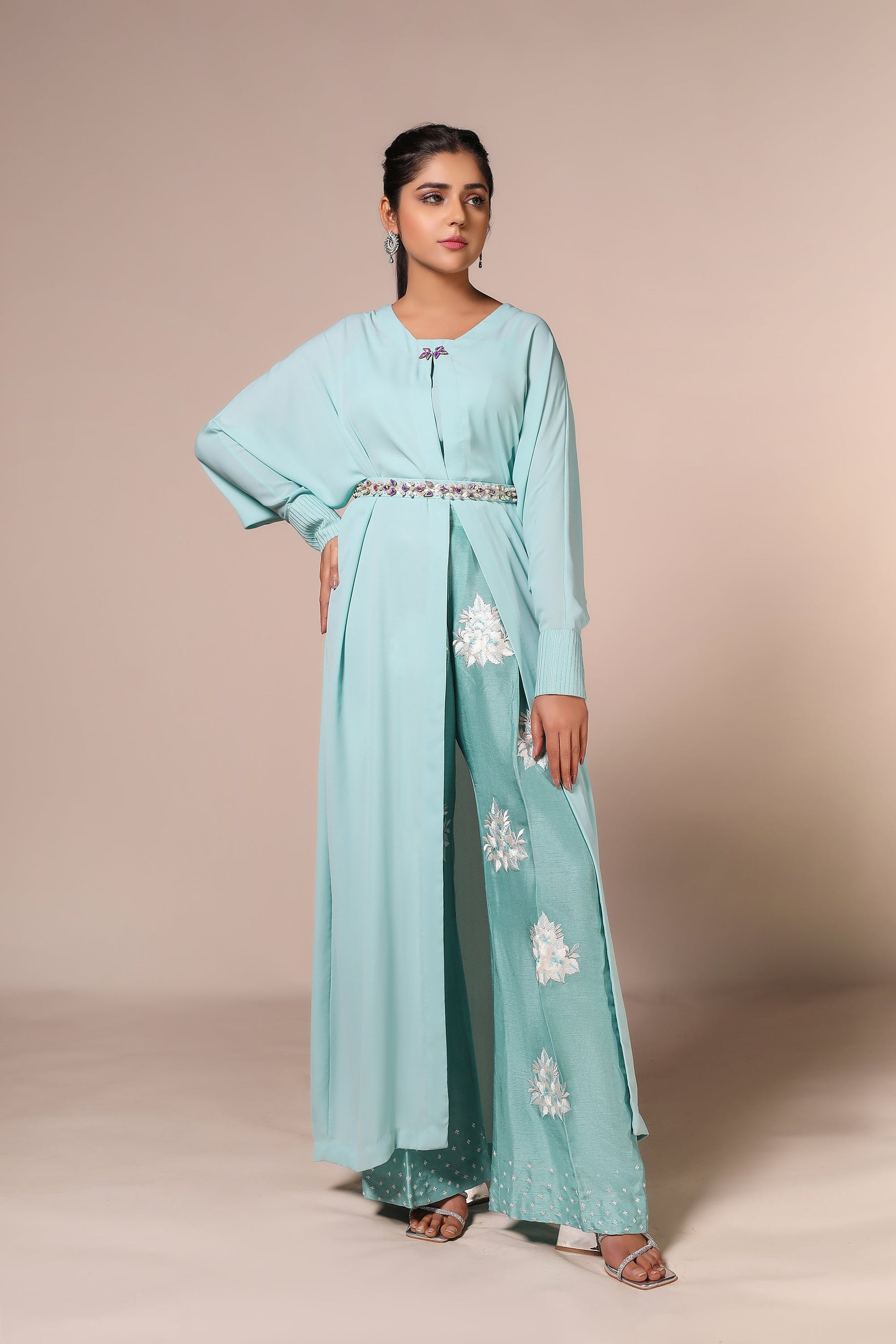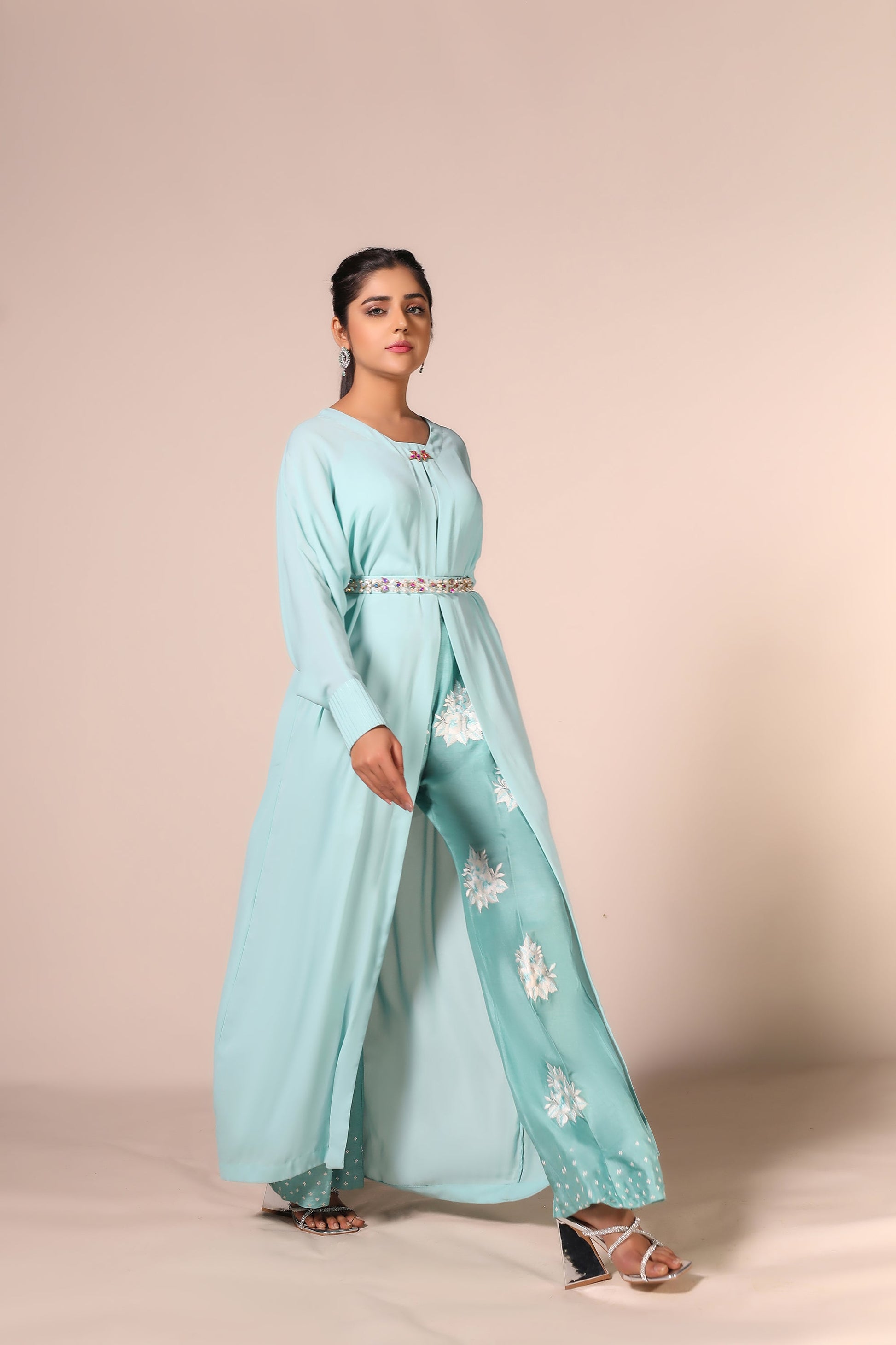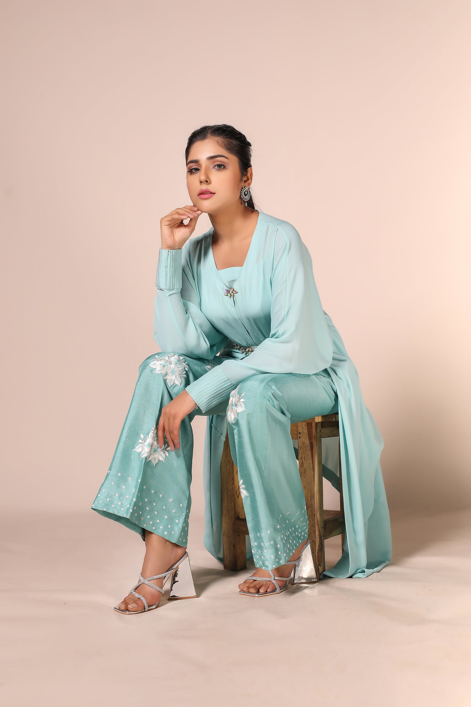 Embrace modern sophistication with our latest ensemble from Mehreen Mirza. A long, baggy jacket adorned with a Swarovski crystal belt, paired with intricately embroidered bootcut pants, creates the perfect fusion of contemporary style and traditional craftsmanship. Indulge in our heritage handwork, while standing out with a fresh, chic look that is sure to turn heads.