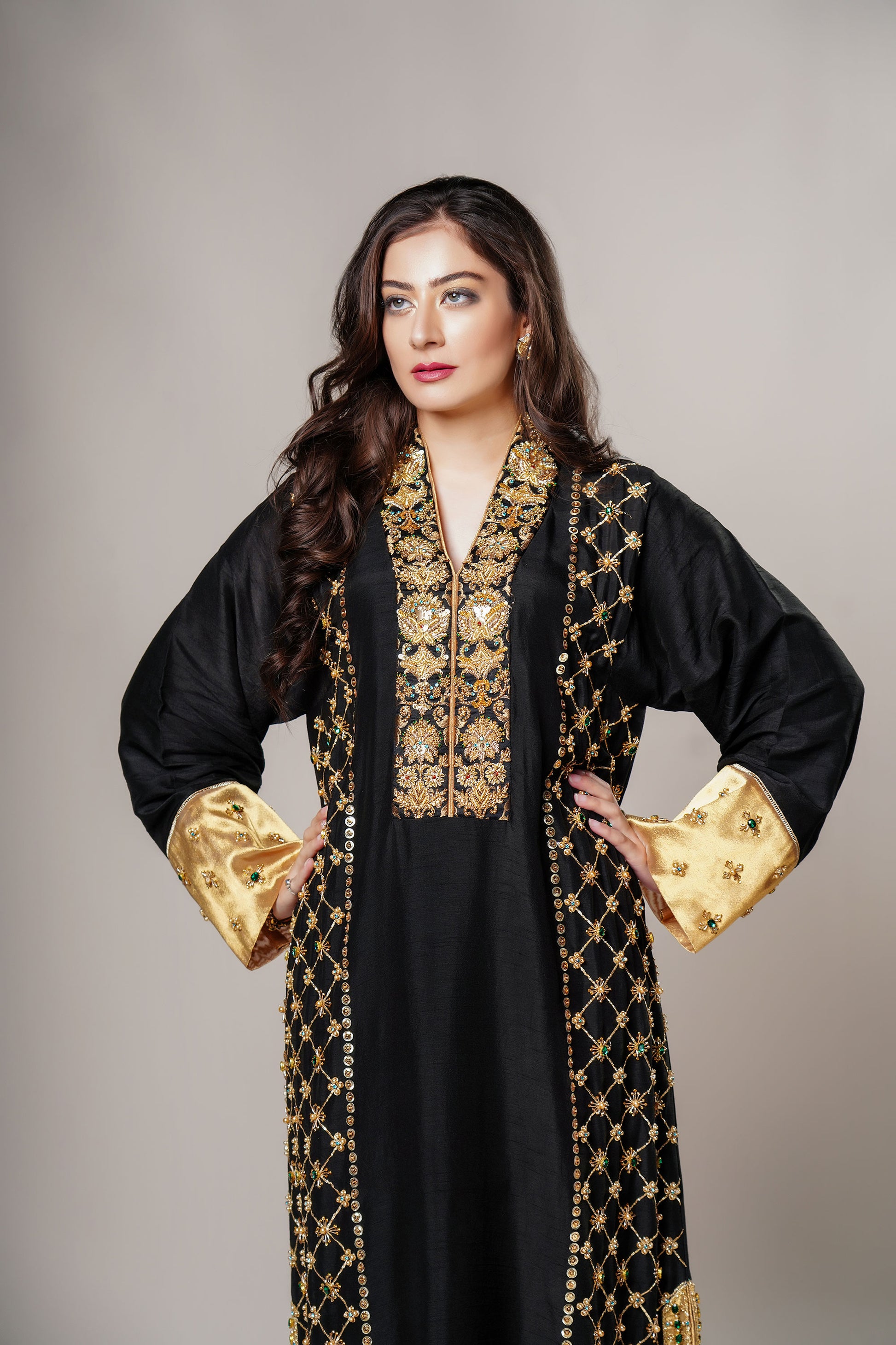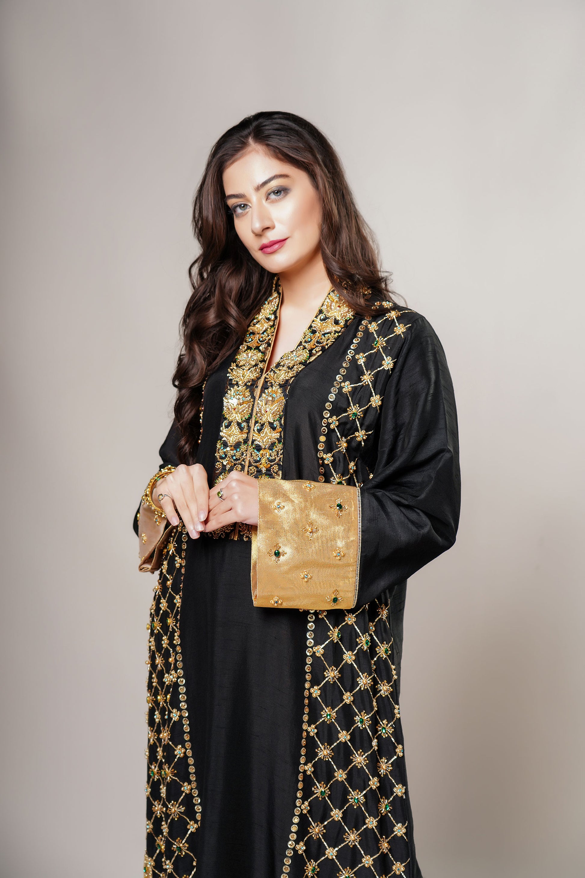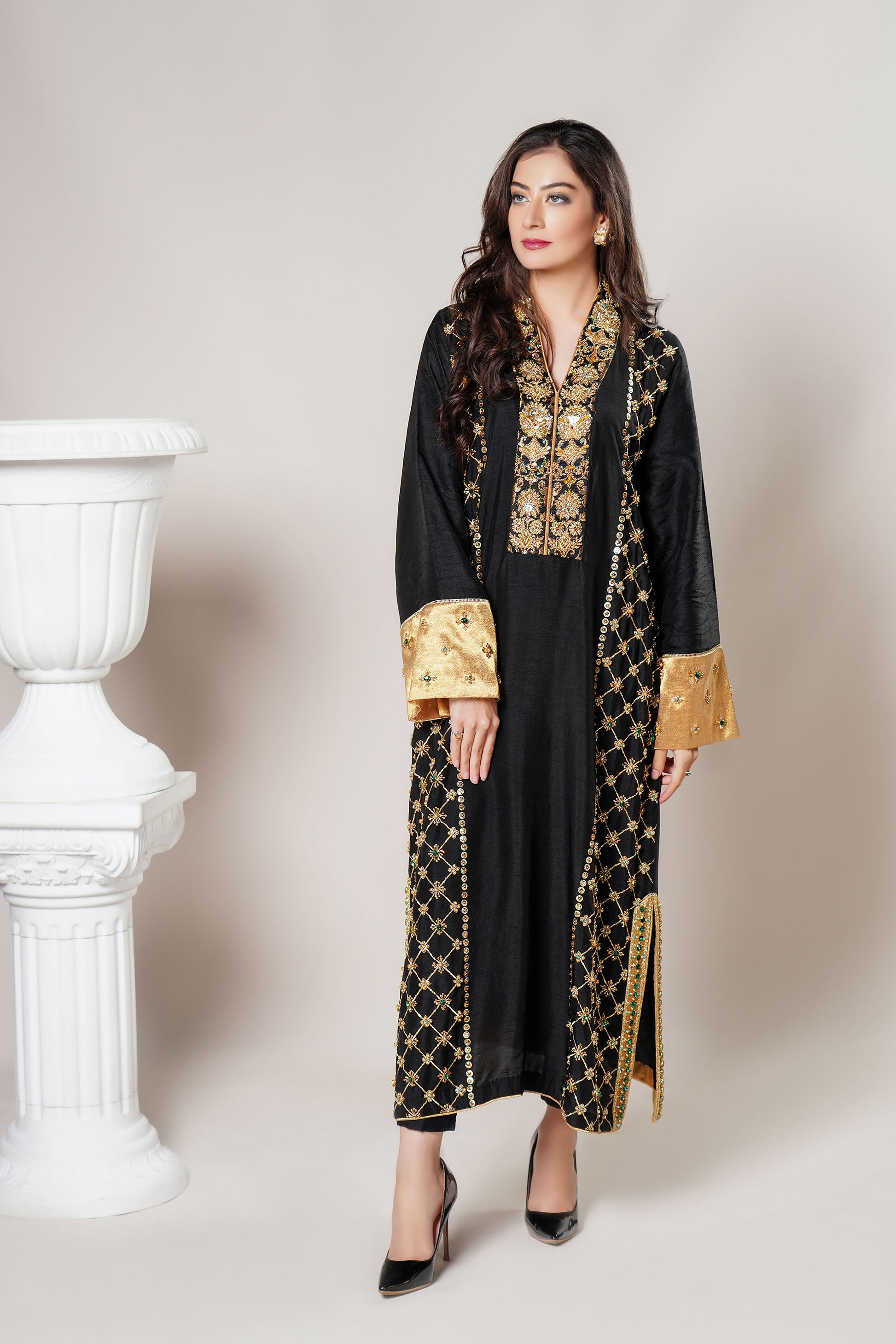 Description: Stylish Luxury Pret dresses Azalea is a Korean Rawsilk kurta with our signature zardozi handwork, adorned with an assortment of stones. It has a beautiful shawl collar with excellent handwork bordered by pure tissue.