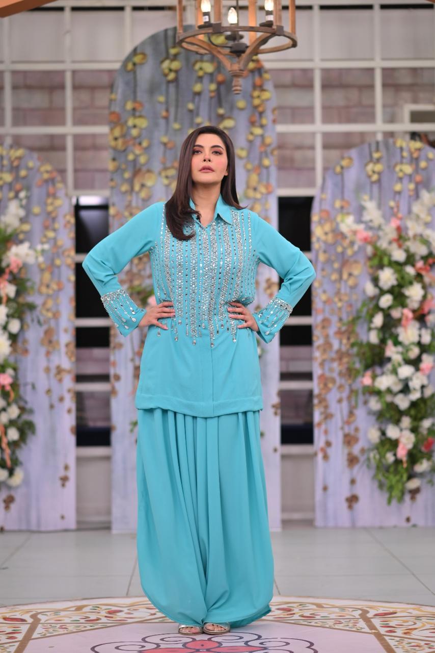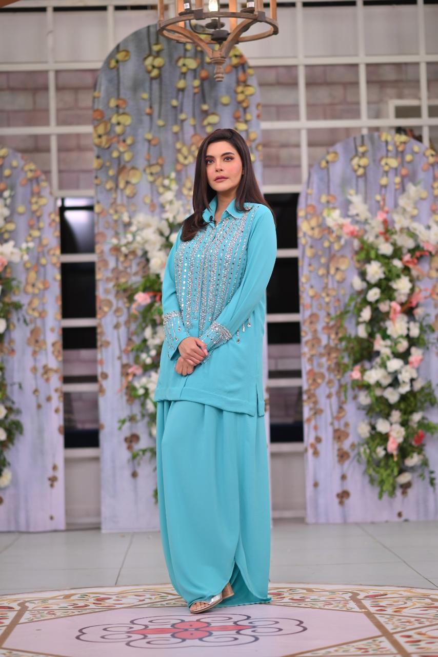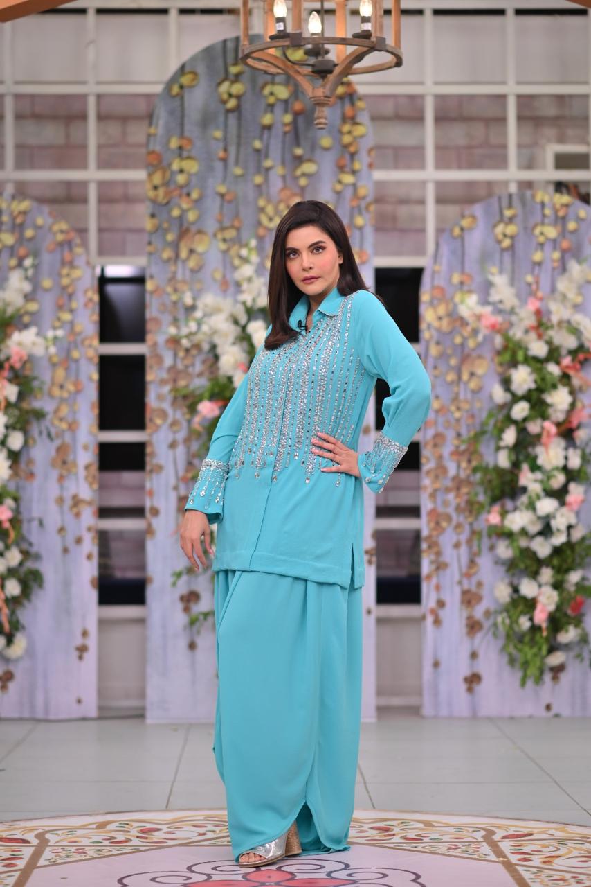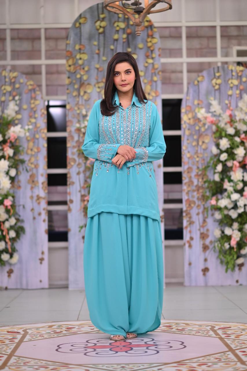 Description: Timeless allure: Dazzle in our crystal-adorned shirt with fusion shalwar where every beads and Swarovski sparkle tells a story of luxury and tradition.