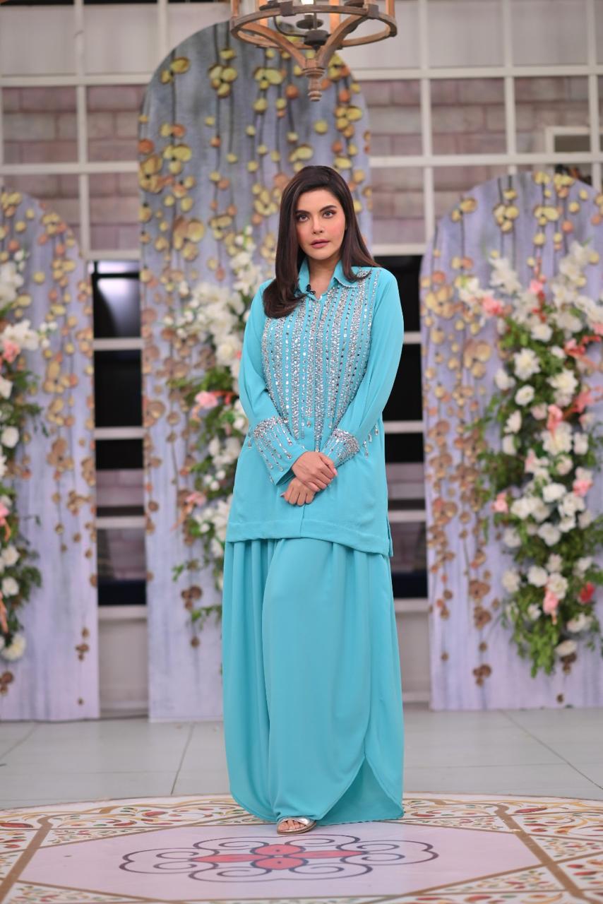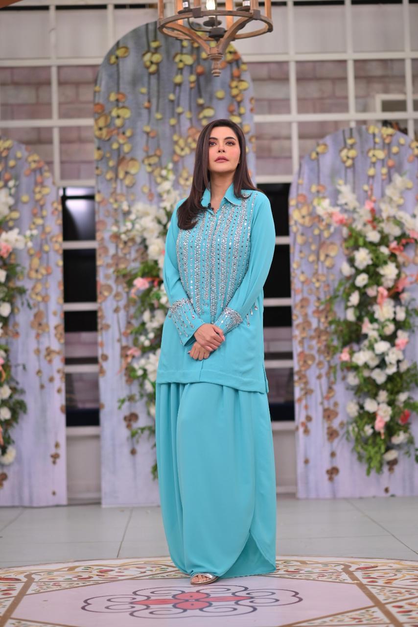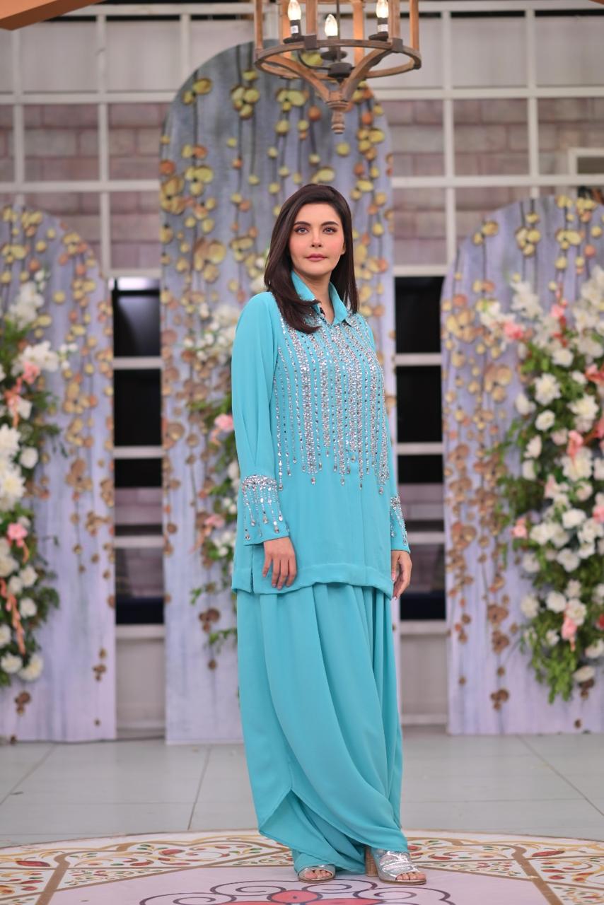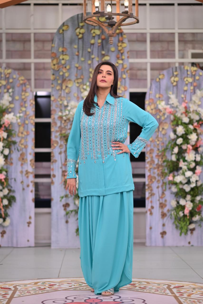 Description: Timeless allure: Dazzle in our crystal-adorned shirt with fusion shalwar where every beads and Swarovski sparkle tells a story of luxury and tradition.