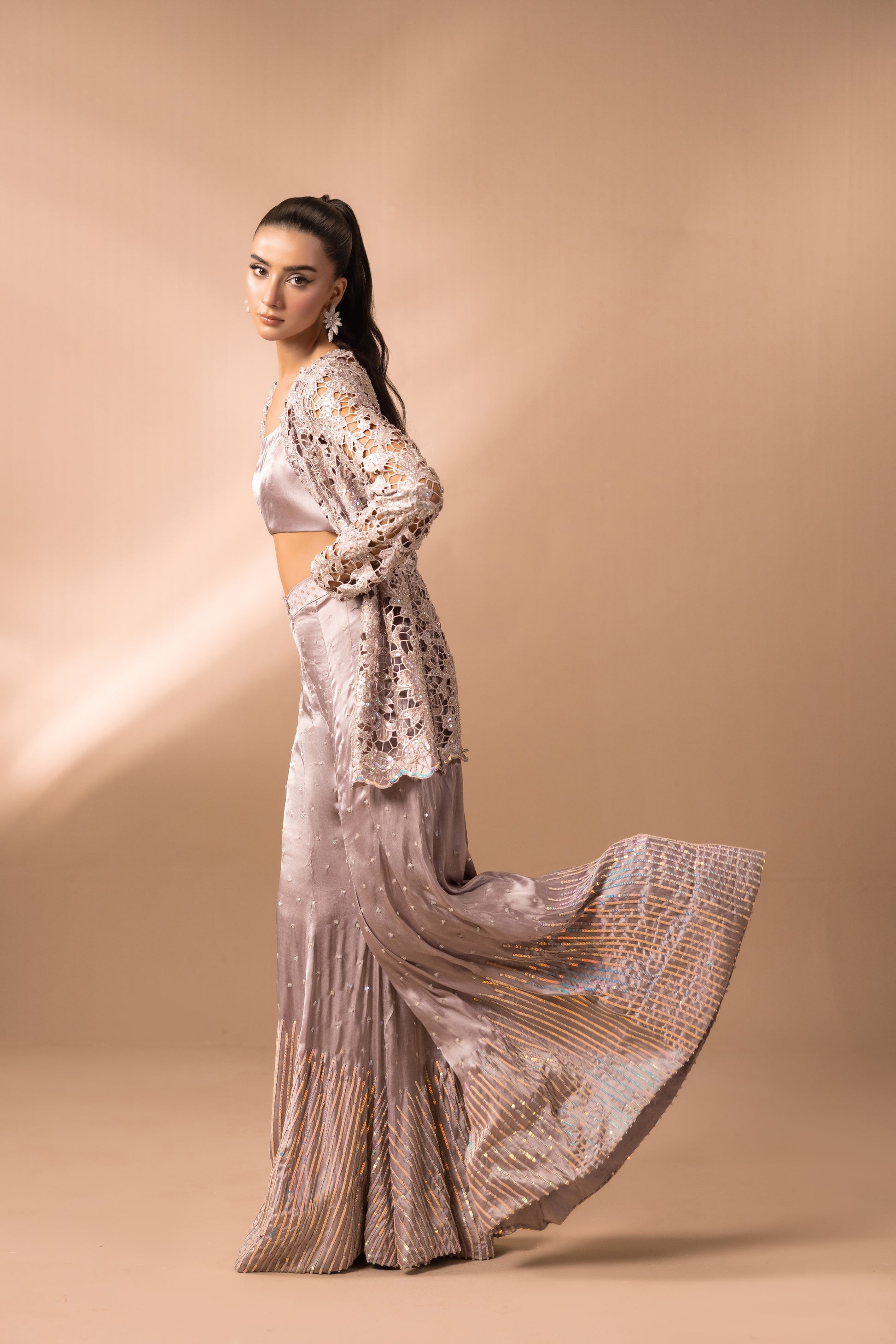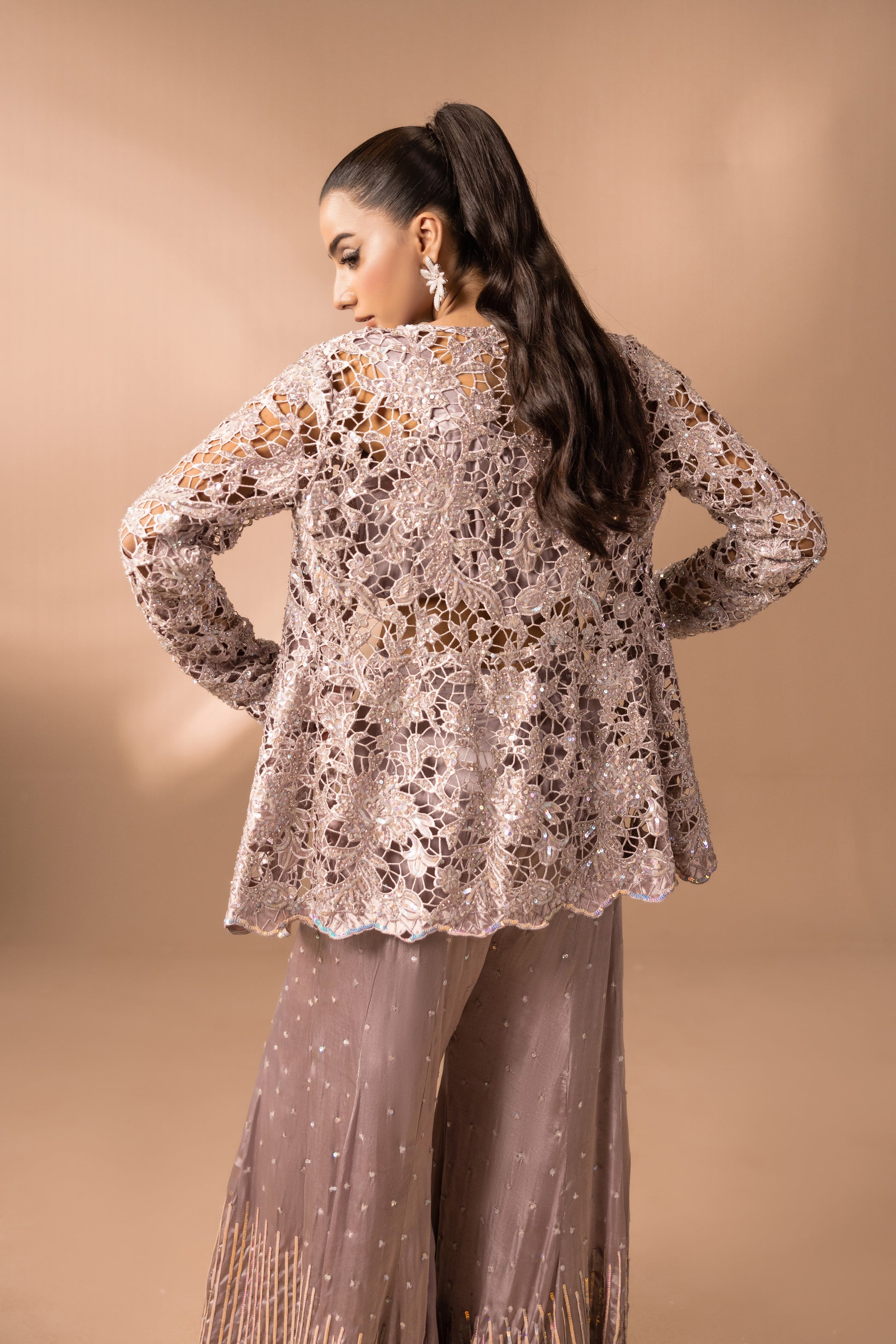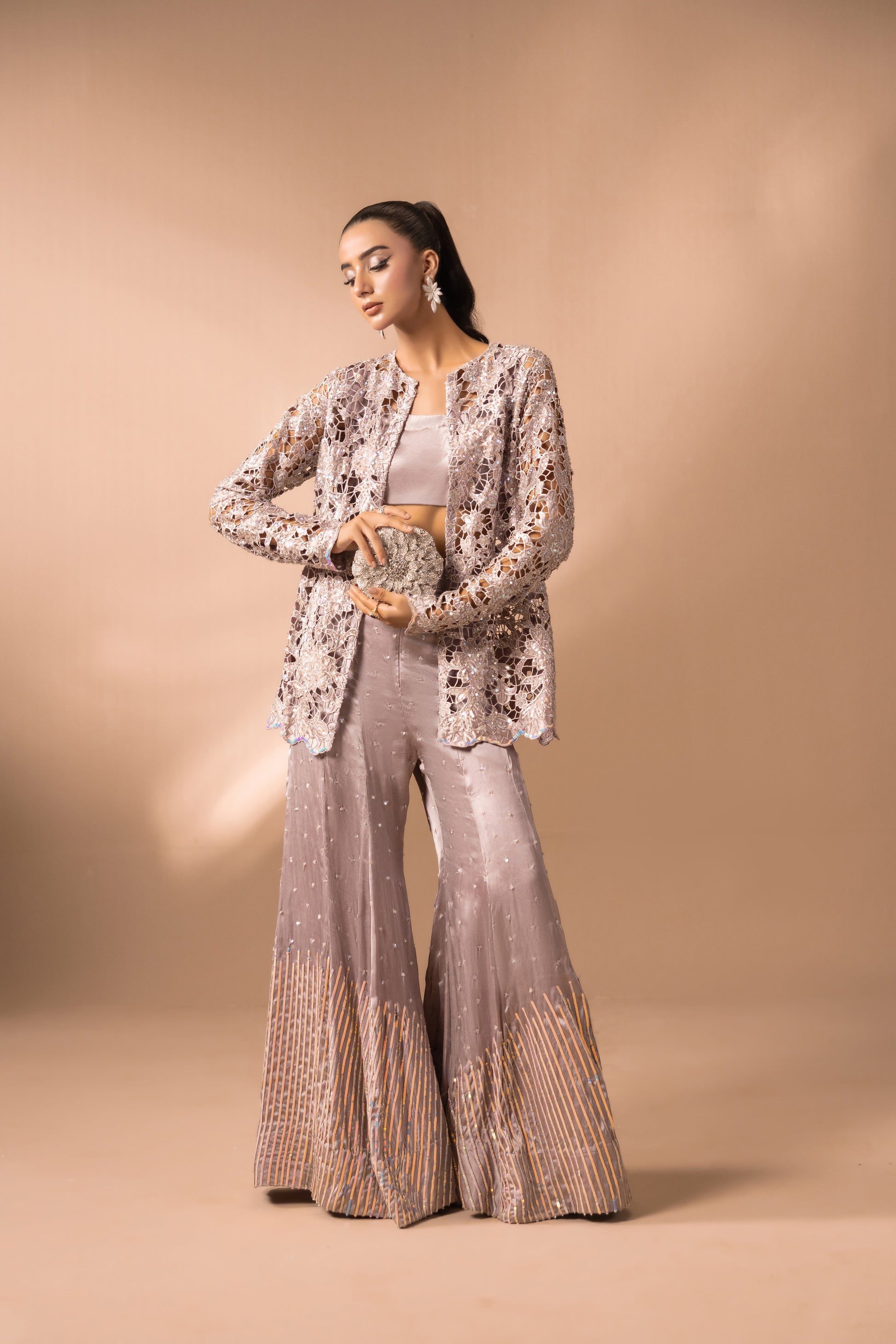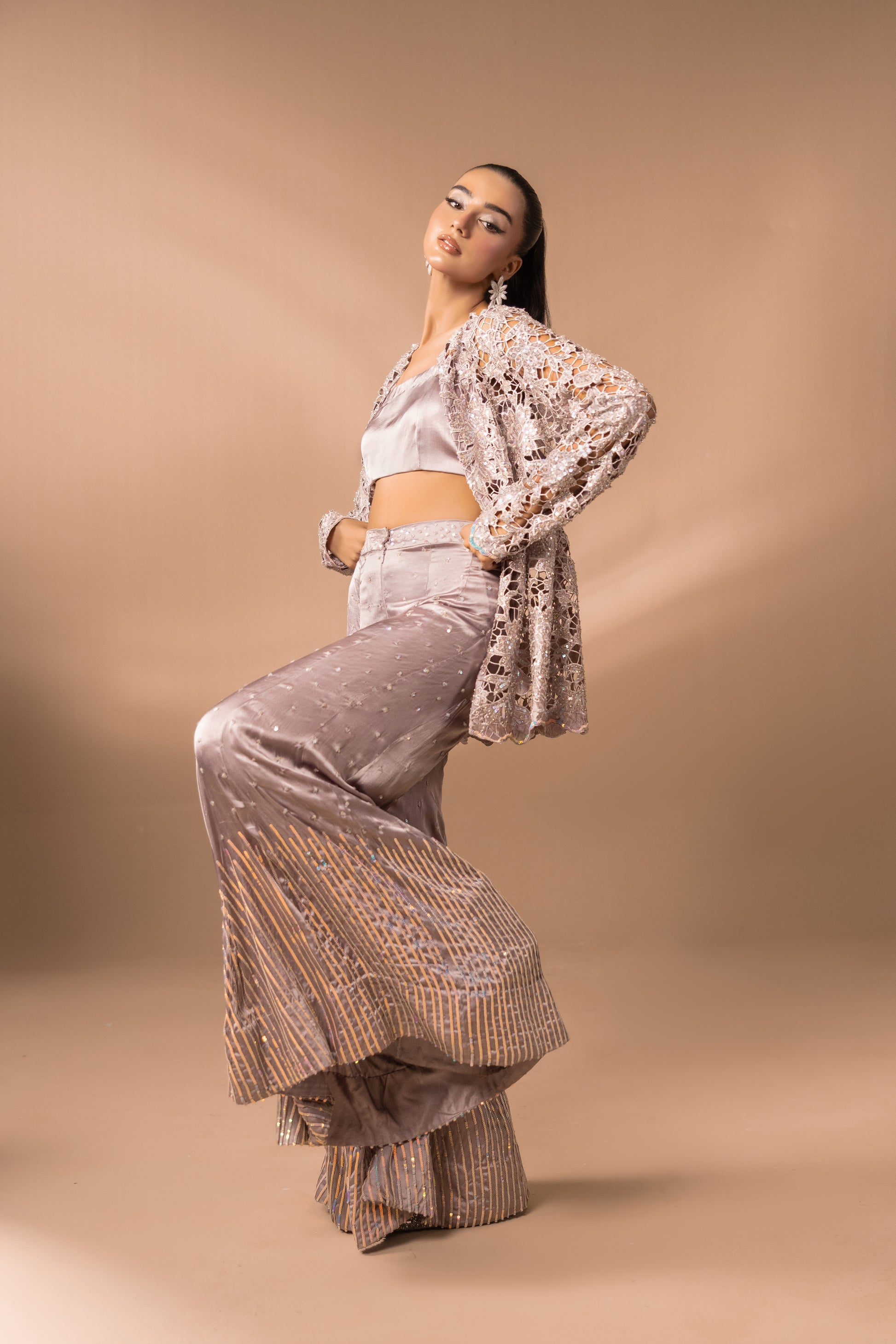 Description: Ethereal charm unfolds through flawlessly tailored flared pants, glistening with sequins, and an artisanal cutwork peplum, hand-embellished with sequins that shimmer with celestial radiance.