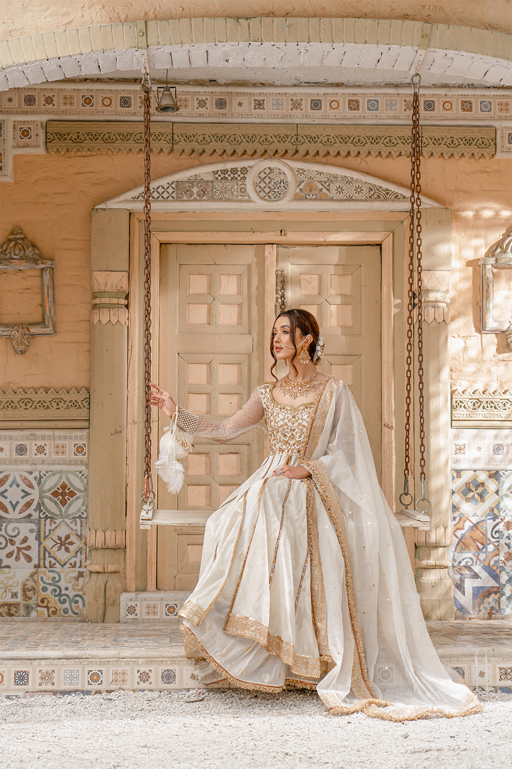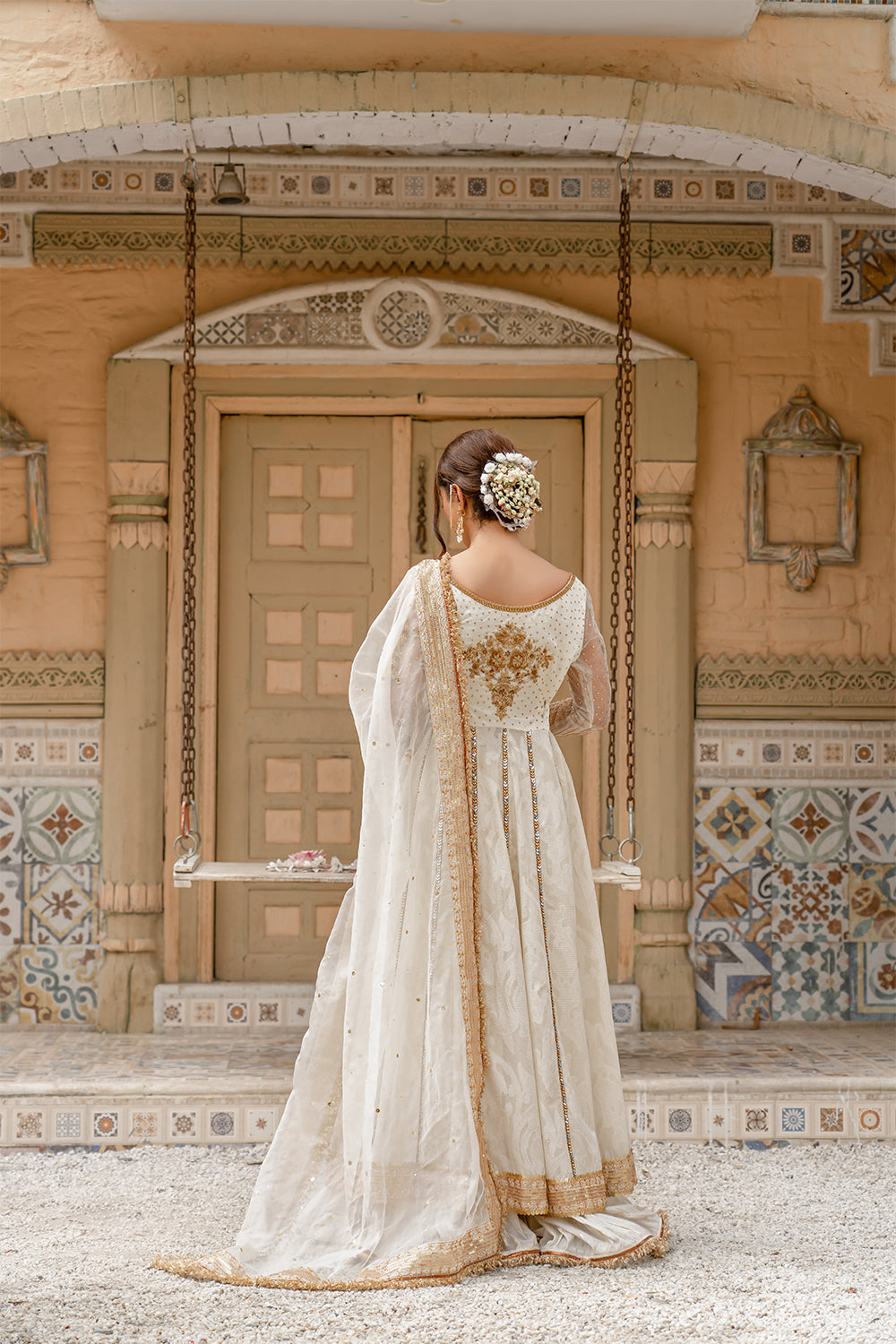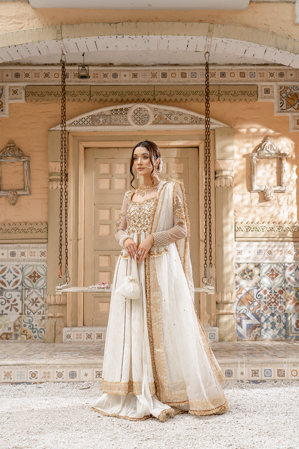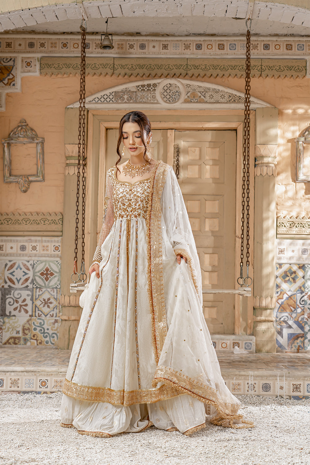 “Uns اُنس” is that perfect pearl white silhouette composed of Resham, beads, cutdana and zardozi work. This Formal ensemble is enhanced with mukaish, paired with a tilla bordered dupatta & crushed shara.