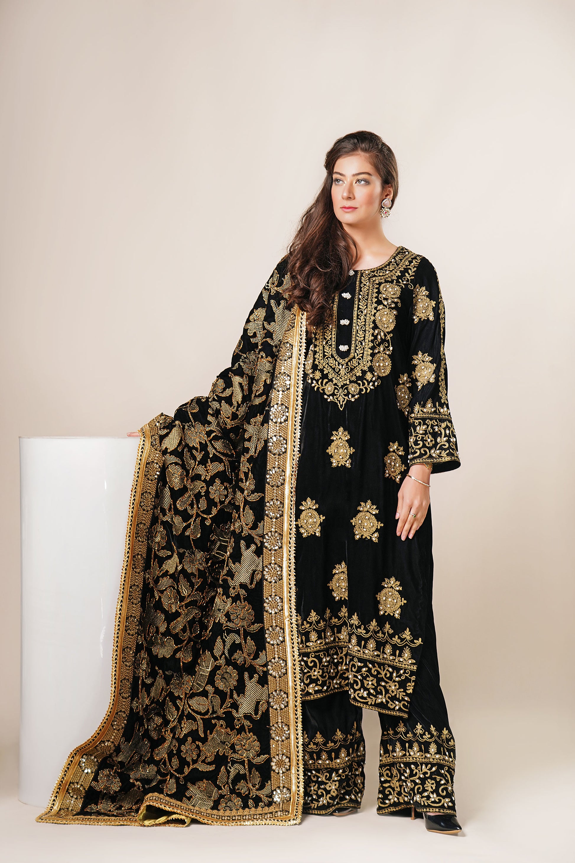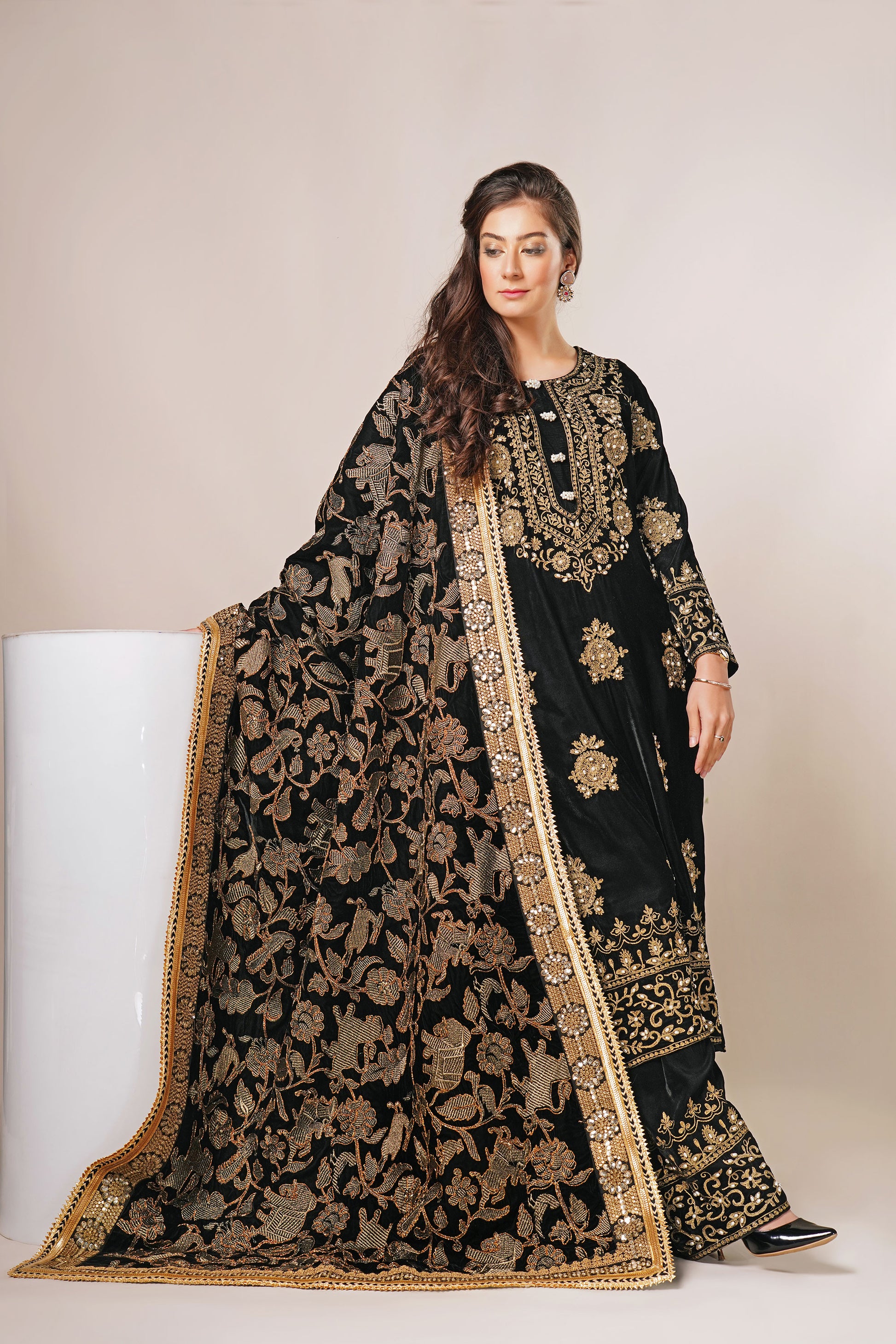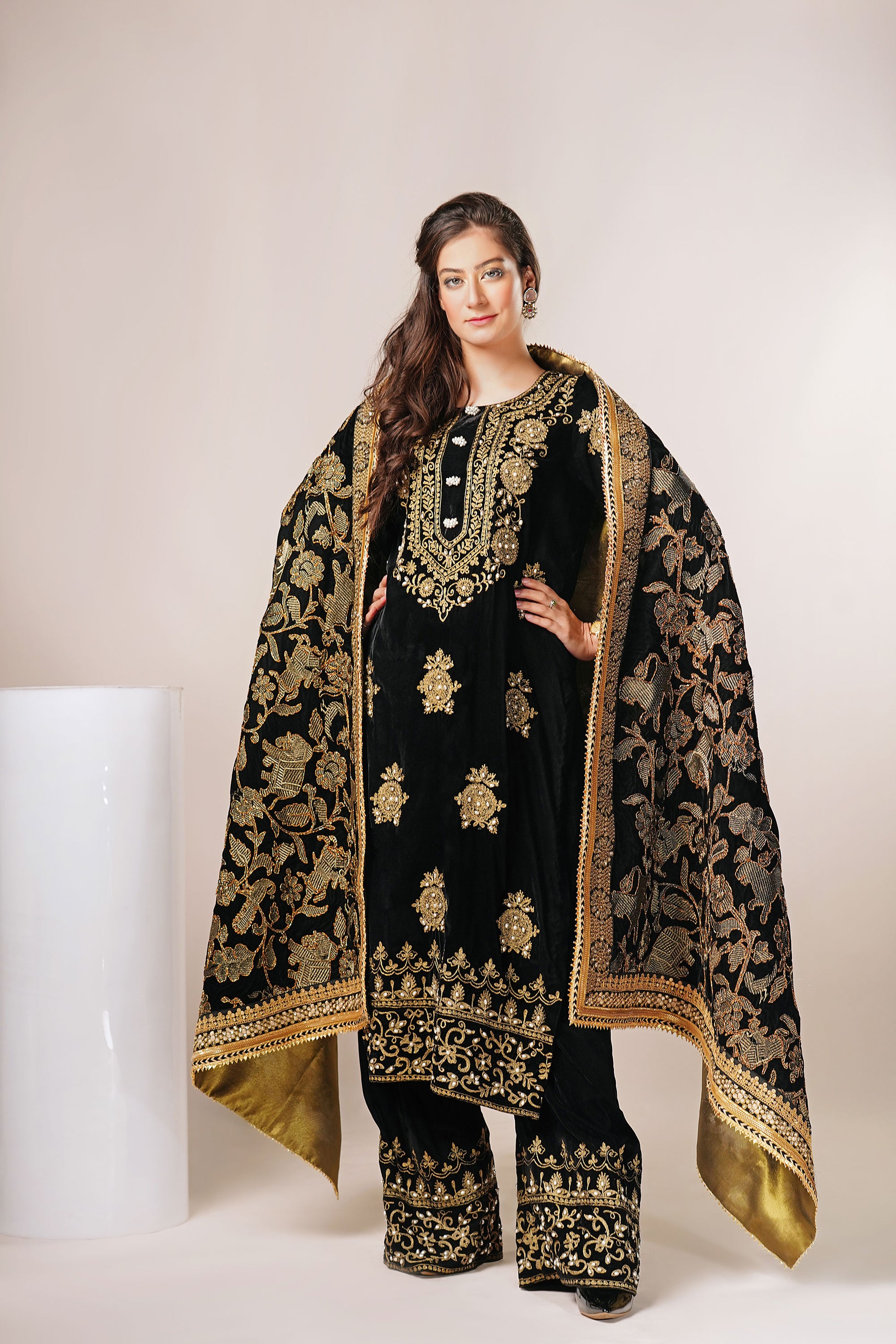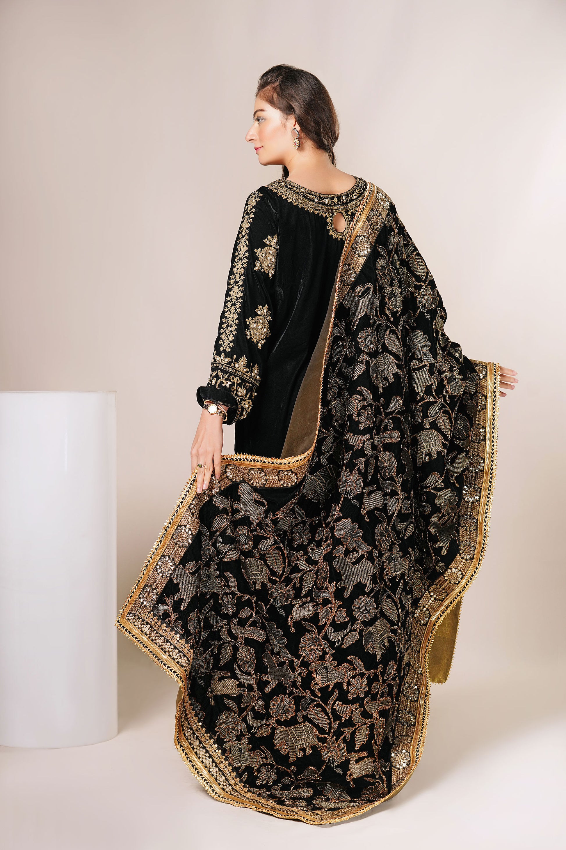 Description: ‘Winters in the Hunting Garden’ shawl is dowsed with immaculate tilla and dori work illustrating outlines of different animals as seen in hunting grounds enhanced with delicate borders. (Lace borders may vary).