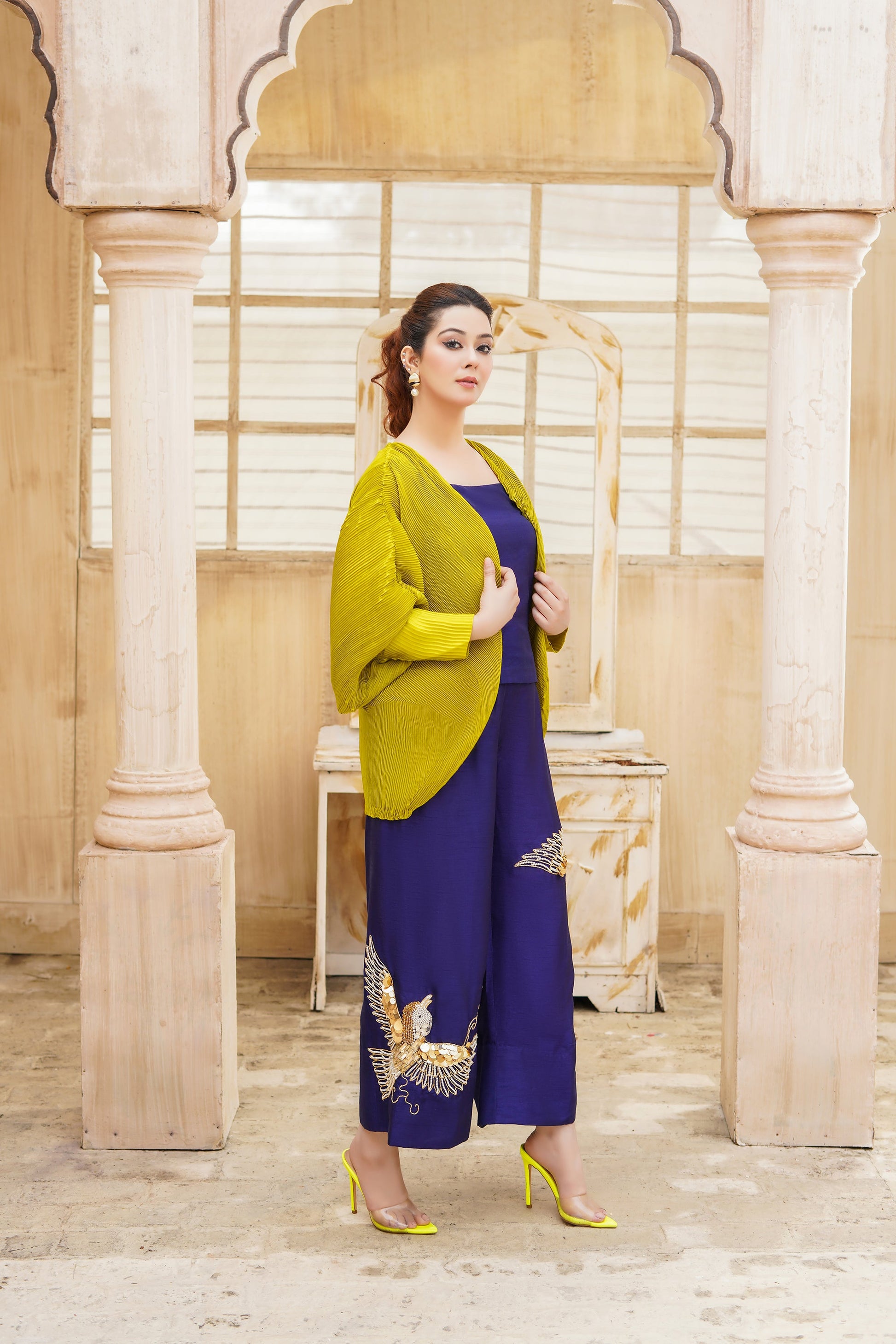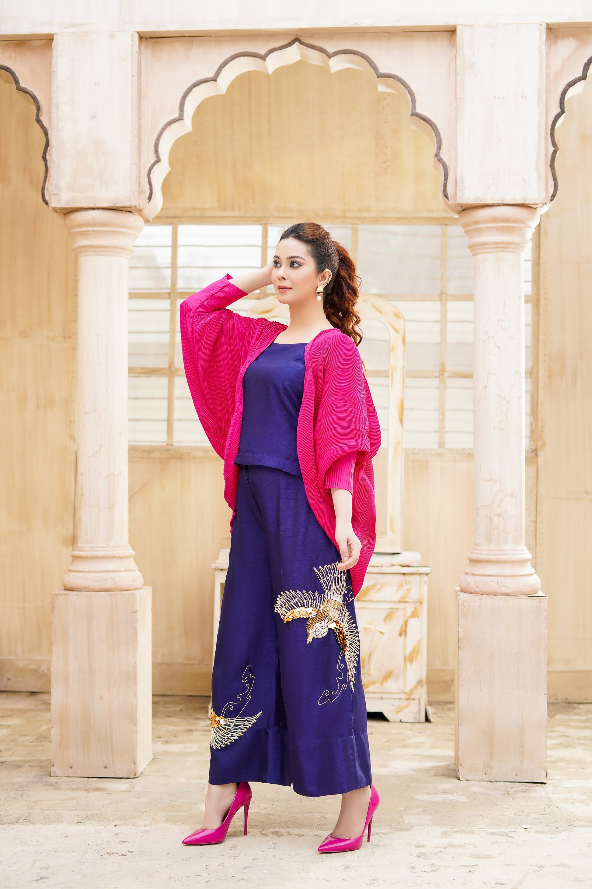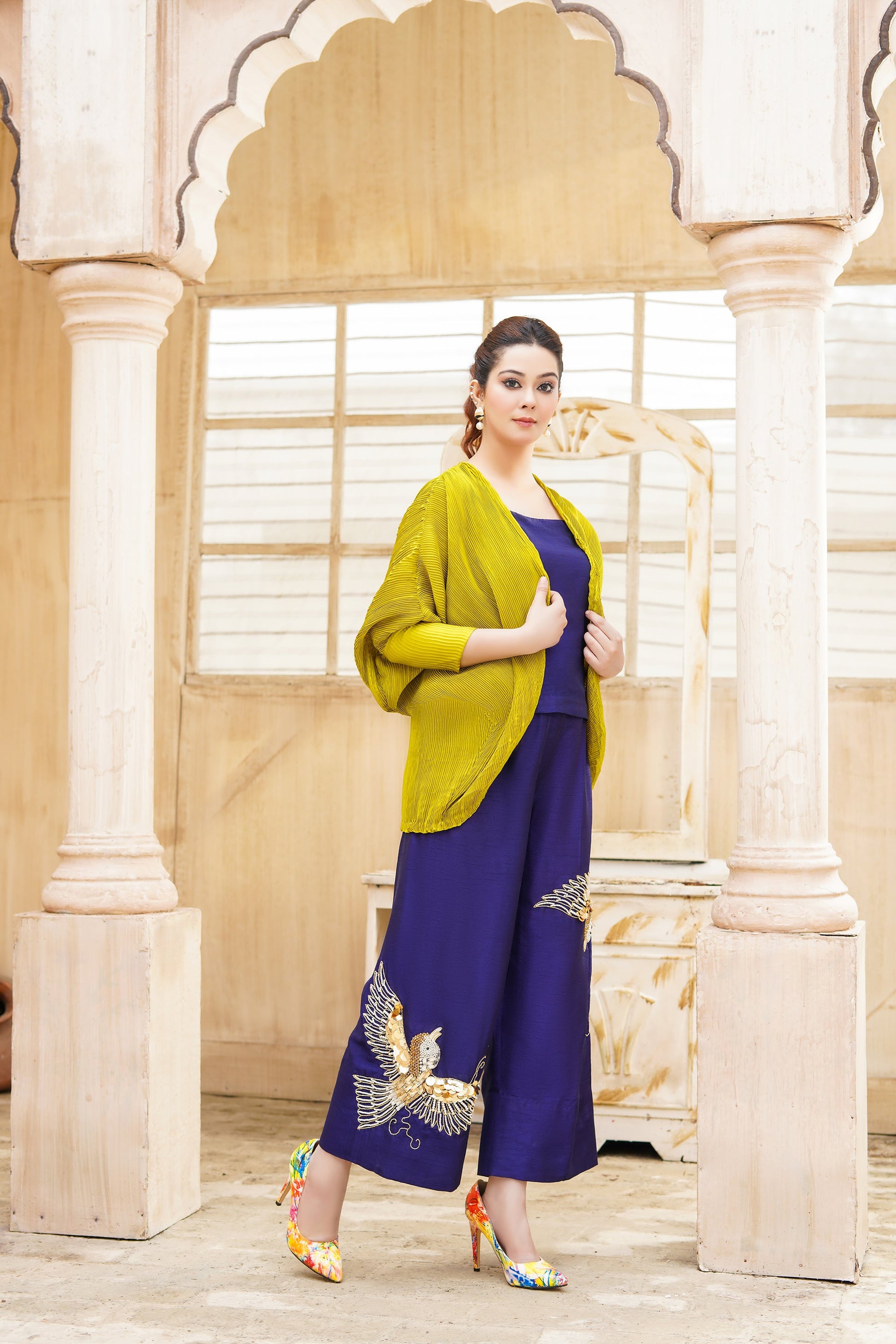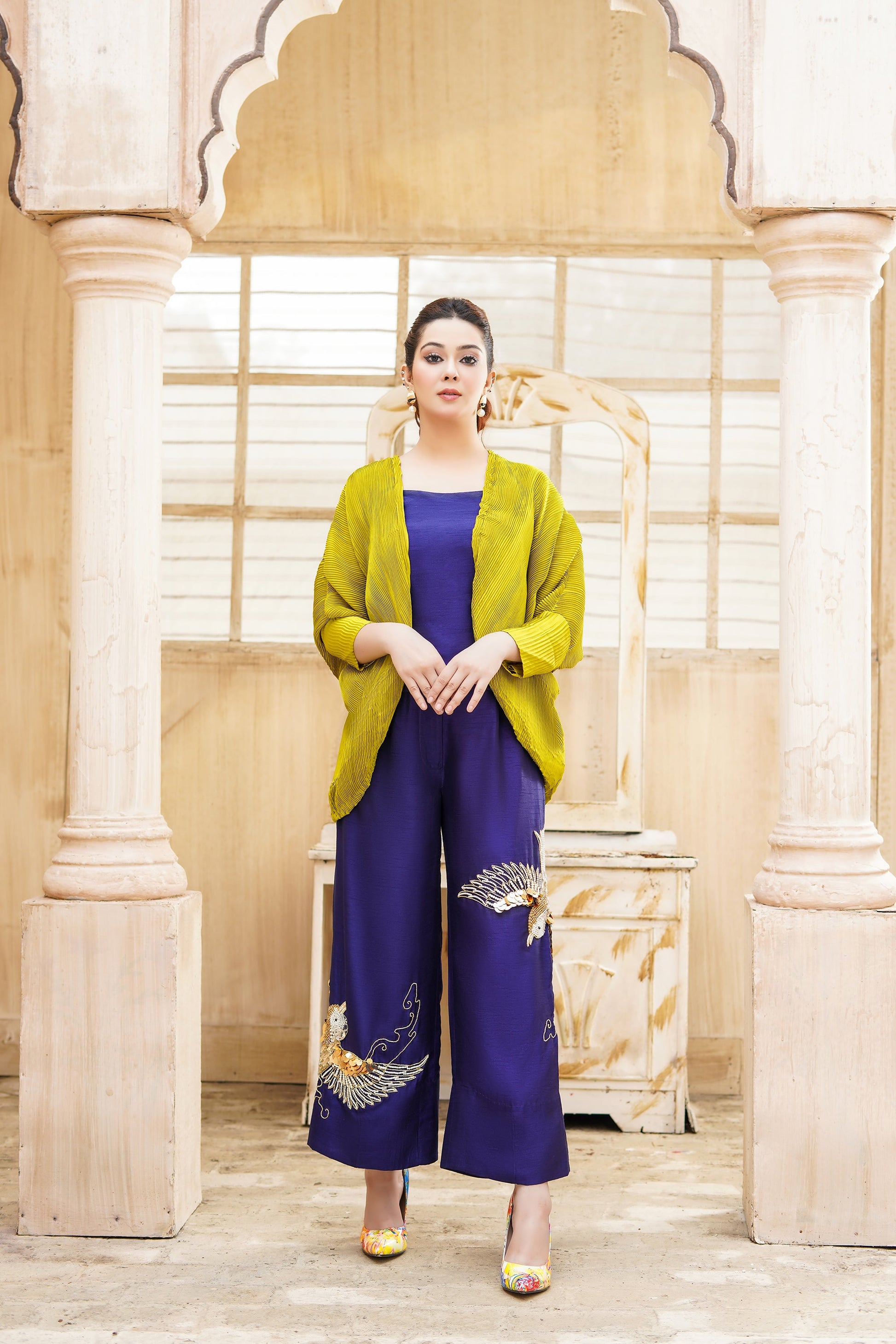 Unleashing Mehreen Mirza's Latest Masterpiece: A modern Yet Classy Fusion Dress featuring Neon Bolero paired with beads and pearls flying bird motives culottes!
