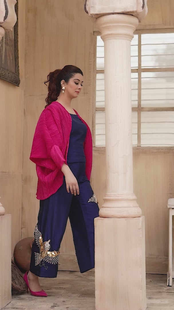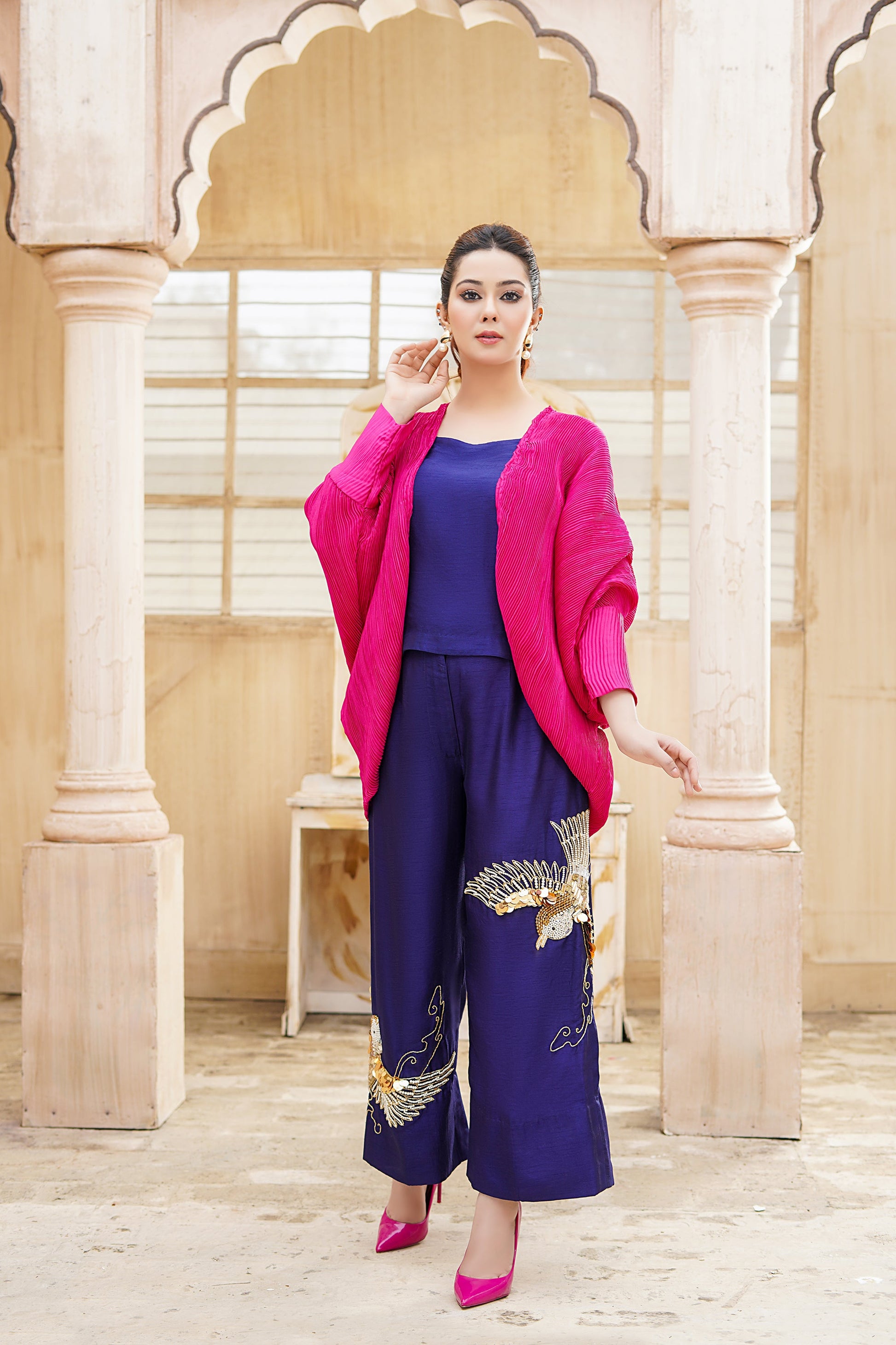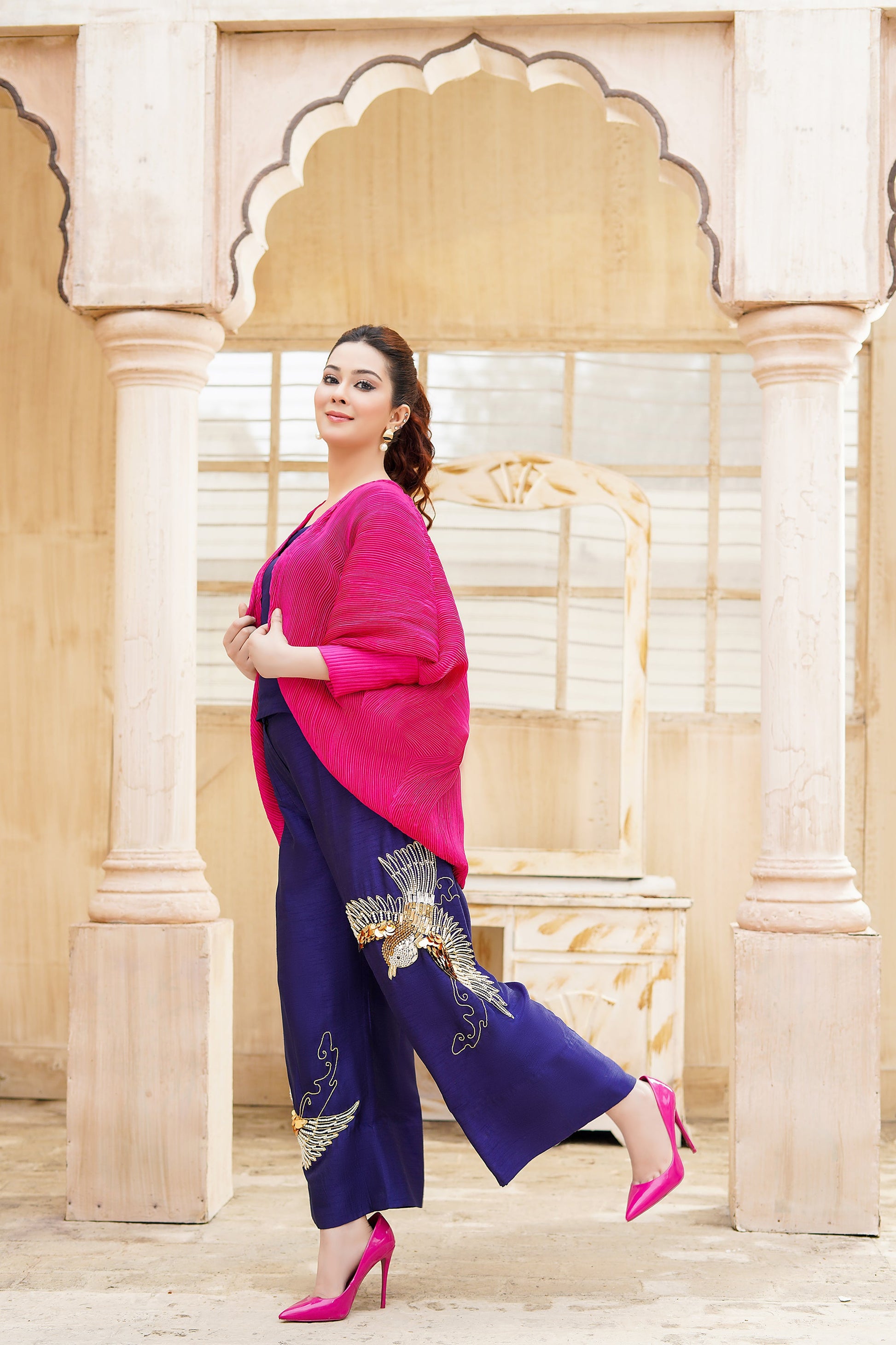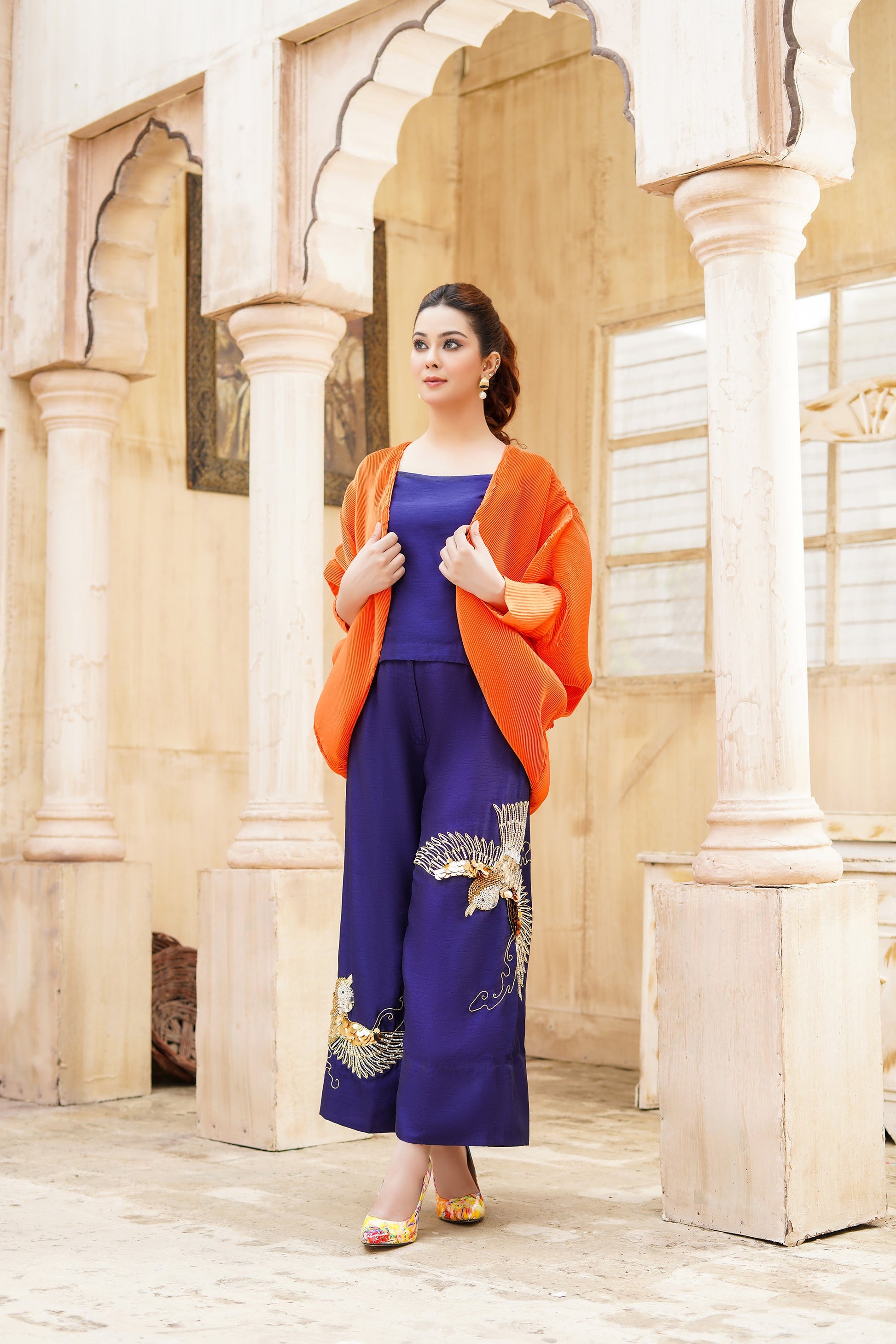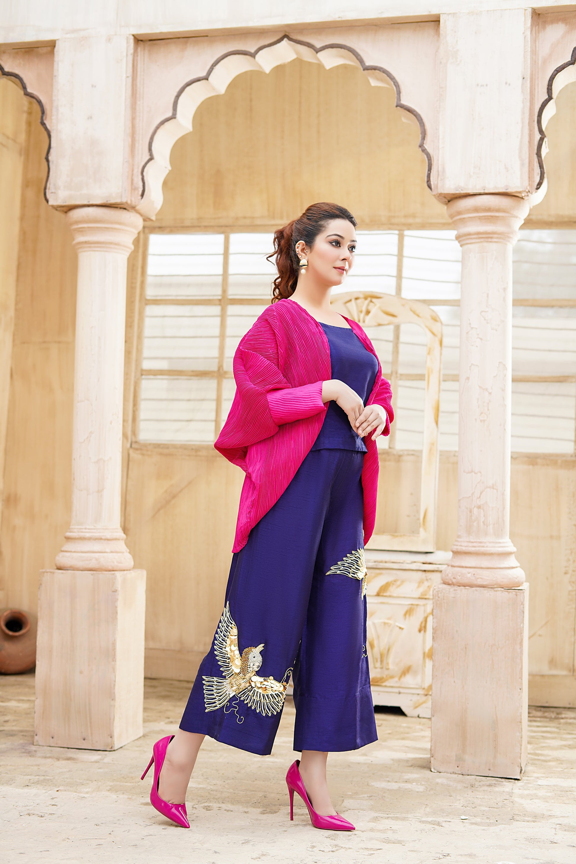 Unleashing Mehreen Mirza's Latest Masterpiece: A modern Yet Classy Fusion Dress featuring Neon Bolero paired with beads and pearls flying bird motives culottes!