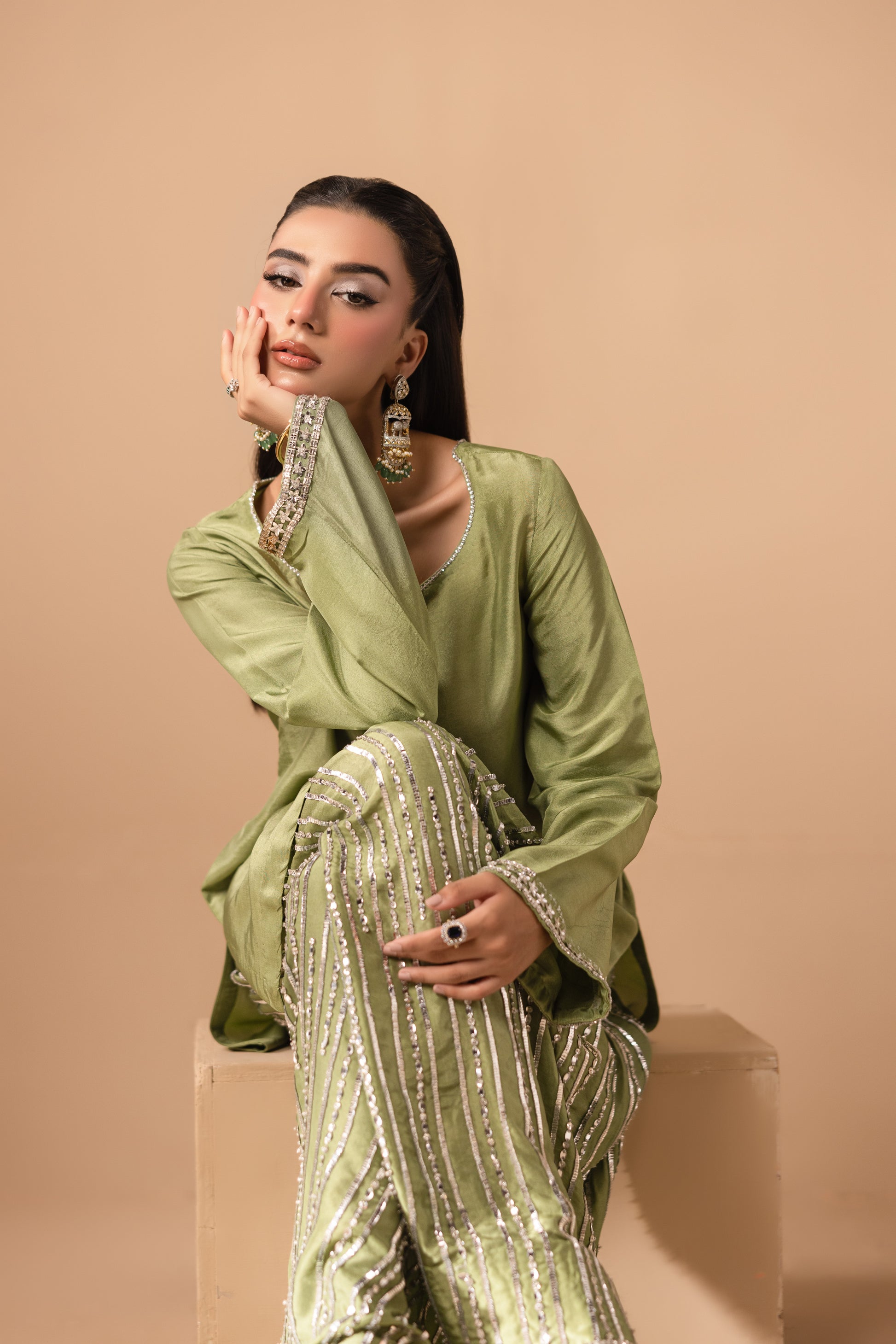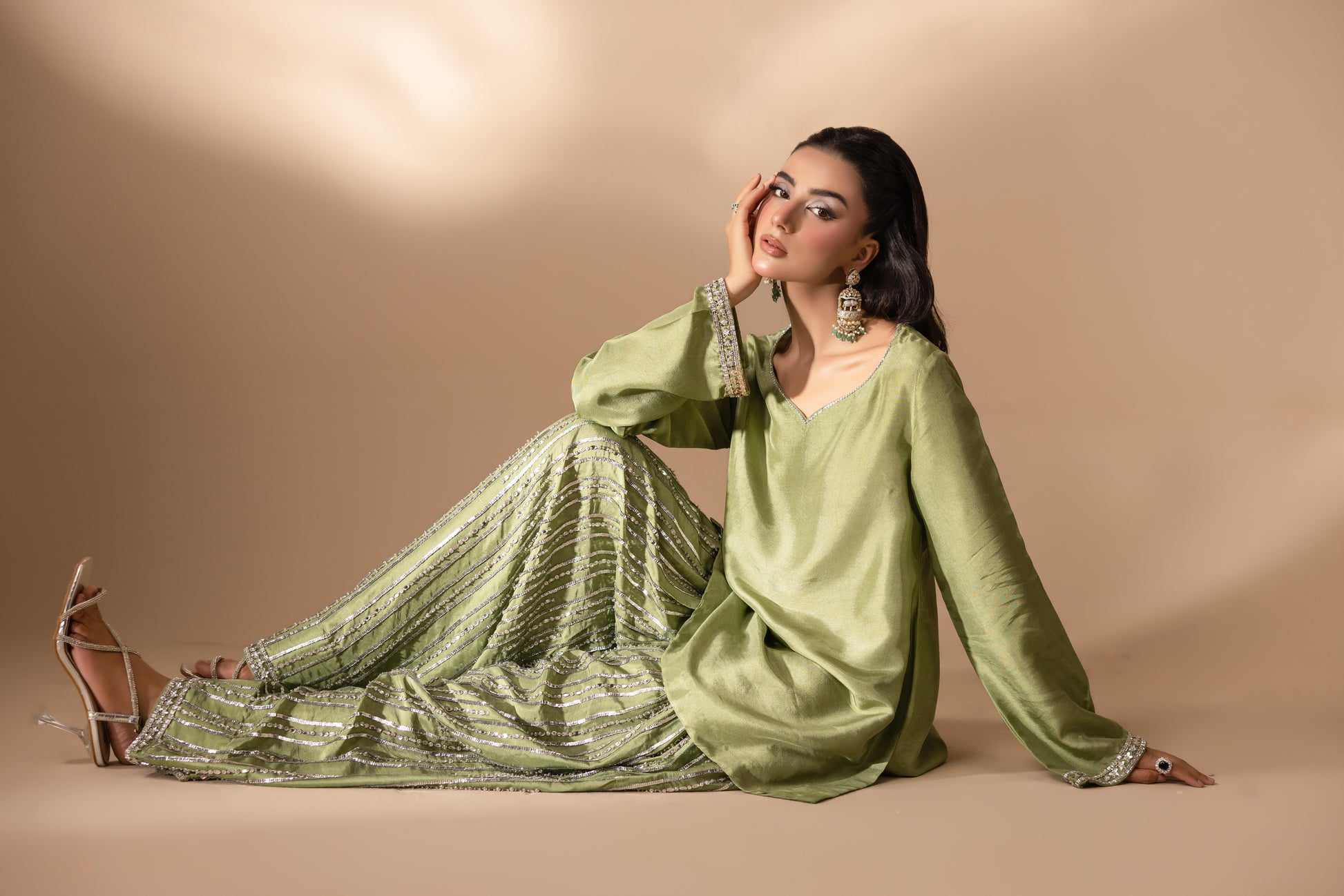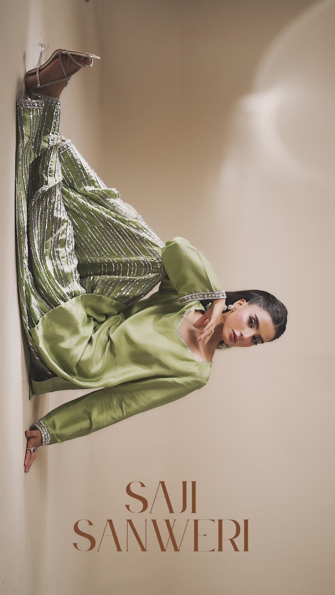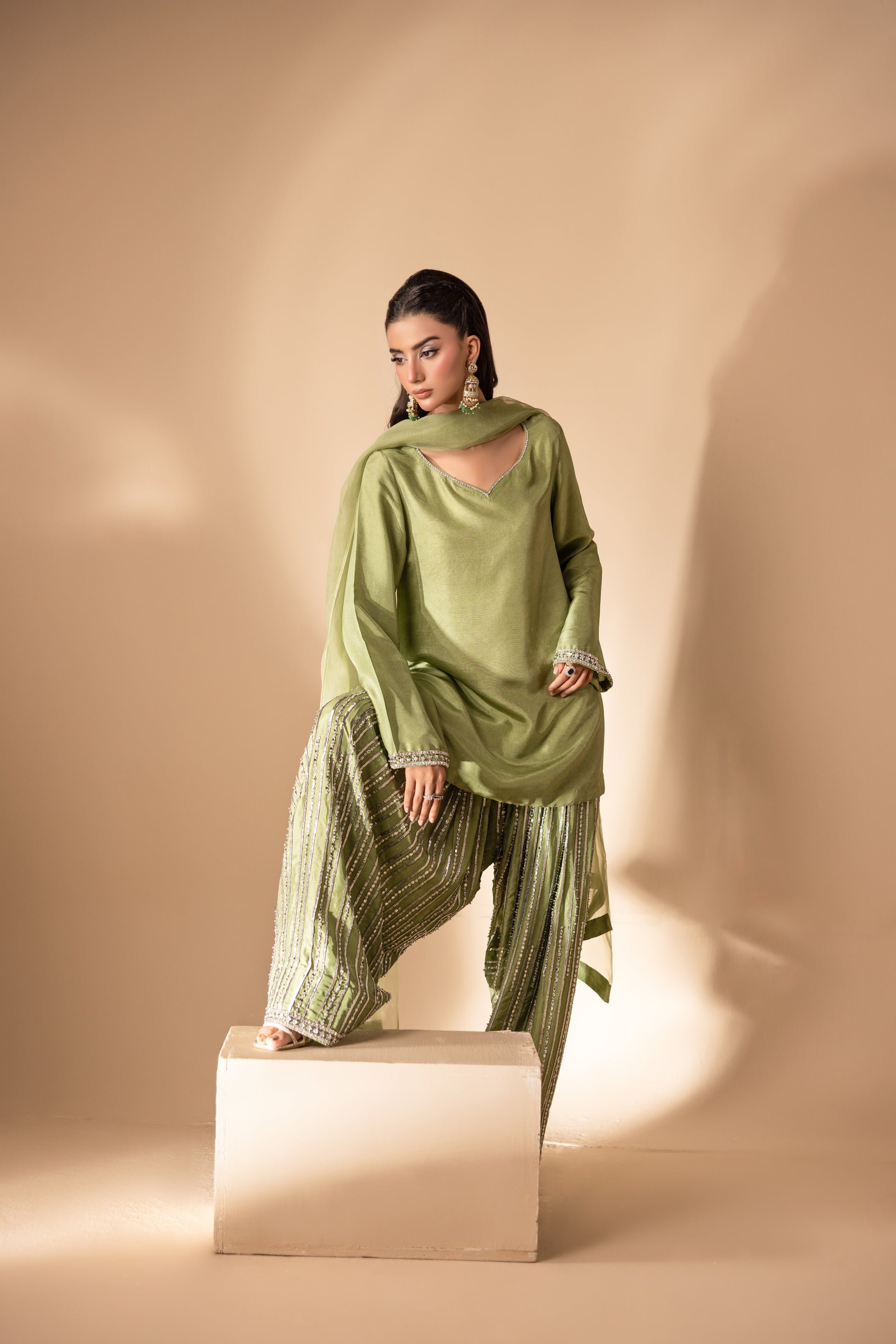 Description: Draped in a deep, enchanting olive green, Zaitoon shimmers with the celestial glow of sequins and the subtle sparkle of Swarovski crystals. The statement shalwar commands attention with quiet elegance, completing a masterpiece of craftsmanship and grace