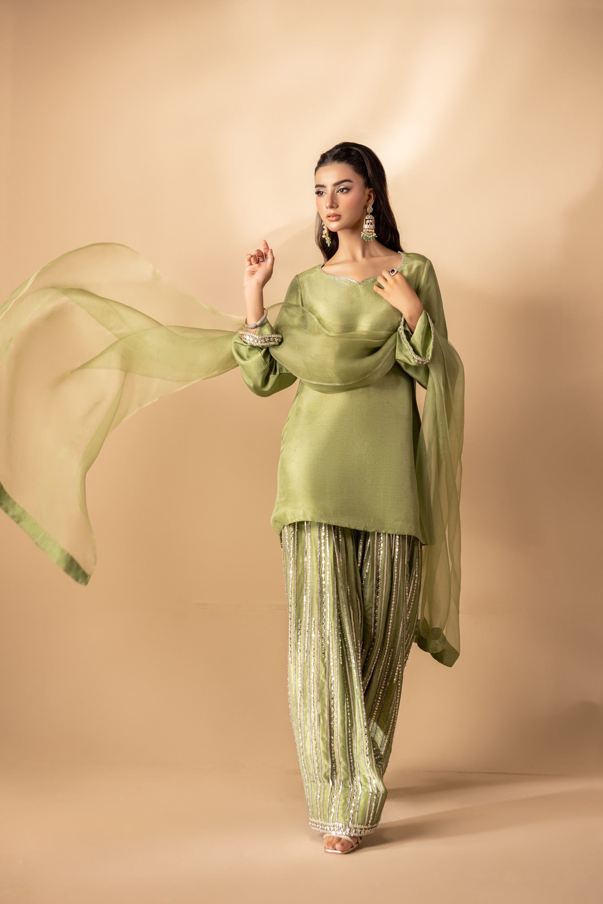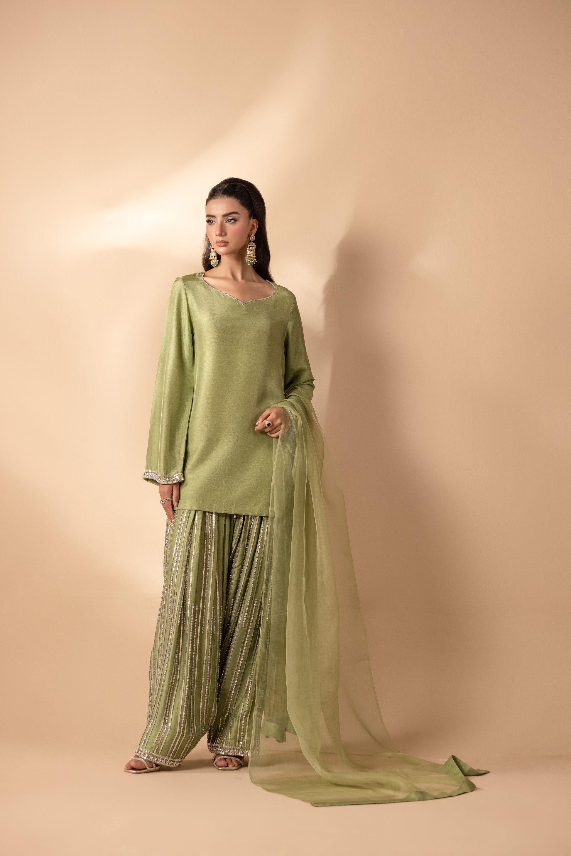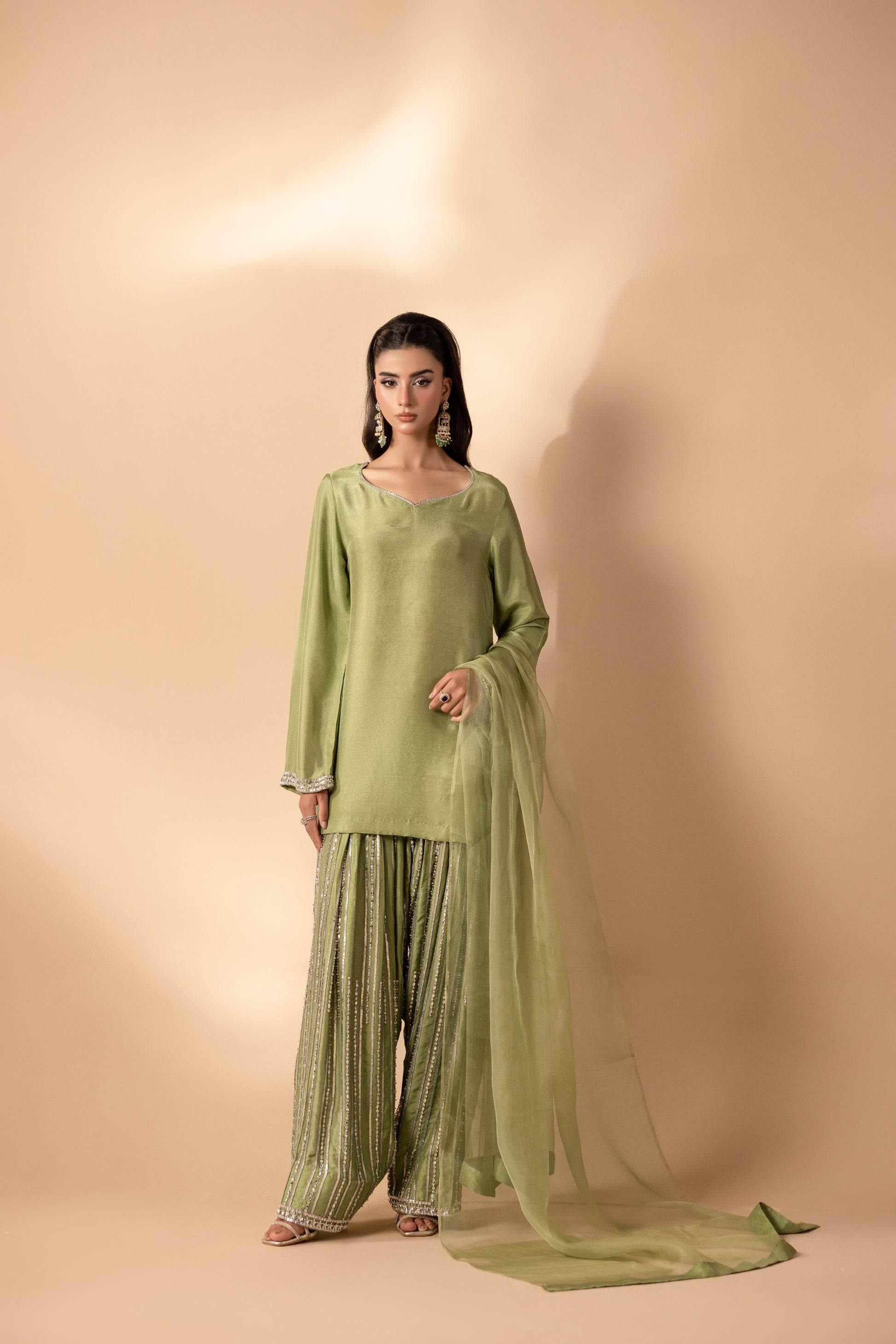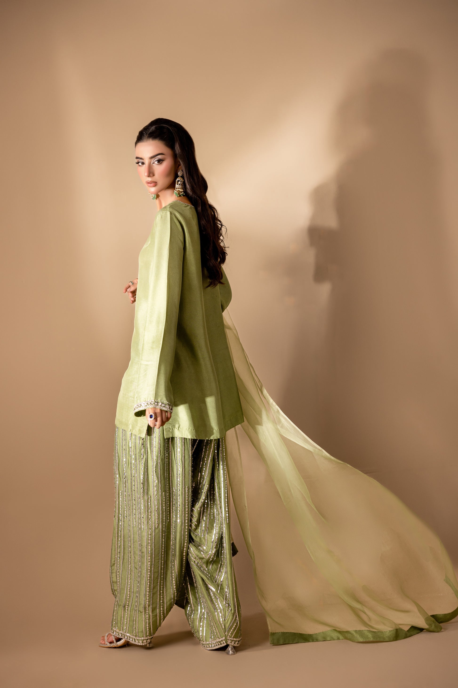 Description: Draped in a deep, enchanting olive green, Zaitoon shimmers with the celestial glow of sequins and the subtle sparkle of Swarovski crystals. The statement shalwar commands attention with quiet elegance, completing a masterpiece of craftsmanship and grace