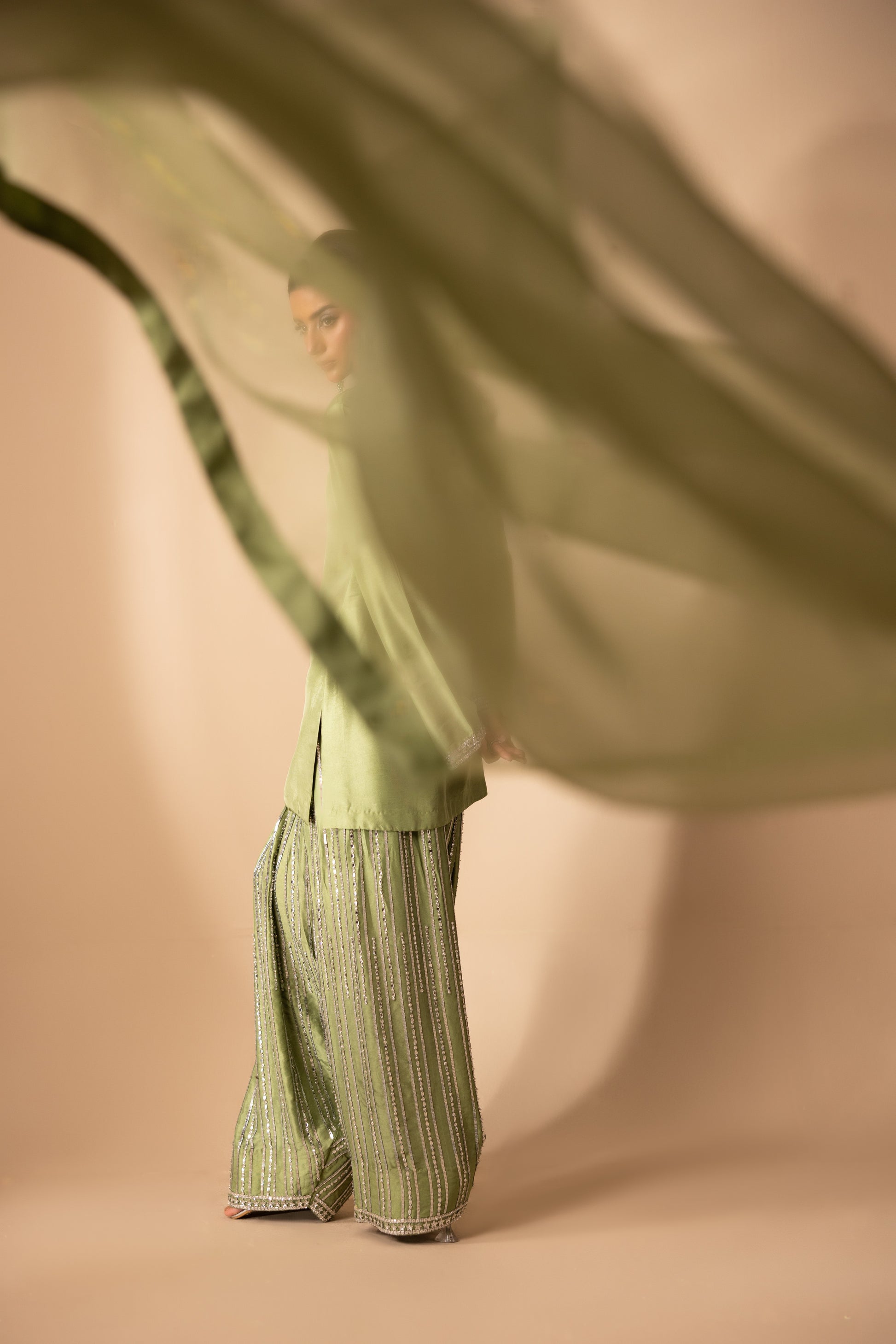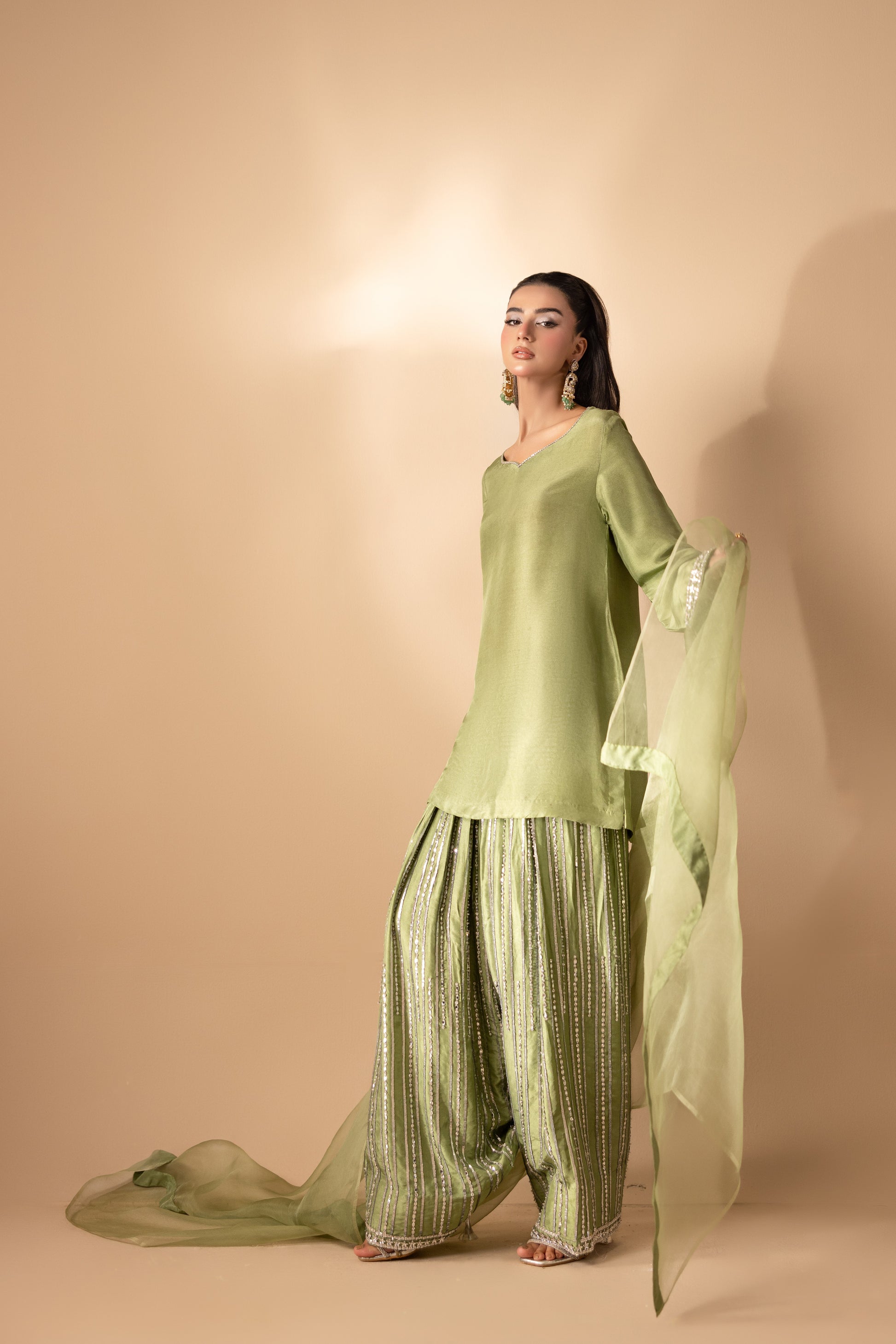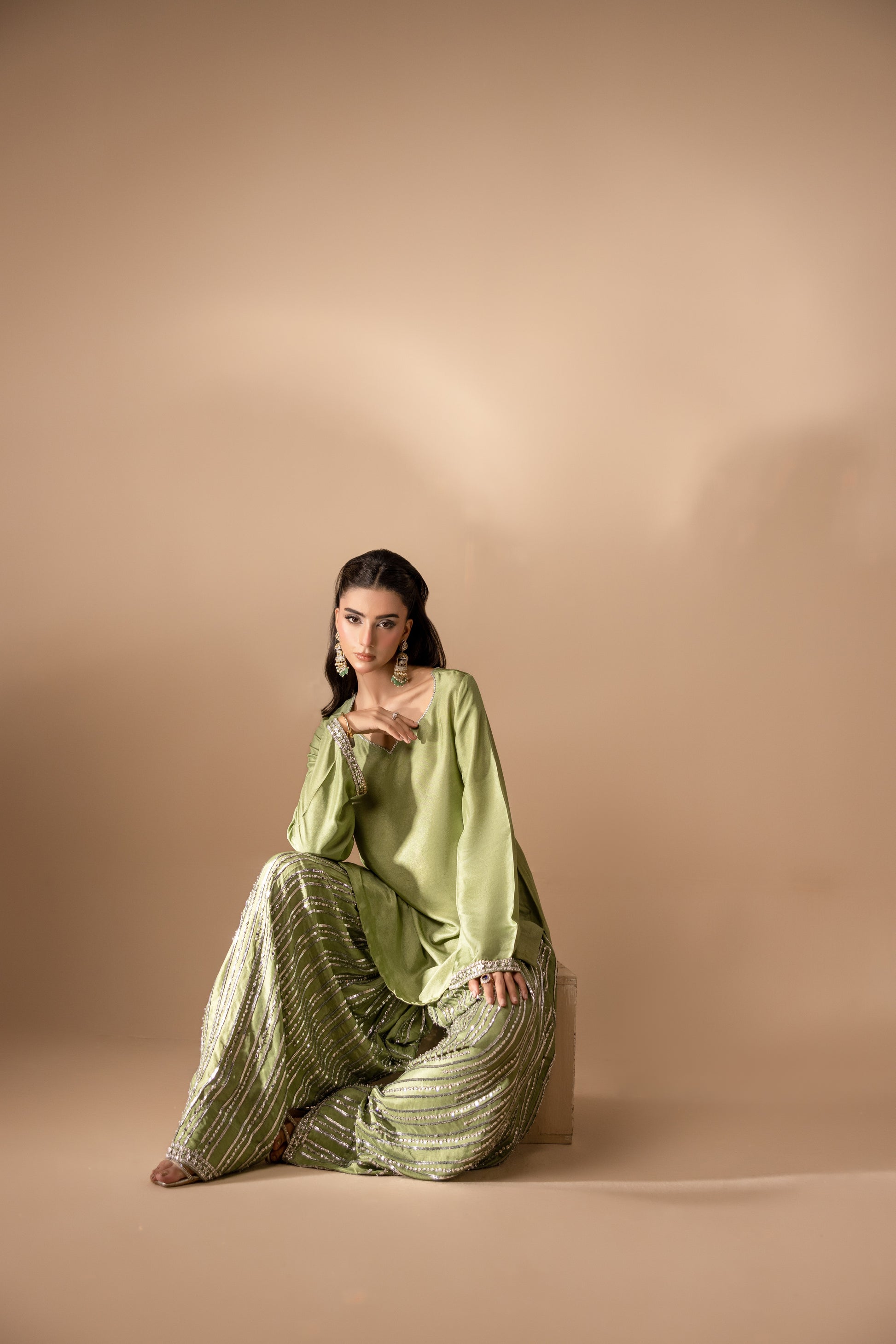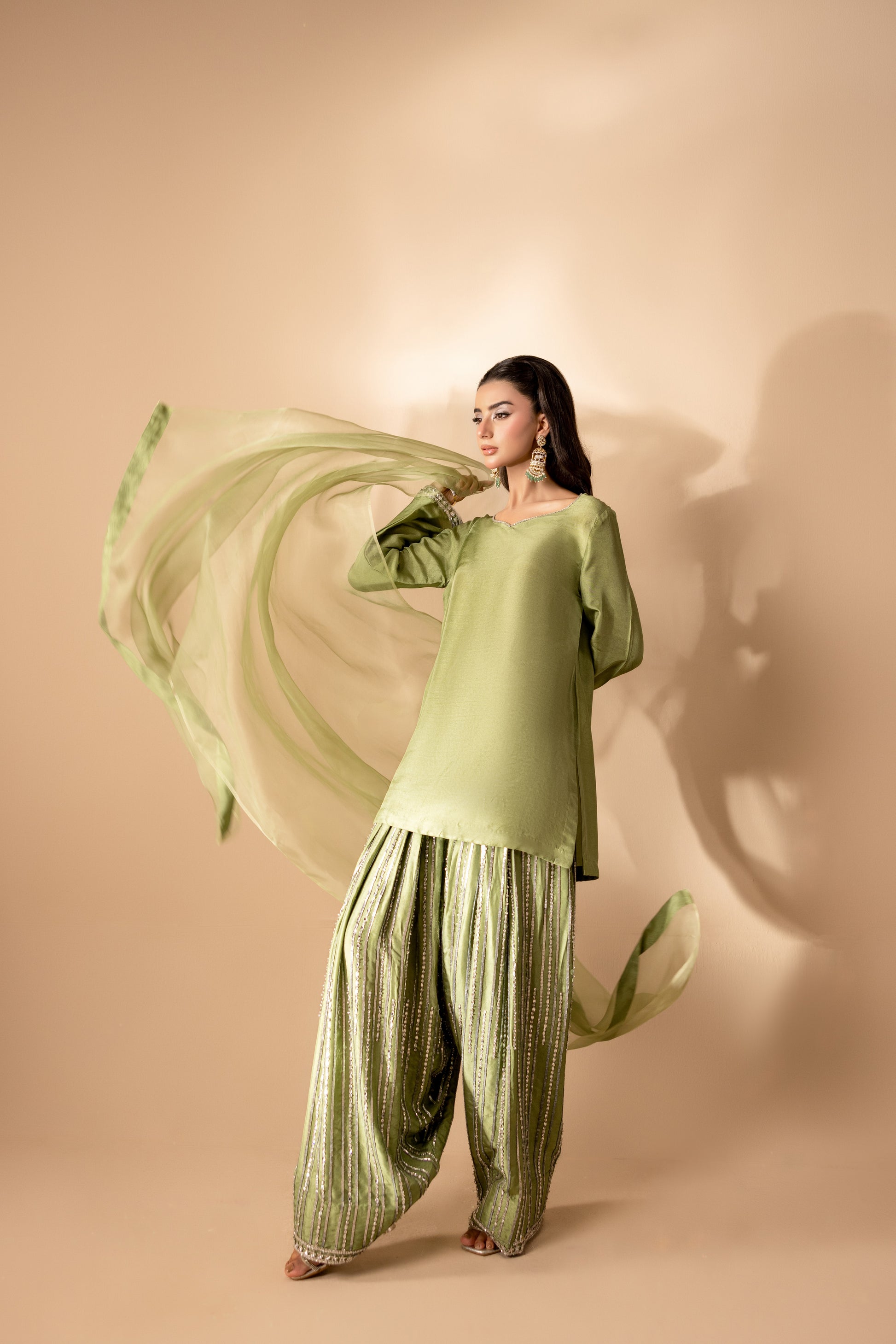 Description: Draped in a deep, enchanting olive green, Zaitoon shimmers with the celestial glow of sequins and the subtle sparkle of Swarovski crystals. The statement shalwar commands attention with quiet elegance, completing a masterpiece of craftsmanship and grace